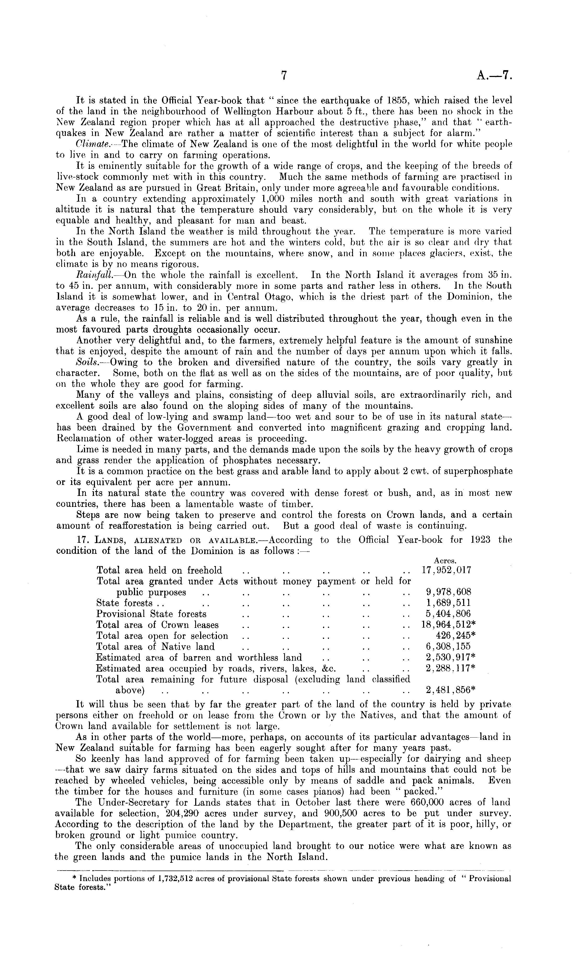 It is stated in the Official Year-book that " since the earthquake of 1855, which raised the level of the land in the neighbourhood of Wellington Harbour about 5 ft., there has been no shock in the New Zealand region proper which has at all approached the destructive phase," and that " earthquakes in New Zealand are rather a matter of scientific interest than a subject for alarm." Climate.- - The climate of New Zealand is one of the most delightful in the world for white people to live in and to carry on farming operations. It is eminently suitable for the growth of a wide range of crops, and the keeping of the breeds of live-stock commonly met with in this country. Much the same methods of farming are practised in New Zealand as are pursued in Great Britain, only under more agreeable and favourable conditions. In a country extending approximately 1,000 miles north and south with great variations in altitude it is natural that the temperature should vary considerably, but on the whole it is very equable and healthy, and pleasant for man and beast. In the North Island the weather is mild throughout the year. The temperature is more varied in the South Island, the summers are hot and the winters cold, but the air is so clear and dry that both are enjoyable. Except on the mountains, where snow, and in some places glaciers, exist, the climate is by no means rigorous. Rainfall.- On the whole the rainfall is excellent. In the North Island it averages from 35 in. to 45 in. per annum, with considerably more in some parts and rather less in others. In the South Island it is somewhat lower, and in Central Otago, which is the driest part of the Dominion, the average decreases to 15 in. to 20 in. per annum. As a rule, the rainfall is reliable and is well distributed throughout the year, though even in the most favoured parts droughts occasionally occur. Another very delightful and, to the farmers, extremely helpful feature is the amount of sunshine that is enjoyed, despite the amount of rain and the number of days per annum upon which it falls. Soils. —Owing to the broken and diversified nature of the country, the soils vary greatly in character. Some, both on the flat as well as on the sides of the mountains, are of poor quality, but on the whole they are good for farming. Many of the valleys and plains, consisting of deep alluvial soils, are extraordinarily rich, and excellent soils are also found on the sloping sides of many of the mountains. A good deal of low-lying and swamp land —too wet and sour to be of use in its natural state — has been drained by the Government and converted into magnificent grazing and cropping land. Reclamation of other water-logged areas is proceeding. Lime is needed in many parts, and the demands made upon the soils by the heavy growth of crops and grass render the application of phosphates necessary. It is a common practice on the best grass and arable land to apply about 2 cwt. of superphosphate or its equivalent per acre per annum. In its natural state the country was covered with dense forest or bush, and, as in most new countries, there has been a lamentable waste of timber. Steps are now being taken to preserve and control the forests on Crown lands, and a certain amount of reafforestation is being carried out. But a good deal of waste is continuing. 17. Lands, alienated or available. —According to the Official Year-book for 1923 the condition of the land of the Dominion is as follows :— Acres. Total area held on freehold .. .. .. .. ..17,952,017 Total area granted under Acts without money payment or held for public purposes .. . . .. .. .. . . 9, 978, 608 State forests . . . . .. .. .. .. . . 1,689,511 Provisional State forests .. .. .. .. .. 5,404,806 Total area of Crown leases .. .. .. .. .. 18,964,512* Total area open for selection .. . . .. . . . . 426,245* Total area of Native land .. .. .. .. .. 6,308,155 Estimated area of barren and worthless land .. .. .. 2,530.917* Estimated area occupied by roads, rivers, lakes, &c. .. .. 2.288.117* Total area remaining for future disposal (excluding land classified above) .. .. .. .. .. .. .. 2,481,856* It will thus be seen that by far the greater part of the land of the country is hold by private persons either on freehold or on lease from the Crown or by the Natives, and that the amount of Crown land available for settlement is not large. As in other parts of the world—more, perhaps, on accounts of its particular advantages—land in New Zealand suitable for farming has been eagerly sought after for many years past. So keenly has land approved of for farming been taken up —especially for dairying and sheep -that we saw dairy farms situated on the sides and tops of hills and mountains that could not be reached by wheeled vehicles, being accessible only by means of saddle and pack animals. Even the timber for the houses and furniture (in some cases pianos) had been " packed." The Under-Secretary for Lands states that in October last there were 660,000 acres of land available for selection, 204,290 acres under survey, and 900,500 acres to be put under survey. According to the description of the land by the Department, the greater part of it is poor, hilly, or broken ground or light pumice country. The only considerable areas of unoccupied land brought to our notice were; what are known as the green lands and the pumice lands in the North Island.