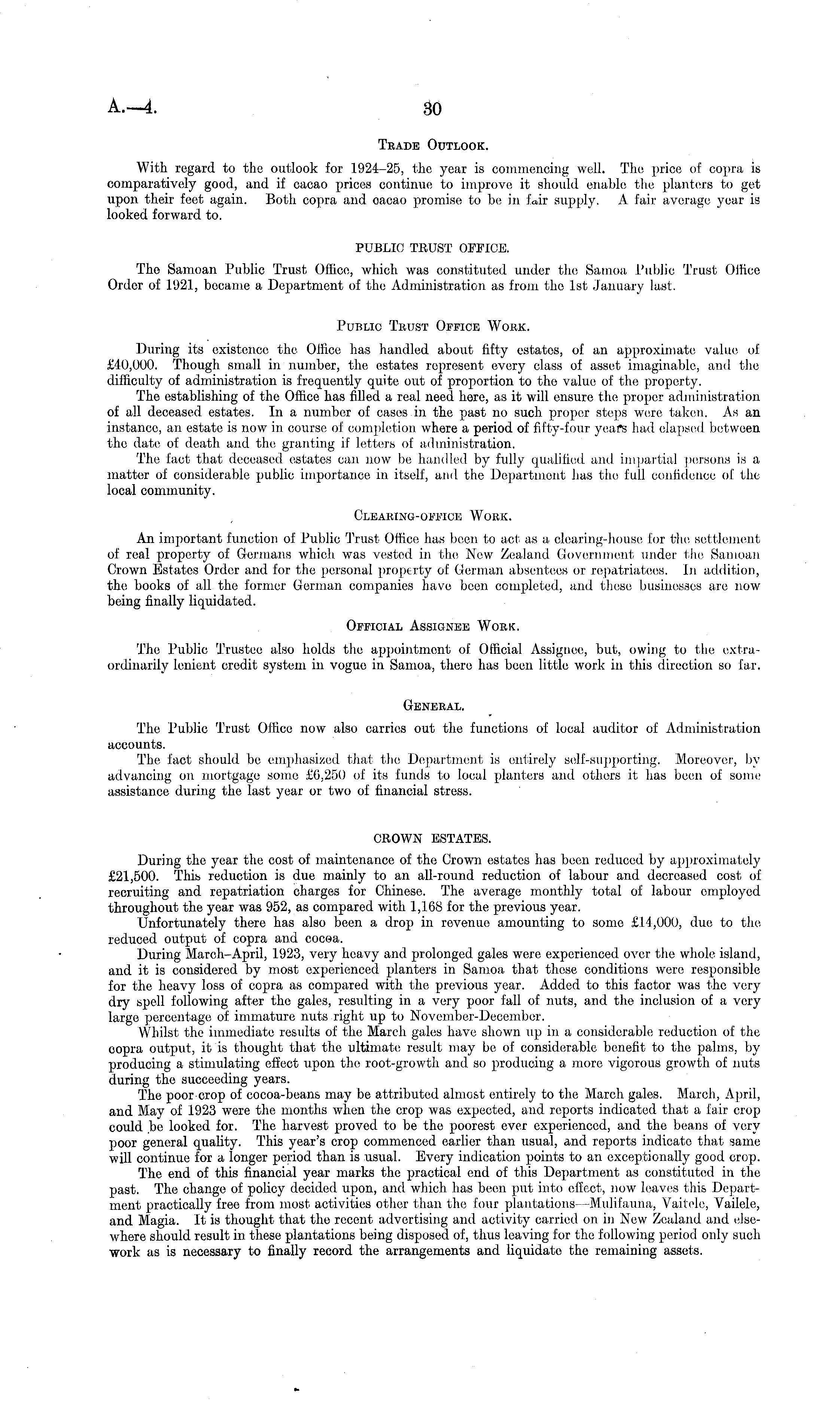 Trade Outlook. With regard to the outlook for 1924-25, the year is commencing well. The price of copra is comparatively good, and if cacao prices continue to improve it should enable the, planters to get upon their feet again. Both copra and oacao promise to be in fair supply. A fair average year is looked forward to. PUBLIC TRUST OFFICE. Tho Samoan Public Trust Office, which was constituted under the; Samoa Public Trust Office Order of 1921, became a Department of the Administration as from the Ist January last. Public Trust Office Work. During its existence the Office has handled about fifty estates, of an approximate value; of £40,000. Though small in number, the estates represent every class of asset imaginable;, and the difficulty of administration is frequently quite out of proportion to the value of the property. The establishing of the Office has filled a real need here, as it will ensure the proper administration of all deceased estates. In a number of cases in the past no such, proper steps were taken. As an instance, an estate is now in course of completion where a period of fifty-four years had elapsed between the date of death and the granting if letters of administration. The fact that deceased estates can now be handled by fully qualified and impartial persons is a matter of considerable public importance in itself, and the Department has the; full confidence of the local community. Clearing-office Work. An important function of Public Trust Office has been to act as a clearing-house lor the settlement of real property of Germans which was vested in the New Zealand Government under the Samoan Crown Estates Order and for the personal property of German absentees or repatriatees. In addition, the books of all the former German oonxpanies have been completed, and these businesses are now being finally liquidated. Official Assignee Work. The Public Trustee also holds the appointment of Official Assignee, but, owing to the extraordinarily lenient credit system in vogue in Samoa, there has been little work in this direction so far. General. The Public Trust Office now also carries out the functions of local auditor of Administration accounts. The fact should be emphasized that the Department is entirely self-supporting. Moreover, by advancing on mortgage some £6,250 of its funds to local planters and others it has been of some assistance during the last year or two of financial stress. CROWN ESTATES. During the year the cost of maintenance of the Crown estates has been reduced by approximately £21,500. This reduction is due mainly to an all-round reduction of labour and decreased cost of recruiting and repatriation charges for Chinese. The average monthly total of labour employed throughout tho year was 952, as compared with 1,168 for the previous year. Unfortunately there has also been a drop in revenue amounting to some £14,000, due to the. reduced output of copra and cocoa. During March-April, 1923, very heavy and prolonged gales were experienced over the whole; island, and it is considered by most experienced planters in Samoa that these conditions were responsible for the heavy loss of copra as compared with the previous year. Added to this factor was the very dry spell following after the gales, resulting in a very poor fall of nuts, and the inclusion of a very large percentage of immature nuts right up to November-December. Whilst the immediate results of the March gales have shown up) in a considerable reduction of the copra output, it is thought that the ultimate; result may be of considerable benefit to the palms, by producing a stimulating effect upion the root-growth and so producing a more vigorous growth of nuts during the succeeding years. The poor crop of cocoa-beans may be attributed almost entirely to the March gales. March, April, and May of 1923 were the months when the crop was expected, and reports indicated that a fair crop could be looked for. The harvest proved to be the poorest ever experienced, and the beans of very poor general quality. This year's crop commenced earlier than usual, and reports indicate that same will continue for a longer period than is usual. Every indication points to an exceptionally good crop. The end of this financial year marks the practical end of this Department as constituted in the past. The change of policy decided upon, and which has been put into effect, now leaves this Department practically free from most activities other than the four plantations —Mulifauna, Vaitele, Vailele, and Magia. It is thought that the recent advertising and activity carried on in New Zealand and elsewhere should result in these plantations being disposed of, thus leaving for the following period only such work as is necessary to finally record the arrangements and liquidate the remaining assets.