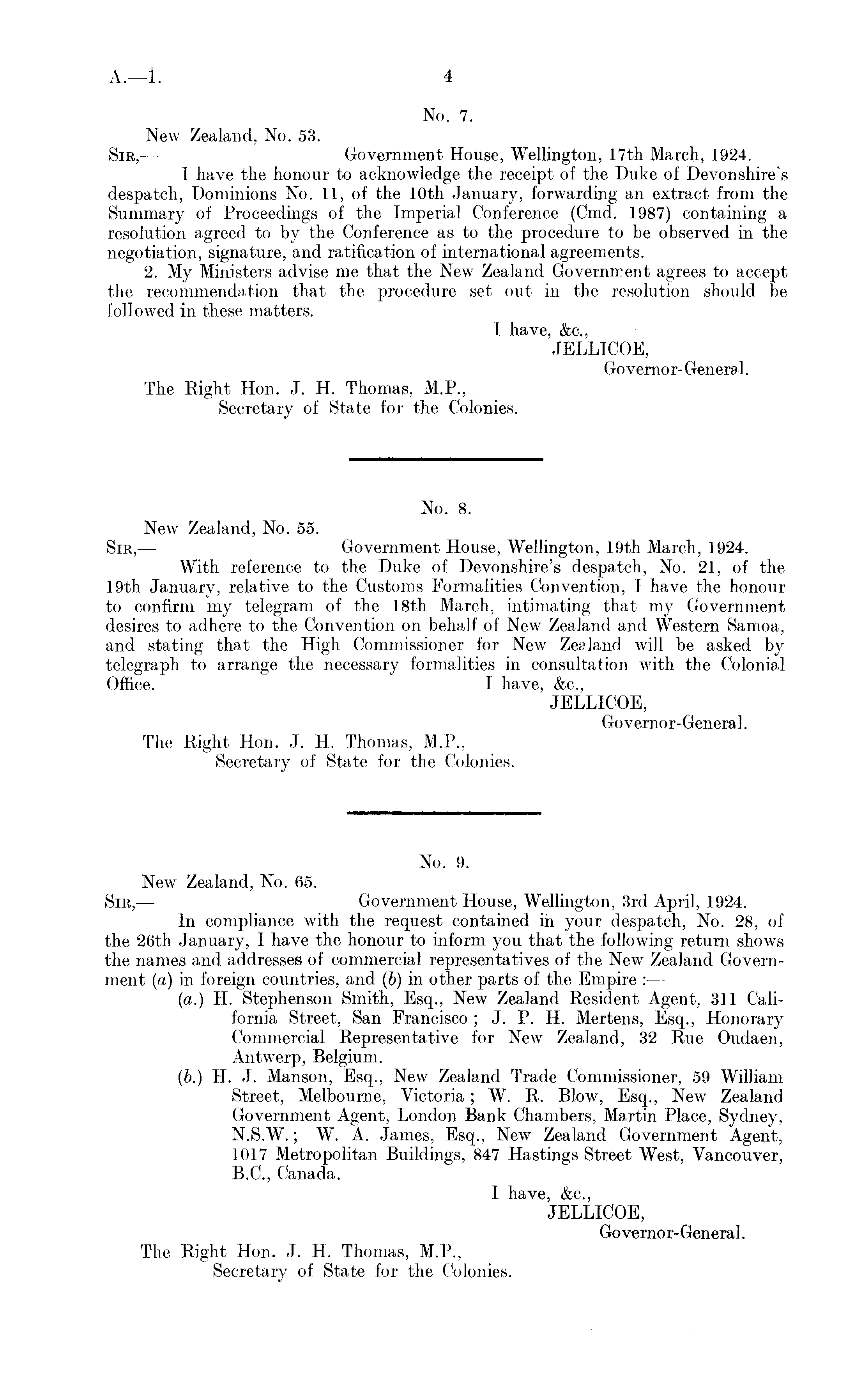 No. 9. New Zealand, No. 65. Sir, — Government House, Wellington, 3rd April, 1924. In compliance with the request contained in your despatch, No. 28, of the 26th January, I have the honour to inform you that the following return shows the names and addresses of commercial representatives of the New Zealand Government (a) in foreign countries, and (6) in other parts of the Empire : — (a.) H. Stephenson Smith, Esq., New Zealand Resident Agent, 311 California Street, San Francisco ; J. P. H. Mertens, Esq., Honorary Commercial Representative for New Zealand, 32 Rue Oudaen, Antwerp, Belgium. (b.) H. J. Manson, Esq., New Zealand Trade Commissioner, 59 William Street, Melbourne, Victoria ; W. R. Blow, Esq., New Zealand Government Agent, London Bank Chambers, Martin Place, Sydney, N.S.W.; W. A. James, Esq., New Zealand Government Agent, 1017 Metropolitan Buildings, 847 Hastings Street West, Vancouver, 8.C., Canada. I have, &c., JELLICOE, Governor-General. The Right Hon. J. H. Thomas, M.P., Secretary of State for the Colonies.