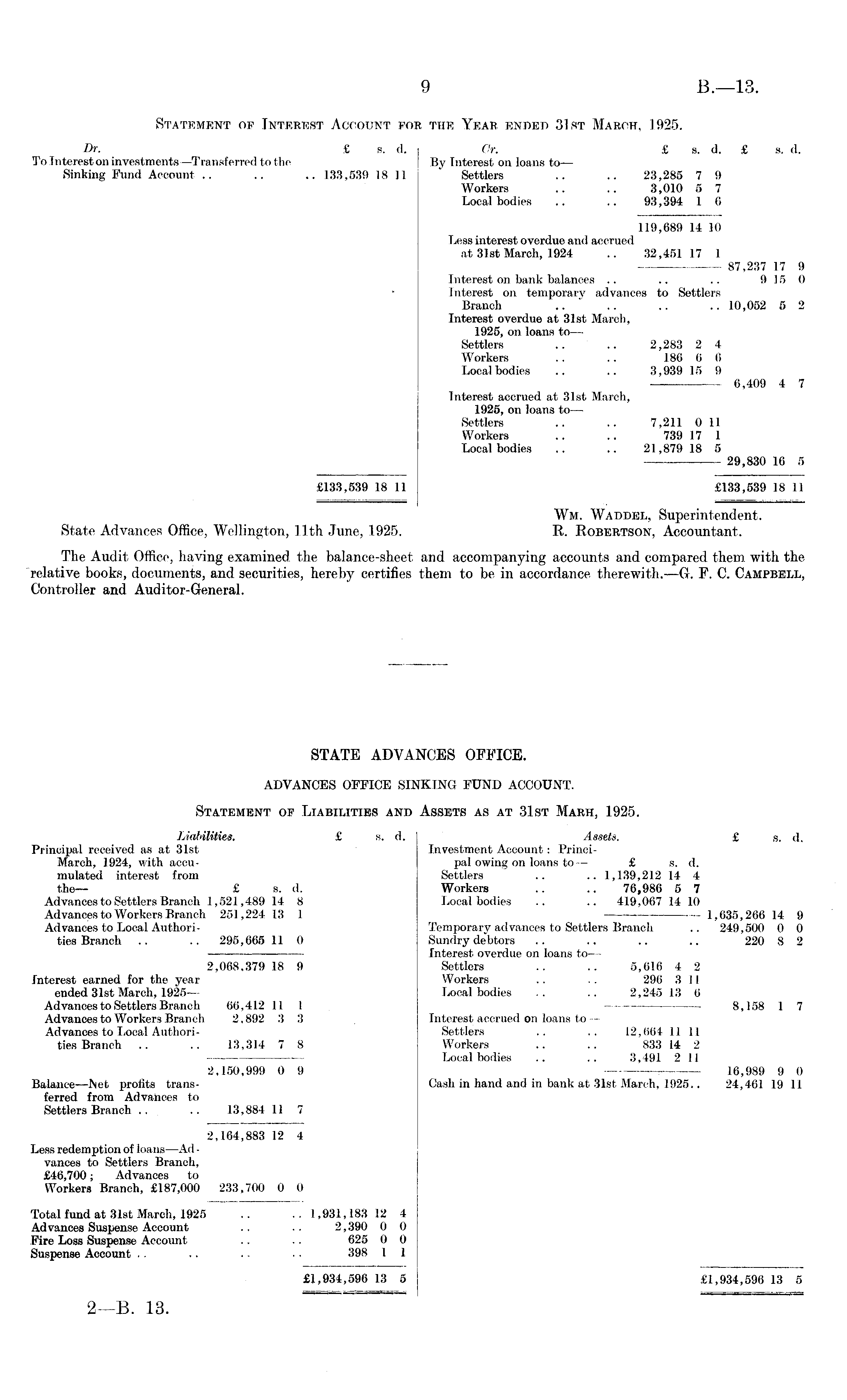 Statement of Interest Account for, the Year ended 31st March, 1925. Dr. £ s. d. Cr. £ s. d. £ s. d. To Interest on investments—Transferred to the By Interest on loans to— Sinking Fund Account .. .. .. 133,539 18 11 Settlers .. .. 23,285 7 9 Workers .. .. 3,010 5 7 Local bodies .. .. 93,394 1 6 119,689 14 10 Less interest overdue and accrued at 31st March, 1924 .. 32,451 17 1 87,237 17 9 Interest on bank balances .. .. .. 9 15 0 Interest on temporary advances to Settlers Branch .. .. .. .. 10,052 5 2 Interest overdue at 31st March, 1925, on loans to— Settlers .. .. 2,283 2 4 Workers .. .. 186 6 6 Local bodies .. .. 3,939 15 9 6,409 4 7 Interest accrued at 31st March, 1925, on loans to— Settlers .. .. 7,211 0 11 Workers .. .. 739 17 1 Local bodies .. .. 21,879 18 5 29,830 16 5 £133,539 18 11 £133,539 18 11 Wm. Waddel, Superintendent. State Advances Office, Wellington, 11th June, 1925. R. Robertson, Accountant. The Audit Office, having examined the balance-sheet and accompanying accounts and compared them, with the relative books, documents, and securities, hereby certifies them to be in accordance therewith.—G. F. C. Campbell, Controller and Auditor-General. STATE ADVANCES OFFICE. ADVANCES OFFICE SINKING FUND ACCOUNT. Statement of Liabilities and Assets as at 31st Marh, 1925. Liabilities. £ s. d. Assets. £ s. d. Principal received as at 31st Investment Account: PrinciMarch, 1924, with accu- pal owing on loans to — £ s. d. mulated interest from Settlers .. .. 1,139,212 14 4 the— £ s. d. Workers .. .. 76,986 5 7 Advances to Settlers Branch 1,521,489 14 8 Local bodies .. .. 419,067 14 10 Advances to Workers Branch 251,224 13 1 1,635,266 14 9 Advances to Local Authori- Temporary advances to Settlers Branch .. 249,500 0 0 ties Branch .. .. 295,665 11 0 Sundry debtors .. .. .. .. 220 8 2 Interest overdue on loans to — 2,068,379 18 9 Settlers .. .. 5,616 4 2 Interest earned for the year Workers .. .. 296 3 11 ended 31st March, 1925 — Local bodies .. .. 2,245 13 6 Advances to Settlers Branch 66,412 11 1 8,158 1 7 Advances to Workers Branch 2,892 3 3 Interest accrued on loans to— Advances to Local Authori- Settlers .. .. 12,664 11 11 ties Branch .. .. 13,314 7 8 Workers .. .. 833 14 2 — Local bodies .. .. 3,491 2 11 2,150,999 0 9 16,989 9 0 Balance —ftet profits trans- Cash in hand and in bank at 31st March, 1925.. 24,461 19 11 ferred from Advances to Settlers Branch .. .. 13,884 11 7 2,164,883 12 4 Less redemption of loans —Ad - vances to Settlers Branch, £46,700; Advances to Workers Branch, £187,000 233,700 0 0 Total fund at 31st March, 1925 .. . . 1,931,183 12 4 Advances Suspense Account .. .. 2,390 0 0 Fire Loss Suspense Account .. . . 625 0 0 Suspense Account .. .. . ■ • • 398 I 1 £1,934,596 13 5 £1,934,596 13 5