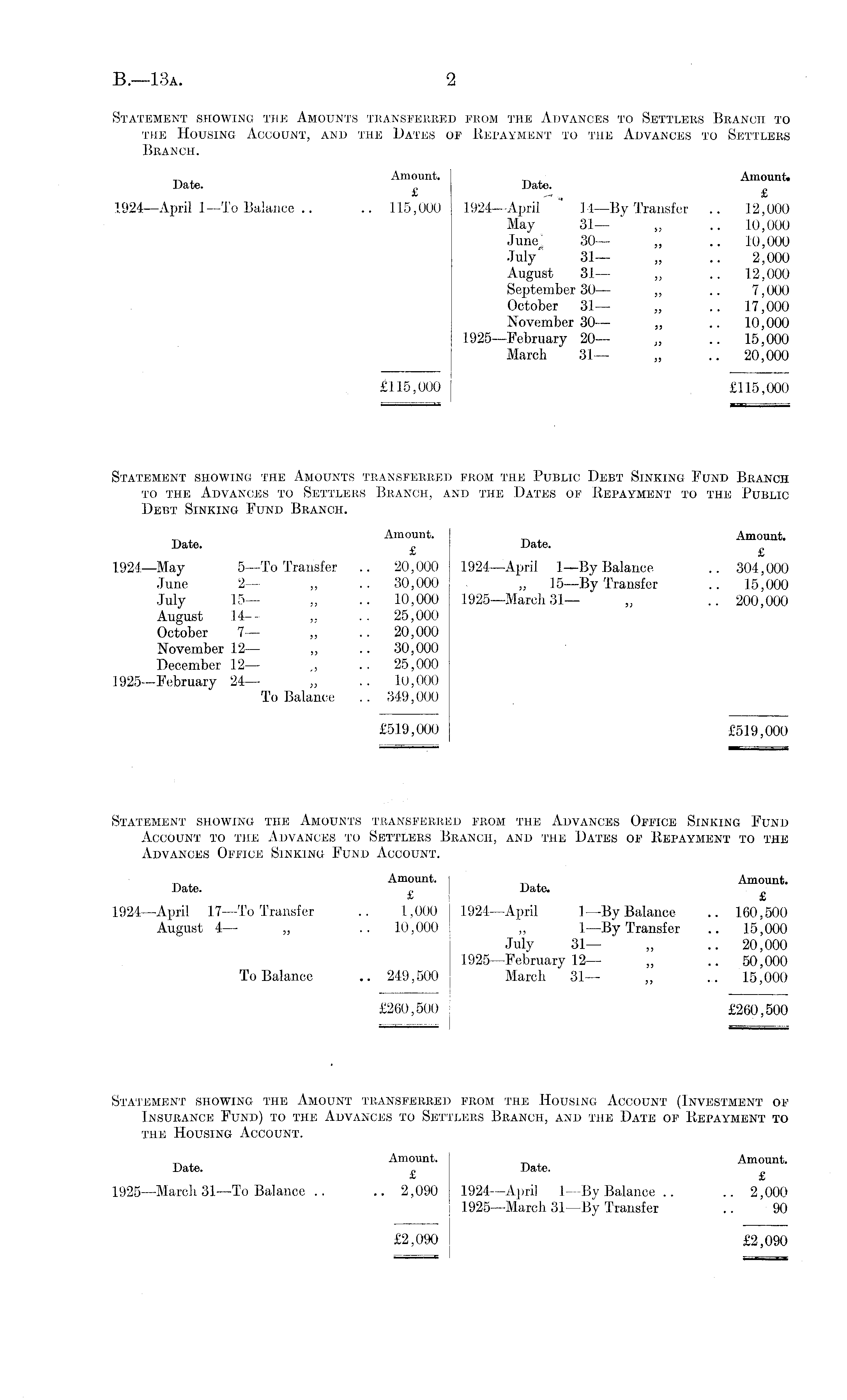 Statement showing the Amounts transferred from the Advances to Settlers Branch to the Housing Account, and the Dates of Repayment to the Advances to Settlers Branch. _ , Amount. Amount. Bate. Date. 1924 —April I—To1 —To Balance .. .. 115,000 1924 —April 11 —By Transfer .. 12,000 May 31— „ .. 10,000 Junej 30— „ .. 10,000 July 31— „ .. 2,000 August 31— „ .. 12,000 September 30— „ .. 7,000 October 31 — „ .. 17,000 November 30 — ~ .. 10,000 1925—February 20— „ .. 15,000 March 31— „ .. 20,000 £115,000 £115,000 Statement showing the Amounts transferred from the Public Debt Sinking Fund Branch to the Advances to Settlers Branch, and the Dates of Repayment to the Public Debt Sinking Fund Branch. Amount. Amount. Date. Date. 1924 —May s—To Transfer .. 20,000 1924—April ]—By Balance .. 304,000 June 2 — „ .. 30,000 , „ 15 —By Transfer .. 15,000 July 15— „ .. 10,000 1925—March 31— „ .. 200,000 August 14— ~ .. 25,000 October 7— ~ .. 20,000 November 12— ~ .. 30,000 December 12— ~ .. 25,000 1925 —February 24— „ .. 10,000 To Balance .. 349,000 £519,000 £519,000 Statement showing the Amounts transferred from the Advances Office Sinking Fund Account to the Advances to Settlers Branch, and the Dates of Repayment to the Advances Office Sinking Fund Account. Amount. Amount. Date. „ Date. X a. 1924 —April 17 —To Transfer .. 1,000 1924 —April I—By Balance .. 160,500 August 4 — „ .. 10,000 ~ I—By Transfer .. 15,000 July 31— „ .. 20,000 1925 —February 12—■ „ .. 50,000 To Balance .. 249,500 March 31— ~ ... 15,000 £260,500 £260,500 Statement showing the Amount transferred from the Housing Account (Investment of Insurance Fund) to the Advances to Settlers Branch, and the Date of Repayment to the Housing Account. , Amount. Amount. Date. „ Date. £> X 1925 —March 31 —To Balance .. .. 2,090 1924 —April I—By1—By Balance .. .. 2,000 1925 —March 31 —By Transfer .. 90 £2,090 £2,090