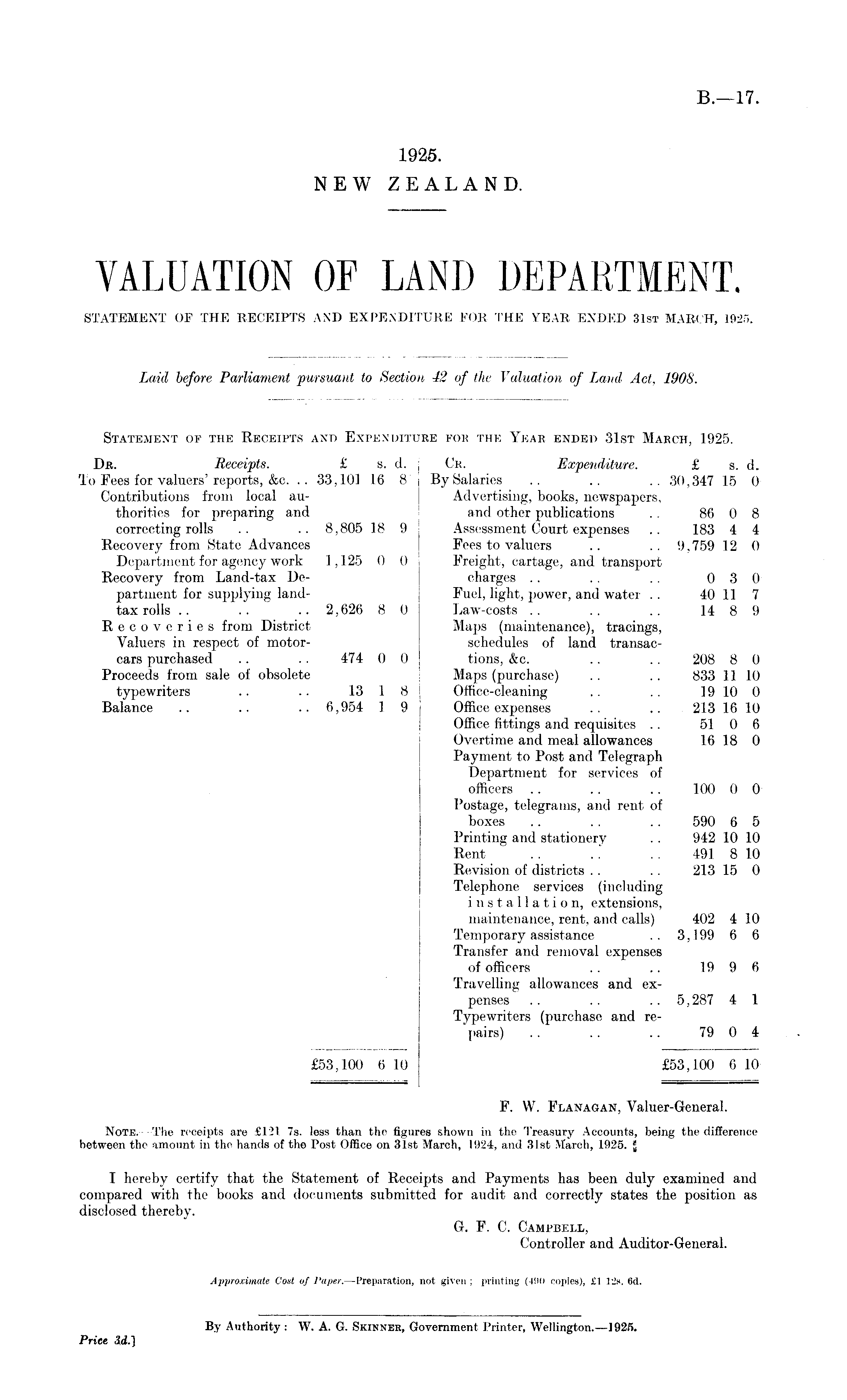Statement of the Receipts and Expenditure fob the Year ended 31st March, 1925. Dr. Receipts. £ s. d. j Cr. Expenditure. £ s. d. To Fees for valuers'reports, &c. .. 33,101 16 8* JBy Salaries .. .. .. 30,347 15 0 Contributions from local au- j Advertising, books, newspapers, thorities for preparing and j and other publications . . 86 0 8 correcting rolls .. .. 8,805 18 9 Assessment Court expenses .. 183 4 4 Recovery from State Advances Fees to valuers .. .. 9,759 12 0 Department for agency work 1,125 0 0 Freight, cartage, and transport Recovery from Land-tax De- charges .. . . . . 0 3 0 partment for supplying land- Fuel, light, power, and water .. 40 11 7 tax rolls .. .. .. 2,626 8 0 Law-costs .. .. .. 14 8 9 Recoveries from District Maps (maintenance), tracings, Valuers in respect of motor- schedules of land transaccars purchased .. .. 474 0 0 tions, &c. .. .. 208 8 0 Proceeds from sale of obsolete Maps (purchase) .. .. 833 11 10 typewriters .. .. 13 1 8 j Office-cleaning .. .. 19 10 0 Balance .. .. .. 6,954 1 9 Office expenses .. .. 213 16 10 Office fittings and requisites .. 51 0 6 Overtime and meal allowances 16 18 0 Payment to Post and Telegraph Department for services of officers .. .. .. 100 0 0 Postage, telegrams, and rent of boxes .. .. .. 590 6 5 Printing and stationery .. 942 10 10 Rent .. ... 491 8 10 Revision of districts .. .. 213 15 0 Telephone services (including installation, extensions, maintenance, rent, and calls) 402 4 10 Temporary assistance . . 3,199 6 6 Transfer and removal expenses of officers .. .. 19 9 6 Travelling allowances and expenses .. .. .. 5,287 4 1 Typewriters (purchase and repairs) .. .. .. 79 0 4 £53,100 6 10 £53,100 6 10 F. W. Flanagan, Valuer-General. Note. The receipts are £121 7s. less than the figures shown in the Treasury Accounts, being the difference between the amount in the hands of the Post Office on 31st March, 1924, and 31st March, 1925. j I hereby certify that the Statement of Receipts and Payments has been duly examined and compared with the books and documents submitted for audit and correctly states the position as disclosed thereby. O. F. C. Campbell, Controller and Auditor-General.