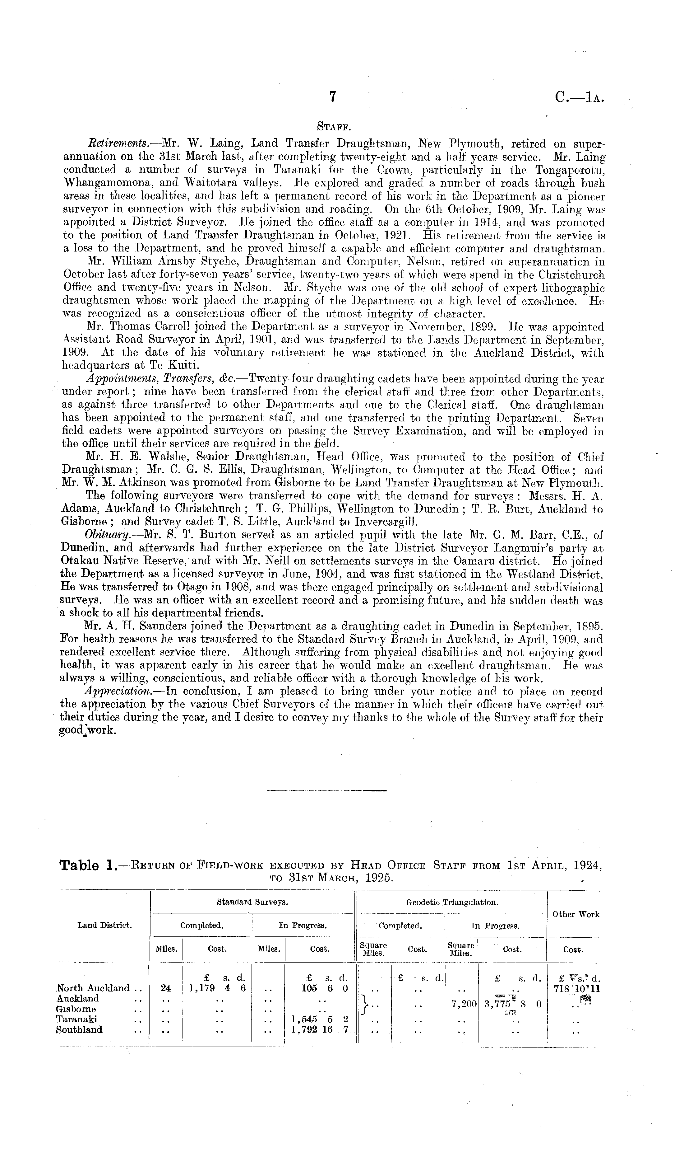 Staff. Retirements.- —Mr. W. Laing, Land Transfer Draughtsman, New Plymouth, retired on superannuation on the 31st March last, after completing twenty-eight and a half years service. Mr. Laing conducted a number of surveys in Taranaki for the Crown, particularly in the Tongaporotu, Whangamomona, and Waitotara valleys. He explored and graded a number of roads through bush areas in these localities, and has left a permanent record of his work in the Department as a pioneer surveyor in connection with this subdivision and roading. On the 6th October, 1909, Mr. Laing was appointed a District Surveyor. He joined the office staff as a computer in 1914, and. was promoted to the position of Land Transfer Draughtsman in October, 1921. His retirement from the service is a loss to the Department, and he proved himself a capable and efficient computer and draughtsman. Mr. William Arnsby Styche, Draughtsman and Computer, Nelson, retired on superannuation in October last after forty-seven years' service, twenty-two years of which were spend in the Christchurch Office and twenty-five years in Nelson. Mr. Styche was one of the old school of expert lithographic draughtsmen whose work placed the mapping of the Department on a high level of excellence. He was recognized as a conscientious officer of the utmost integrity of character. Mr. Thomas Carroll joined the Department as a surveyor in November, 1899. He was appointed Assistant Road Surveyor in April, 1901, and was transferred to the Lands Department in September, 1909. At the date of his voluntary retirement he was stationed in the Auckland District, with headquarters at Te Kuiti. Appointments, Transfers, &c. —Twenty-four draughting cadets have been appointed during the year under report; nine have been transferred from the clerical staff and three from other Departments, as against three transferred to other Departments and one to the Clerical staff. One draughtsman has been appointed to the permanent staff, and one transferred to the printing Department. Seven field cadets were appointed surveyors on passing the Survey Examination, and will be employed in the office until their services are required in the field. Mr. H. E. Walshe, Senior Draughtsman, Head Office, was promoted to the position of Chief Draughtsman; Mr. C. G. S. Ellis, Draughtsman, Wellington, to Computer at the Head Office; and Mr. W. M. Atkinson was promoted from Gisborne to be Land Transfer Draughtsman at New Plymouth. The following surveyors were transferred to cope with the demand for surveys : Messrs. H. A. Adams, Auckland to Christchurch ; T. G. Phillips, Wellington to Dunedin ; T. R. Burt, Auckland to Gisborne ; and Survey cadet T. S. Little, Auckland to Invercargill. Obituary.—Mr. S. T. Burton served as an articled pupil with the late Mr. G. M. Barr, C.E., of Dunedin, and afterwards had further experience on the late District Surveyor Langmuir's party at Otakau Native Reserve, and with Mr. Neill on settlements surveys in the Oamaru district. He joined the Department as a licensed surveyor in June, 1904, and was first stationed in the Westland District. He was transferred to Otago in 1908, and was there engaged principally on settlement and subdivisional surveys. He was an officer with an excellent record and a promising future, and his sudden death was a shock to all his departmental friends. Mr. A. H. Saunders joined the Department as a draughting cadet in Dunedin in September, 1895. For health reasons he was transferred to the Standard Survey Branch in Auckland, in April, 1909, and rendered excellent service there. Although suffering from physical disabilities and not enjoying good health, it was apparent early in his career that he would make an excellent draughtsman. He was always a willing, conscientious, and reliable officer with a thorough knowledge of his work. Appreciation.—ln conclusion, I am pleased to bring under your notice and to place on record the appreciation by the various Chief Surveyors of the manner in which their officers have carried out their duties during the year, and I desire to convey my thanks to the whole of the Survey staff for their good Vork.