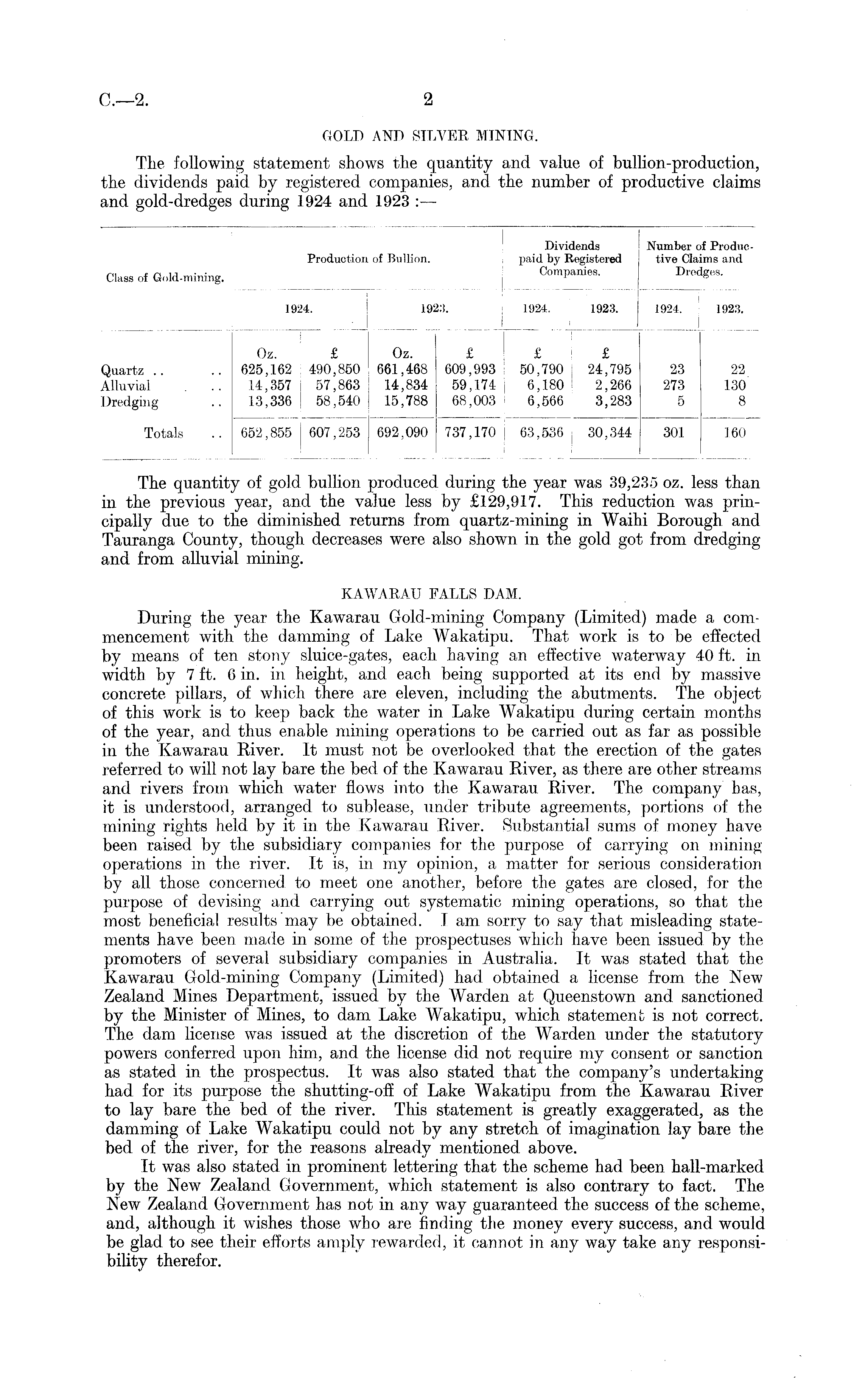 The quantity of gold bullion produced during the year was 39,235 oz. less than in the previous year, and the value less by £129,917. This reduction was principally due to the diminished returns from quartz-mining in Waihi Borough and Tauranga County, though decreases were also shown in the gold got from dredging and from alluvial mining. KAWARAU FALLS DAM. During the year the Kawarau Gold-mining Company (Limited) made a commencement with the damming of Lake Wakatipu. That work is to be effected by means of ten stony sluice-gates, each having an effective waterway 40 ft. in width by 7 ft. 6 in. in height, and eacli being supported at its end by massive concrete pillars, of which there are eleven, including the abutments. The object of this work is to keep back the water in Lake Wakatipu during certain months of the year, and thus enable mining operations to be carried out as far as possible in the Kawarau River. It must not be overlooked that the erection of the gates referred to will not lay bare the bed of the Kawarau River, as there are other streams and rivers from which water flows into the Kawarau River. The company has, it is understood, arranged to sublease, under tribute agreements, portions of the mining rights held by it in the Kawarau River. Substantial sums of money have been raised by the subsidiary companies for the purpose of carrying on mining operations in the river. It is, in my opinion, a matter for serious consideration by all those concerned to meet one another, before the gates are closed, for the purpose of devising and carrying out systematic mining operations, so that the most beneficial results may be obtained. lam sorry to say that misleading statements have been made in some of the prospectuses which have been issued by the promoters of several subsidiary companies in Australia. It was stated that the Kawarau Gold-mining Company (Limited) had obtained a license from the New Zealand Mines Department, issued by the Warden at Queenstown and sanctioned by the Minister of Mines, to dam Lake Wakatipu, which statement is not correct. The dam license was issued at the discretion of the Warden under the statutory powers conferred upon him, and the license did not require my consent or sanction as stated in the prospectus. It was also stated that the company's undertaking had for its purpose the shutting-off of Lake Wakatipu from the Kawarau River to lay bare the bed of the river. This statement is greatly exaggerated, as the damming of Lake Wakatipu could not by any stretch of imagination lay bare the bed of the river, for the reasons already mentioned above. It was also stated in prominent lettering that the scheme had been hall-marked by the New Zealand Government, which statement is also contrary to fact. The New Zealand Government has not in any way guaranteed the success of the scheme, and, although it wishes those who are finding the money every success, and would be glad to see their efforts amply rewarded, it cannot in any way take any responsibility therefor.