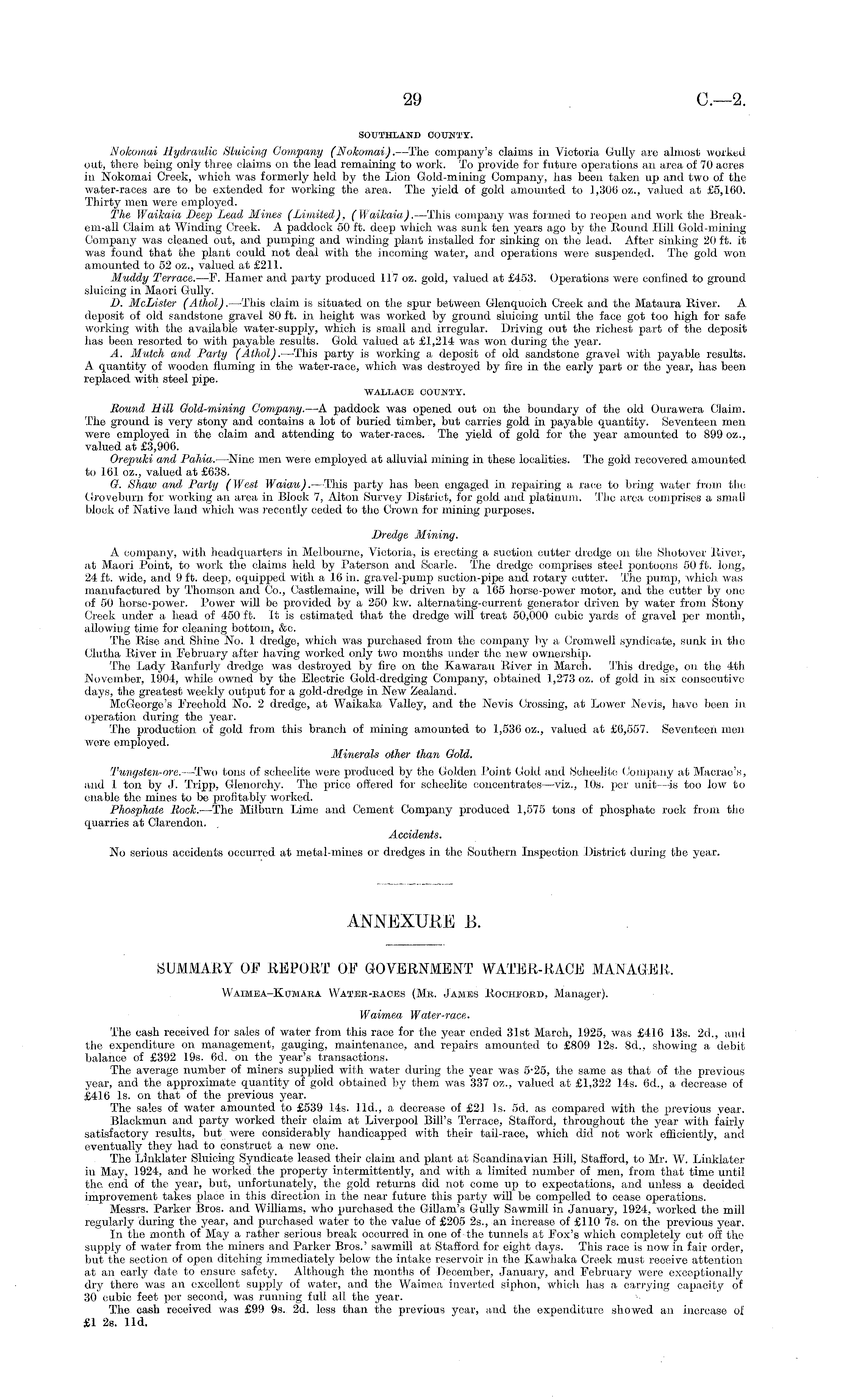 SUMMARY OF REPORT OF GOVERNMENT WATER-RACE MANAGER. Waimea-Kumaea Watee-eaces (Mr. Jambs Rochfoed, Manager). Waimea Water-race. The cash received for sales of water from this race for the year ended 31st March, 1925, was £416 13s. 2d., and the expenditure on management, gauging, maintenance, and repairs amounted to £809 12s. Bd., showing a debit balance of £392 19s. 6d. 011 the year's transactions. The average number of miners supplied with water during the year was 5-25, the same as that of the previous year, and the approximate quantity of gold obtained by them was 337 oz., valued at £1,322 14s. 6d., a decrease of £416 Is. on that of the previous year. The sales of water amounted to £539 14s. lid., a decrease of £21 Is. sd. as compared with the previous year. Blackmun and party worked their claim at Liverpool Bill's Terrace, Stafford, throughout the year with fairly satisfactory results, but were considerably handicapped with their tail-race, which did not work efficiently, and eventually they liad to construct a new one. The Linklater Sluicing Syndicate leased their claim and plant at Scandinavian Hill, Stafford, to Mr. W. Linklater in May, 1924, and he worked the property intermittently, and with a limited number of men, from that time until the end of the year, but, unfortunately, the gold returns did not come up to expectations, and unless a decided improvement takes place in this direction in the near future this party will be compelled to cease operations. Messrs. Parker Bros, and Williams, who purchased the Gillam's Gully Sawmill in January, 1924, worked the mill regularly during the year, and purchased water to the value of £205 25., an increase of £110 7s. on the previous year. In the month of May a rather serious break occurred in one of the tunnels at Fox's which completely cut off the supply of water from the miners and Parker Bros.' sawmill at Stafford for eight days. This race is now in fair order, but the section of open ditching immediately below the intake reservoir in the Kawhaka Creek must receive attention at an early date to ensure safety. Although the months of December, January, and February were exceptionally dry there was an excellent supply of water, and the Waimea inverted siphon, which has a carrying capacity of 30 cubic feet per second, was running full all the year. The cash received was £99 9s. 2d. less than the previous year, and the expenditure showed an increase of £1 2s. lid.