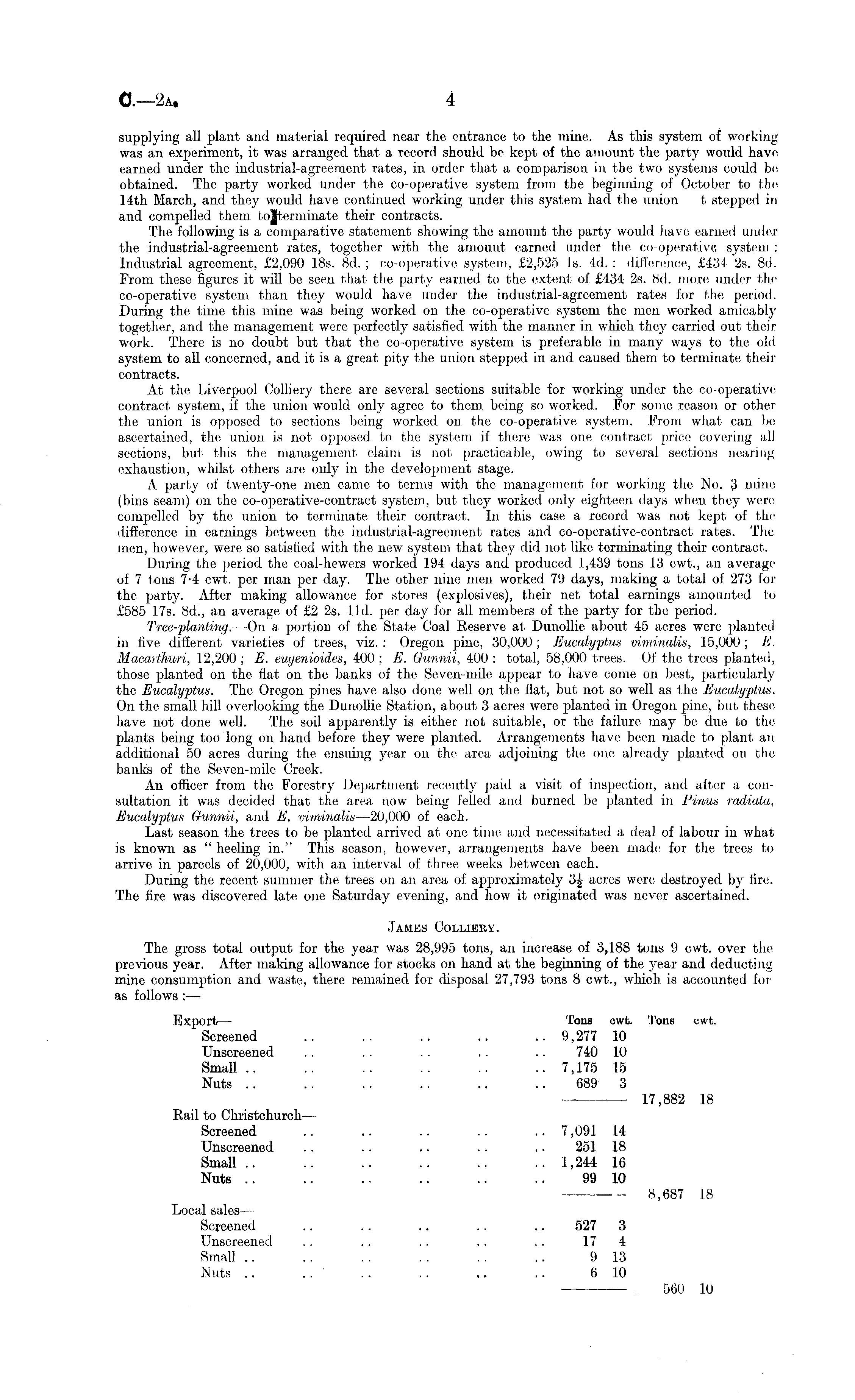 supplying all plant and material required near the entrance to the mine. As this system of working was an experiment, it was arranged that a record should be kept of the amount the party would have earned under the industrial-agreement rates, in order that a comparison in the two systems could be obtained. The party worked under the co-operative system from the beginning of October to the 14th March, and they would have continued working under this system had the union t stepped in and compelled them, tojterminate their contracts. The following is a comparative statement showing the amount the party would have earned under the industrial-agreement rates, together with the amount earned under the co-operative system : Industrial agreement, £2,090 18s. Bd. ; co-operative system, £2,525 Is. 4d. : difference, £434 2s. Bd. From these figures it will be seen that the party earned to the extent of £434 2s. Bd. more under the co-operative system than they would have under the industrial-agreement rates for the period. During the time this mine was being worked on the co-operative system the men worked amicably together, and the management were perfectly satisfied with the manner in which they carried out their work. There is no doubt but that the co-operative system is preferable in many ways to the old system to all concerned, and it is a great pity the union stepped in and caused them to terminate their contracts. At the Liverpool Colliery there are several sections suitable for working under the co-operative contract system, if the union would only agree to them being so worked. For some reason or other the union is opposed to sections being worked on the co-operative system. From what can be ascertained, the union is not opposed to the system if there was one contract price covering all sections, but this the management claim is not practicable, owing to several sections nearing exhaustion, whilst others are only in the development stage. A party of twenty-one men came to terms with the management for working the No. 3 mine (bins seam) on the co-operative-contract system, but they worked only eighteen days when they were compelled by the union to terminate their contract. In this case a record was not kept of the difference in earnings between the industrial-agreement rates and co-operative-contract rates. The men, however, were so satisfied with the new system that they did not like terminating their contract. During the period the coal-hewers worked 194 days and produced 1,439 tons 13 cwt., an average of 7 tons 7-4 cwt. per man per day. The other nine men worked 79 days, making a total of 273 for the party. After making allowance for stores (explosives), their net total earnings amounted to £585 17s. Bd., an average of £2 2s. lid. per day for all members of the party for the period. Tree-planting. —On a portion of the State Coal Reserve at Dunollie about 45 acres were planted in five different varieties of trees, viz. : Oregon pine, 30,000 ; Eucalyptus viminalis, ] 5,000; E. Macarthuri, 12,200 ; E. euyenioides, 400 ; E. Gunnii, 400 : total, 58,000 trees. Of the trees planted, those planted on the flat on the banks of the Seven-mile appear to have come on best, particularly the Eucalyptus. The Oregon pines have also done well on the fiat, but not so well as the Eucalyptus. On the small hill overlooking the Dunollie Station, about 3 acres were planted in Oregon pine, but these have not done well. The soil apparently is either not suitable, or the failure may be due to the plants being too long on hand before they were planted. Arrangements have been made to plant an additional 50 acres during the ensuing year on the area adjoining the one already planted on the banks of the Seven-mile Creek. An officer from the Forestry Department recently paid a visit of inspection, and after a consultation it was decided that the area now being felled and burned be planted in Pinus radiatu, Eucalyptus Gunnii, and E. viminalis —20,000 of each. Last season the trees to be planted arrived at one time and necessitated a deal of labour in what is known as " heeling in." This season, however, arrangements have been made for the trees to arrive in parcels of 20,000, with an interval of three weeks between each. During the recent summer the trees on an area of approximately 3| acres were destroyed by fire. The fire was discovered late one Saturday evening, and how it originated was never ascertained. James Collieky. The gross total output for the year was 28,995 tons, an increase of 3,188 tons 9 cwt. over the previous year. After making allowance for stocks on hand at the beginning of the year and deducting mine consumption and waste, there remained for disposal 27,793 tons 8 cwt., which is accounted for as follows :— Export — Tons cwt. Tons cwt. Screened .. .. .. .. .. 9,277 10 Unscreened .. .. .. .. .. 740 10 Small .. .. .. .. .. .. 7,175 15 Nuts .. .. .. .. .. .. 689 3 17,882 18 Rail to Christchurch — Screened .. .. .. .. .. 7,091 14 Unscreened .. .. .. .. .. 251 18 Small .. .. .. .. .. .. 1,244 16 Nuts .. .. .. .. .. .. 99 10 8,687 18 Local sales — Screened .. .. .. .. .. 527 3 Unscreened .. .. .. .. .. 17 4 Small .. .. .. .. .. .. 9 13 Nuts .. .. .. .. .. .. 6 10 —— 560 10