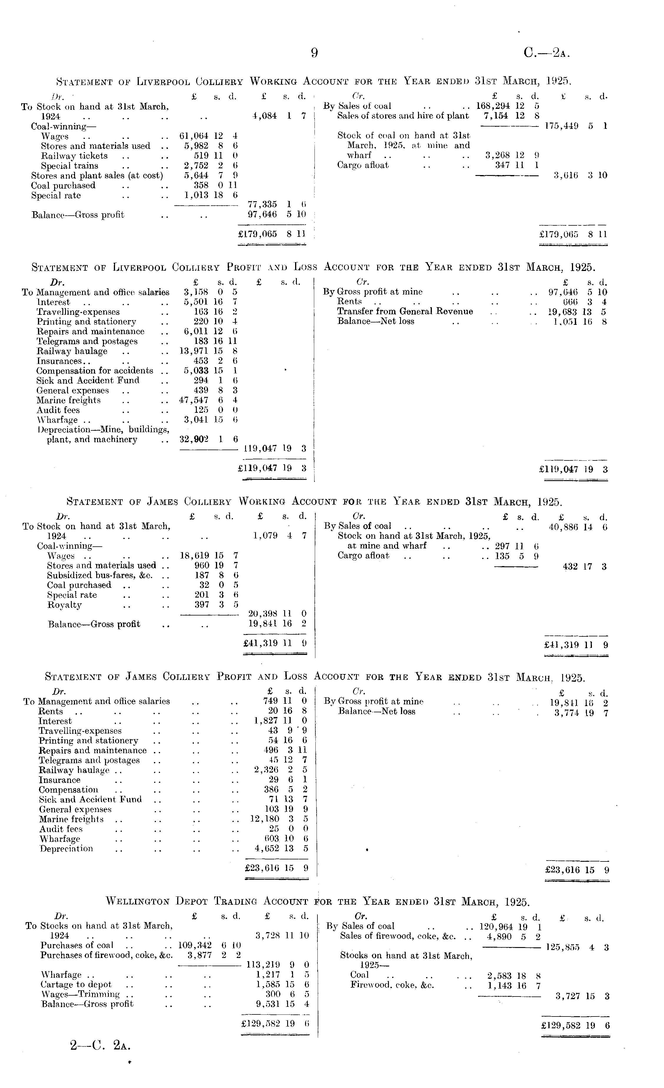 Statement of Liverpool Colliery Working Account for the Year ended 31st March, 1925. Dr., £ s. d. £ s. d. Cr. £ s. d. £ s. d. To Stock on hand at 31st March, \ By Sales of coal .. .. 168,294 12 5 1924 .. .. .. .. 4,084 1 7 Sales of stores and hire of plant 7,154 12 8 Coal-winning— 175,449 5 1 Wages .. .. .. 61,064 12 4 Stock of coal on hand at 31st Stores and materials used .. 5,982 8 6 March, 1925, at mine and Railway tickets .. .. 519 11 0 wharf .. .. .. 3,268 12 9 Special trains .. .. 2,752 2 6 Cargo afloat .. .. 347 11 1 Stores and plant sales (at cost) 5,644 7 9 3,616 3 10 Coal purchased .. .. 358 0 11 Special rate .. .. 1,013 18 6 77,335 1 6 Balance —Gross profit .. .. 97,646 5 10 £179,065 8 1] £179,065 8 11 Statement of Liverpool Colliery Profit and Loss Account for the Year ended 31st March, 1925. Dr. £ s. d. £ s. d. I Cr. £ s. d. To Management and office salaries 3,158 0 5 By Gross profit at mine .. .. .. 97,646 510 Interest .. .. .. 5,501 16 7 ] Rents .. .. .. .. .. 666 3 4 Travelling-expenses .. 163 16 2 Transfer from General Revenue .. 19,683 13 5 Printing and stationery .. 220 10 4 Balance—Net loss .. .. 1,051 16 8 Repairs and maintenance .. 6,011 12 6 Telegrams and postages .. 183 16 11 Railway haulage .. .. 13,971 15 8 Insurances.. .. .. 453 2 6 Compensation for accidents .. 5,033 15 1 Sick and Accident Fund .. 294 1 6 General expenses .. .. 439 8 3 Marine freights .. 47,547 6 4 Audit fees .. .. 125 0 0 Wharfage .. .. .. 3,041 15 6 Depreciation—Mine, buildings, plant, and machinery .. 32,902 1 6 119,047 19 3 £119,047 19 3 £119,047 19 3 ===== | =a Statement of James Colliery Working Account for the Year ended 31st March, 1925. Dr. £ s. d. £ s. d. Cr. £ s. d. £ s. d. To Stock on hand at 31st March, By Sales of coal .. .. .. .. 40,886 14 6 1924 .. .. .. .. 1,079 4 7 Stock on hand at 31st March, 1925, Coal-winning— at mine and wharf .. ..297 11 6 Wages .. .. .. 18,619 15 7 Cargo afloat .. .. .. 135 5 9 Stores and materials used .. 960 19 7 432 17 3 Subsidized bus-fares, &c. . . 187 8 6 Coal purchased .. .. 32 0 5 Special rate .. .. 201 3 6 Royalty .. .. 397 3 5 20,398 11 0 Balance —Gross profit .. .. 19,841162 £41,319 11 9 £41,319 11 9 Statement of James Colliery Profit and Loss Account for the Year ended 31st March. 1925. Dr. £ s. d. Cr. £ s . <}. To Management and office salaries .. .. 749 11 0 By Gross profit at mine .. 19,811 16 2 Rents .. .. .. .. .. 20 16 8 Balance—Net loss .. .. 3,774 19 7 Interest .. .. .. .. 1,827110 Travelling-expenses .. .. .. 43 9 9 Printing and stationery .. .. .. 54 16 6 Repairs and maintenance .. .. .. 496 3 11 | Telegrams and postages .. .. .. 45 12 7 j Railway haulage .. .. .. .. 2,32625| Insurance .. .. .. .. 29 6 1 | Compensation .. .. .. .. 386 5 2 Sick and Accident Fund .. .. .. 71 13 7 j General expenses .. .. .. 103 19 9 Marine freights .. .. .. .. 12,180 3 5 Audit fees .. .. .. .. 25 0 0 Wharfage .. .. .. .. 603, 10 6 Depreciation .. .. .. .. 4,652 13 5 . £23,616 15 9 £23,616 15 9 Wellington Depot Trading Account for the Year ended 31st March, 1925. Dr. £ s. d. £ s. d. Cr. £ g. 4. £. s . d. To Stocks on hand at 31st March, : By Sales of coal .. .. 120,964 19 1 1924 .. .. .. .. 3,728 11 10 Sales of firewood, coke, &c. .. 4,890 5 2 Purchases of coal .. .. 109,342 610 125,855 4 3 Purchases of firewood, coke, &e. 3,877 2 2 Stocks on hand at 31st March, 113,219 9 0 1925— Wharfage .. .. .. .. 1,217 1 5 Coal .. .. ... 2,583 18 8 Cartage to depot .. .. .. 1,585 15 6 Firewood, coke, &c. .. 1,143 16 7 Wages—Trimming .. .. .. 300 6 5 3 > 727 15 3 Balance—Gross profit .. .. 9,531 15 4 £129,582 19 6 £129,582 19 6