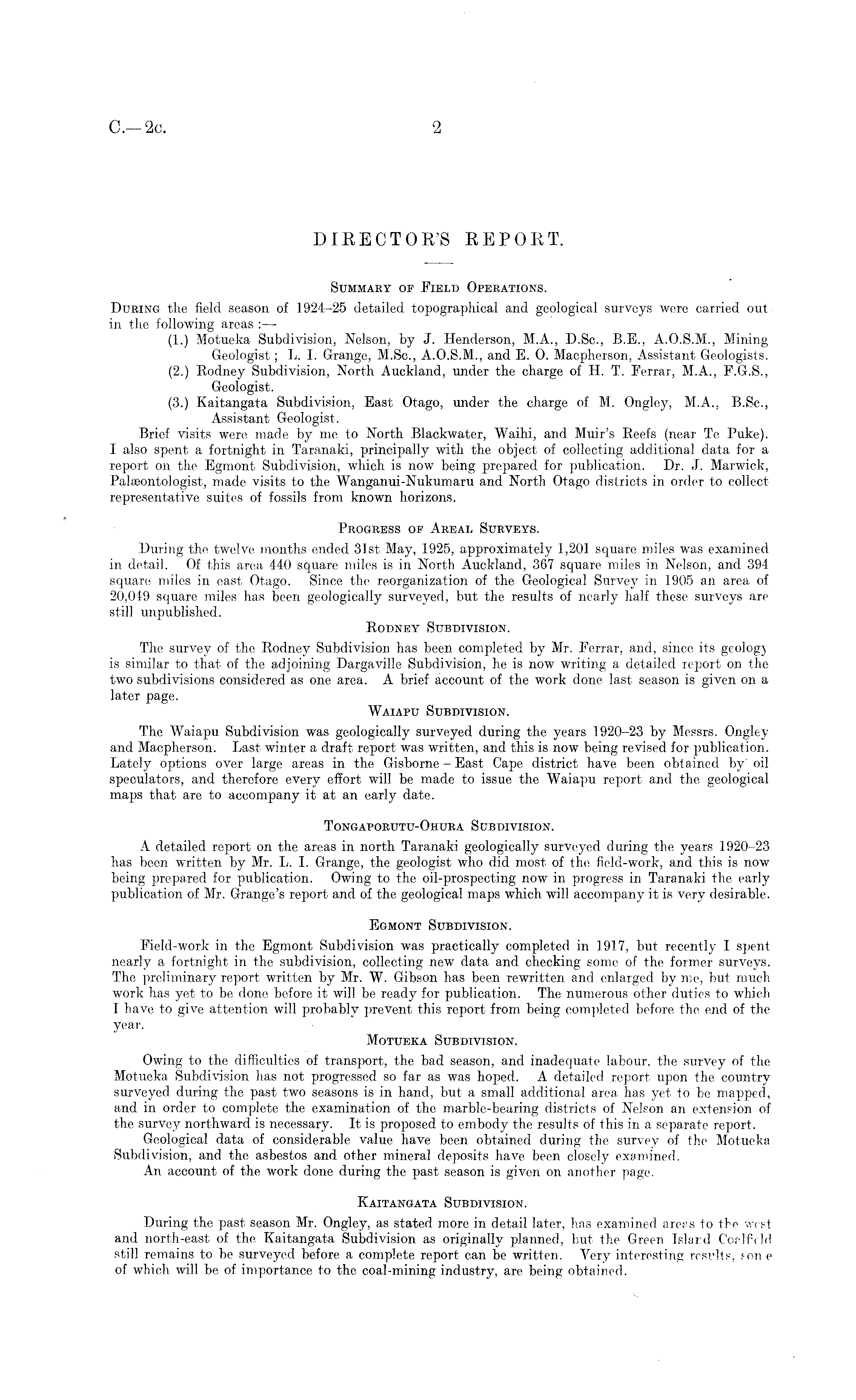 DIRECTOR'S REPORT. Summary of Field Operations. During the field season of 1924r-25 detailed topographical and geological surveys were carried out in the following areas : — (1.) Motueka Subdivision, Nelson, by J. Henderson, M.A., D.Sc., 8.E., A.0.5.M., Mining Geologist; L. I. Grange, M.Sc., A.0.5.M., and E. 0. Macpherson, Assistant Geologists. (2.) Eodney Subdivision, North Auckland, under the charge of H. T. Ferrar, M.A., F.G.S., Geologist. (3.) Kaitangata Subdivision, East Otago, under the charge of M. Ongley, M.A., B.Sc., Assistant Geologist. Brief visits were made by me to North Blackwater, Waihi, and Muir's Reefs (near Te Puke). I also spent a fortnight in Taranaki, principally with the object of collecting additional data for a report on the Egmont Subdivision, which is now being prepared for publication. Dr. J. Marwick, Palaeontologist, made visits to the Wanganui-Nukumaru and North Otago districts in order to collect representative suites of fossils from known horizons. Progress of Areal Surveys. During the twelve months ended 31st May, 1925, approximately 1,201 square miles was examined in detail. Of this area 440 square miles is in North Auckland, 367 square miles in Nelson, and 394 square miles in east Otago. Since the reorganization of the Geological Survey in 1905 an area of 20,049 square miles has been geologically surveyed, but the results of nearly half these surveys are still unpublished. Rodney Subdivision. The survey of the Rodney Subdivision has been completed by Mr. Ferrar, and, since its geologj is similar to that of the adjoining Dargaville Subdivision, he is now writing a detailed report on the two subdivisions considered as one area. A brief account of the work done last season is given on a later page. Waiapu Subdivision. The Waiapu Subdivision was geologically surveyed during the years 1920-23 by Messrs. Ongley and Macpherson. Last winter a draft report was written, and this is now being revised for publication. Lately options over large areas in the Gisborne - East Cape district have been obtained by oil speculators, and therefore every effort will be made to issue the Waiapu report and the geological maps that are to accompany it at an early date. Tongaporutu-Ohura Subdivision. A detailed report on the areas in north Taranaki geologically surveyed during the years 1920-23 has been written by Mr. L. I. Grange, the geologist who did most of the field-work, and this is now being prepared for publication. Owing to the oil-prospecting now in progress in Taranaki the early publication of Mr. Grange's report and of the geological maps which will accompany it is very desirable. Egmont Subdivision. Field-work in the Egmont Subdivision was practically completed in 1917, but recently I spent nearly a fortnight in the subdivision, collecting new data and checking some of the former surveys. The preliminary report written by Mr. W. Gibson has been rewritten and enlarged by me, but much work has yet to be done before it will be ready for publication. The numerous other duties to which I have to give attention will probably prevent this report from being completed before the end of the year. Motueka Subdivision. Owing to the difficulties of transport, the bad season, and inadequate labour, the survey of the Motueka Subdivision has not progressed so far as was hoped. A detailed report upon the country surveyed during the past two seasons is in hand, but a small additional area has yet to be mapped, and in order to complete the examination of the marble-bearing districts of Nelson an extension of the survey northward is necessary. It is proposed to embody the results of this in a separate report. Geological data of considerable value have been obtained during the survey of the Motueka Subdivision, and the asbestos and other mineral deposits have been closely examined. An account of the work done during the past season is given on another page. Kaitangata Subdivision. During the past season Mr. Ongley, as stated more in detail later, has examined aress to the west and north-east of the Kaitangata Subdivision as originally planned, but the Green Island Cop Iff Id still remains to be surveyed before a complete report can be written. Very interesting results, pone of which will be of importance to the coal-mining industry, are being obtained.
