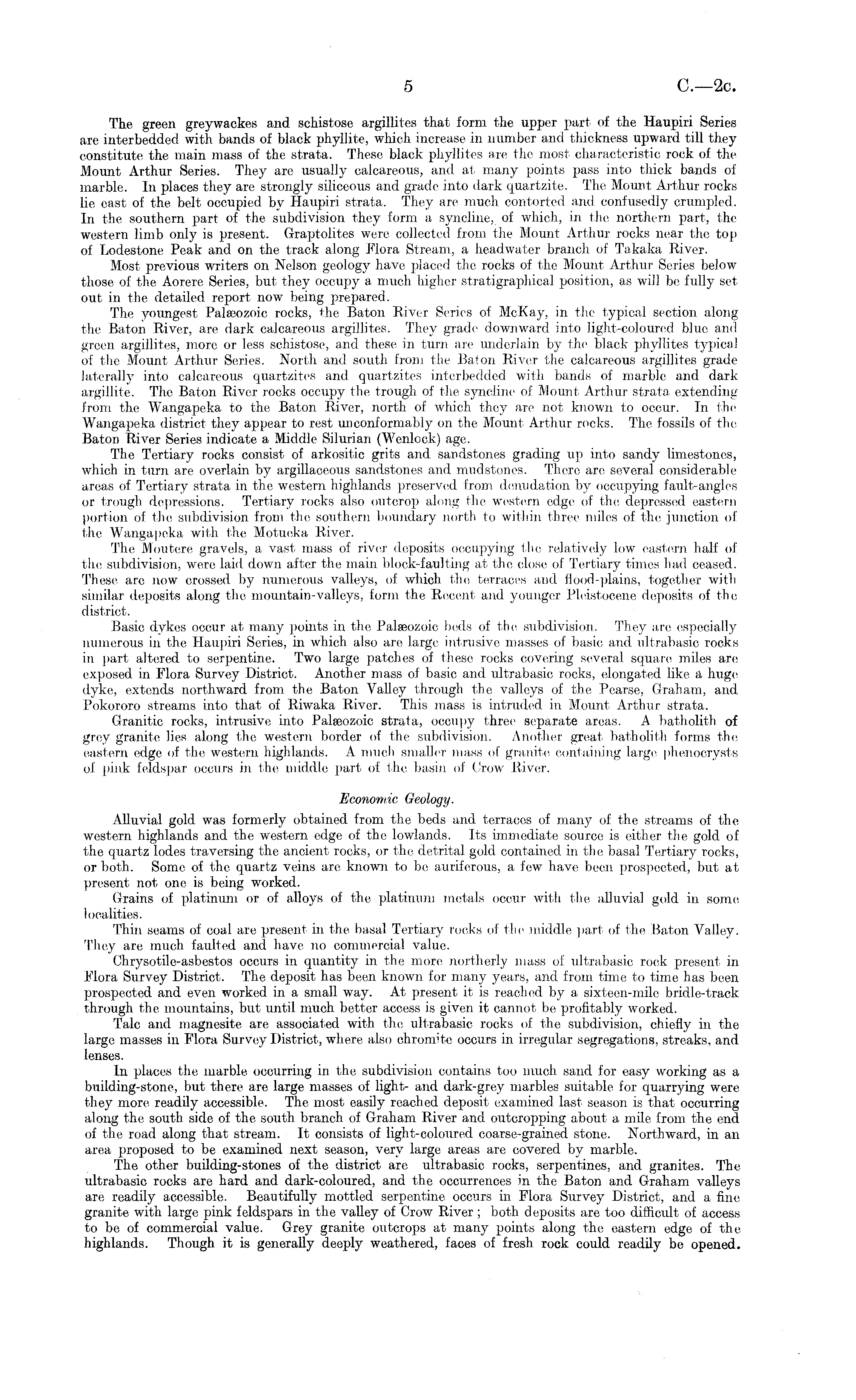 The green greywackes and schistose argillites that form the upper part of the Haupiri Series are interbedded with bands of black phyllite, which increase in number and thickness upward till they constitute the main mass of the strata. These black phyllites are the most characteristic rock of the Mount Arthur Series. They are usually calcareous, and at many points pass into thick bands of marble. In places they are strongly siliceous and grade into dark quartzite. The Mount Arthur rocks lie east of the belt occupied by Haupiri strata. They are much contorted and confusedly crumpled. In the southern part of the subdivision they form a syncline, of which, in the northern part, the western limb only is present. Graptolites were collected from the Mount Arthur rocks near the top of Lodestone Peak and on the track along Flora Stream, a headwater branch of Takaka River. Most previous writers on Nelson geology have placed the rocks of the Mount Arthur Series below those of the Aorere Series, but they occupy a much higher stratigraphical position, as will be fully set out in the detailed report now being prepared. The youngest Palseozoic rocks, the Baton River Series of McKay, in the typical section along the Baton River, are dark calcareous argillites. They grade downward into light-coloured blue and green argillites, more or less schistose, and these in turn are underlain by the black phyllites typical of the Mount Arthur Series. North and south from the Baton River the calcareous argillites grade laterally into calcareous quartzites and quartzites interbedded with bands of marble and dark argillite. The Baton River rocks occupy the trough of the syncline of Mount Arthur strata extending from the Wangapeka to the Baton River, north of which they are not known to occur. In the Wangapeka district they appear to rest unconformably on the Mount Arthur rocks. The fossils of the Baton River Series indicate a Middle Silurian (Wenlock) age. The Tertiary rocks consist of arkositic grits and sandstones grading up into sandy limestones, which in turn are overlain by argillaceous sandstones and mudstones. There are several considerable areas of Tertiary strata in the western highlands preserved from denudation by occupying fault-angles or trough depressions. Tertiary rocks also outcrop along the western edge of the depressed eastern portion of the subdivision from the southern boundary north to within three miles of the junction of the Wangapeka with the Motueka River. The Moutere gravels, a vast mass of river deposits occupying the relatively low eastern half of the subdivision, were laid down after the main block-faulting at the close of Tertiary times had ceased. These are now crossed by numerous valleys, of which the terraces and flood-plains, together with similar deposits along the mountain-valleys, form the Recent and younger Pleistocene deposits of the district. Basic dykes occur at many points in the Palseozoic beds of the subdivision. They are especially numerous in the Haupiri Series, in which also are large intrusive masses of basic and ultrabasic rocks in part altered to serpentine. Two large patches of these rocks covering several square miles are exposed in Flora Survey District. Another mass of basic and ultrabasic rocks, elongated like a huge dyke, extends northward from the Baton Valley through the valleys of the Pearse, Graham, and Pokororo streams into that of Riwaka River. This mass is intruded in Mount Arthur strata. Granitic rocks, intrusive into Palseozoic strata, occupy three separate areas. A batholith of grey granite lies along the western border of the subdivision. Another great batholith forms the eastern edge of the western highlands. A much smaller mass of granite containing large phenocrysts of pink feldspar occurs in the middle part of the basin of Crow River. Economic Geology. Alluvial gold was formerly obtained from the beds and terraces of many of the streams of the western highlands and the western edge of the lowlands. Its immediate source is either the gold of the quartz lodes traversing the ancient rocks, or the detrital gold contained in the basal Tertiary rocks, or both. Some of the quartz veins are known to be auriferous, a few have been prospected, but at present not one is being worked. Grains of platinum or of alloys of the platinum metals occur with the alluvial gold in some localities. Thin seams of coal are present in the basal Tertiary rocks of the middle part of the Baton Valley. They are much faulted and have no commercial value. Chrysotile-asbestos occurs in quantity in the more northerly mass of ultrabasic rock present in Flora Survey District. The deposit has been known for many years, and from time to time has been prospected and even worked in a small way. At present it is reached by a sixteen-mile bridle-track through the mountains, but until much better access is given it cannot be profitably worked. Talc and magnesite are associated with the ultrabasic rocks of the subdivision, chiefly in the large masses in Flora Survey District, where also chromite occurs in irregular segregations, streaks, and lenses. In places the marble occurring in the subdivision contains too much sand for easy working as a building-stone, but there are large masses of light- and dark-grey marbles suitable for quarrying were they more readily accessible. The most easily reached deposit examined last season is that occurring along the south side of the south branch of Graham River and outcropping about a mile from the end of the road along that stream. It consists of light-coloured coarse-grained stone. Northward, in an area proposed to be examined next season, very large areas are covered by marble. The other building-stones of the district are ultrabasic rocks, serpentines, and granites. The ultrabasic rocks are hard and dark-coloured, and the occurrences in the Baton and Graham valleys are readily accessible. Beautifully mottled serpentine occurs in Flora Survey District,