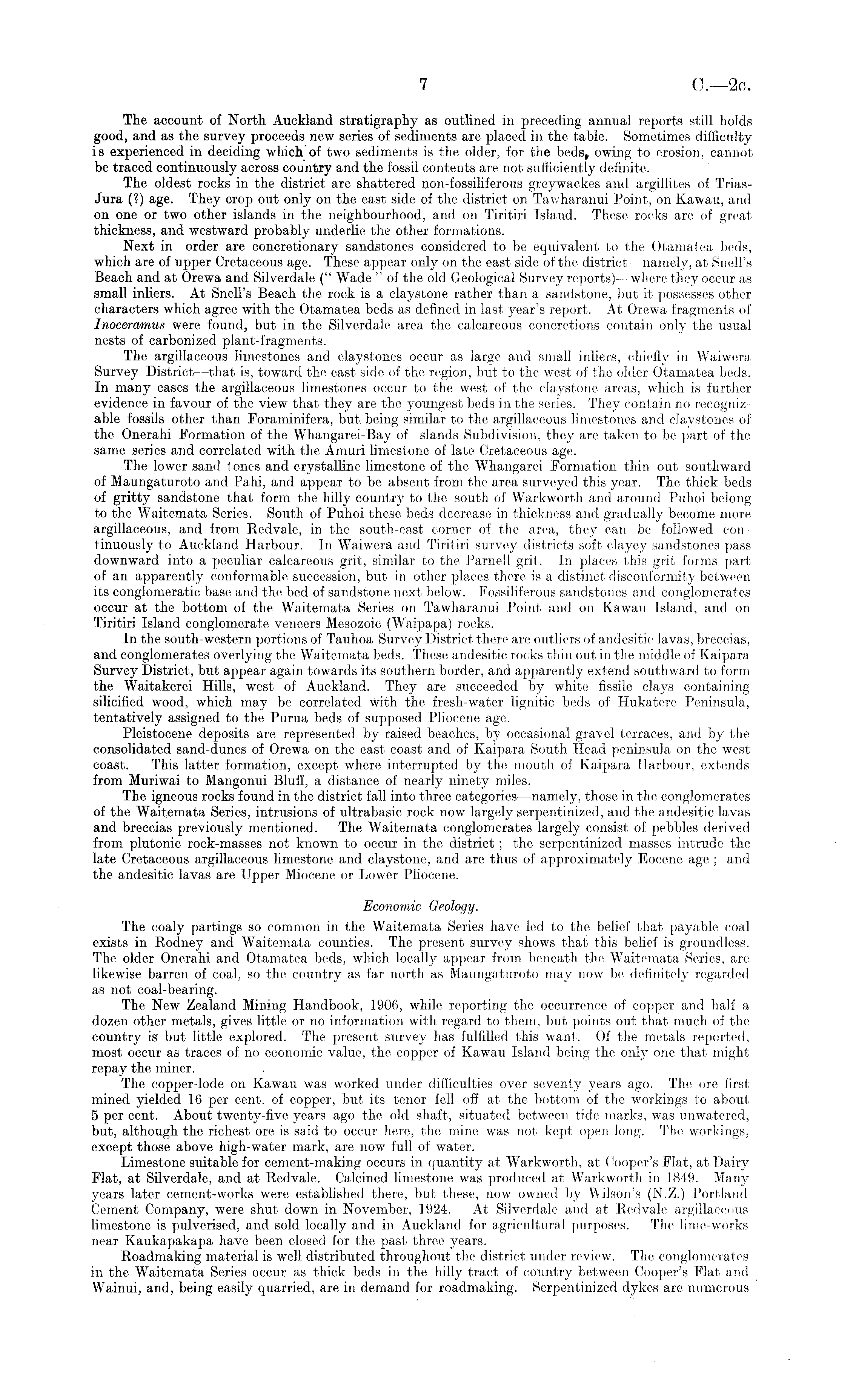 The account of North Auckland stratigraphy as outlined in preceding annual reports still holds good, and as the survey proceeds new series of sediments are placed in the table. Sometimes difficulty is experienced in deciding which of two sediments is the older, for the beds, owing to erosion, cannot be traced continuously across country and the fossil contents are not sufficiently definite. The oldest rocks in the district are shattered non-fossiliferous greywackes and argillites of TriasJura (?) age. They crop out only on the east side of the district on Tawharanui Point, on Kawau, and on one or two other islands in the neighbourhood, and on Tiritiri Island. These rocks are of great thickness, and westward probably underlie the other formations. Next in order are concretionary sandstones considered to be equivalent to the Otamatea beds, which are of upper Cretaceous age. These appear only on the east side of the district namely, at Snell's Beach and at Orewa and Silverdale (" Wade " of the old Geological Survey reports)- where they occur as small inliers. At Snell's Beach the rock is a claystone rather than a sandstone, but it possesses other characters which agree with the Otamatea beds as defined in last year's report. At Orewa fragments of Tnoceramus were found, but in the Silverdale area the calcareous concretions contain only the usual nests of carbonized plant-fragments. The argillaceous limestones and claystones occur as large and small inliers, chiefly in Waiwera Survey District —that is, toward the east side of the region, but to the west of the older Otamatea beds. In many cases the argillaceous limestones occur to the west of the claystone areas, which is further evidence in favour of the view that they are the youngest beds in the series. They contain no recognizable fossils other than Foraminifera, but being similar to the argillaceous limestones and claystones of the Onerahi Formation of the Whangarei-Bay of slands Subdivision, they are taken to be part of the same series and correlated with the Amuri limestone of late Cretaceous age. The lower sand 1 ones and crystalline limestone of the Whangarei Formation thin out southward of Maungaturoto and Pahi, and appear to be absent from the area surveyed this year. The thick beds of gritty sandstone that form the hilly country to the south of Warkworth and around Puhoi belong to the Waitemata Series. South of Puhoi these beds decrease in thickness and gradually become more argillaceous, and from Redvale, in the south-east corner of the area, they can be followed con tinuously to Auckland Harbour. In Waiwera and Tiritiri survey districts soft clayey sandstones pass downward into a peculiar calcareous grit, similar to the Parnell grit. In places this grit forms part of an apparently conformable succession, but in other places there is a distinct disconformity between its conglomeratic base and the bed of sandstone next below. Fossiliferous sandstones and conglomerates occur at the bottom of the Waitemata Series on Tawharanui Point and on Kawau Island, and on Tiritiri Island conglomerate veneers Mesozoic (Waipapa) rocks. In the south-western portions of Tauhoa Survey District there are, outliers of andesitic lavas, breccias, and conglomerates overlying the Waitemata beds. These andesitic rocks thin out in the middle of Kaipara Survey District, but appear again towards its southern border, and apparently extend southward to form the Waitakerei Hills, west of Auckland. They are succeeded by white fissile clays containing silicified wood, which may be correlated with the fresh-water lignitic beds of Hukatere Peninsula, tentatively assigned to the Purua beds of supposed Pliocene age. Pleistocene deposits are represented by raised beaches, by occasional gravel terraces, and by the consolidated sand-dunes of Orewa on the east coast and of Kaipara South Head peninsula on the west coast. This latter formation, except where interrupted by the mouth of Kaipara Harbour, extends from Muriwai to Mangonui Bluff, a distance of nearly ninety miles. The igneous rocks found in the district fall into three categories—namely, those in the conglomerates of the Waitemata Series, intrusions of ultrabasic rock now largely serpentinized, and the andesitic lavas and breccias previously mentioned. The Waitemata conglomerates largely consist of pebbles derived from plutonic rock-masses not known to occur in the district; the serpentinized masses intrude the late Cretaceous argillaceous limestone and claystone, and are thus of approximately Eocene age ; and the andesitic lavas are Upper Miocene or Lower Pliocene. Economic Geology. The coaly partings so common in the Waitemata Series have led to the belief that payable coal exists in Rodney and Waitemata counties. The present survey shows that this belief is groundless. The older Onerahi and Otamatea beds, which locally appear from beneath the Waitemata Series, are likewise barren of coal, so the country as far north as Maungaturoto may now be definitely regarded as not coal-bearing. The New Zealand Mining Handbook, 1906, while reporting the occurrence of copper and half a dozen other metals, gives little or no information with regard to them, but points out that much of the country is but little explored. The present survey has fulfilled this want. Of the metals reported, most occur as traces of no economic value, the copper of Kawau Island being the only one that might repay the miner. The copper-lode on Kawau was worked under difficulties over seventy years ago. The ore first mined yielded 16 per cent, of copper, but its tenor fell off at the bottom of the workings to about 5 per cent. About twenty-five years ago the old shaft, situated between tide-marks, was unwatered, but, although the richest ore is said to occur here, the mine was not kept open long. The workings, except those above high-water mark, are now full of water. Limestone suitable for cement-making occurs in quantity at Warkworth, at Coope