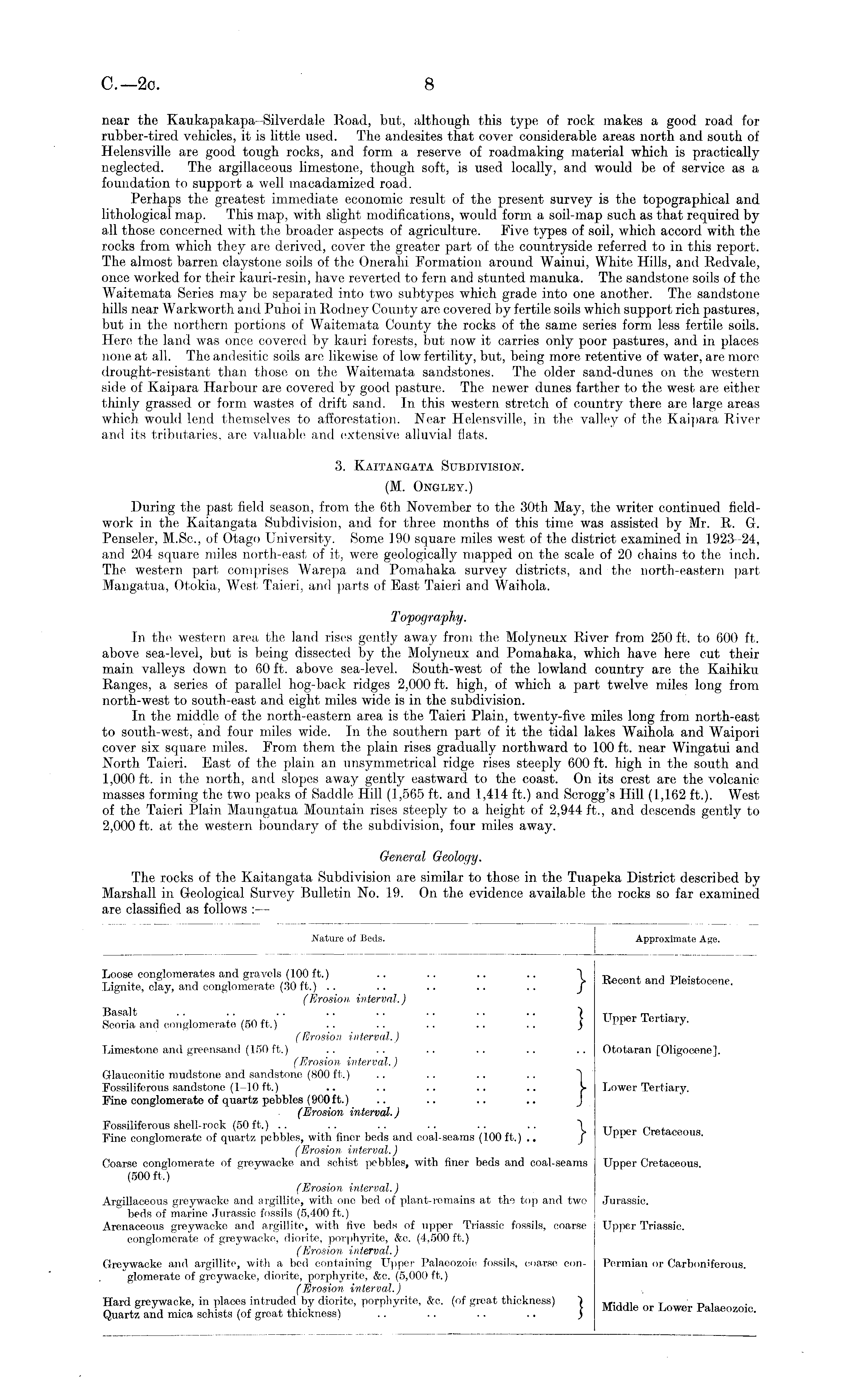 near the Kaukapakapa-Silverdale Road, but, although this type of rock makes a good road for rubber-tired vehicles, it is little used. The andesites that cover considerable areas north and south of Helensville are good tough rocks, and form a reserve of roadmaking material which is practically neglected. The argillaceous limestone, though soft, is used locally, and would be of service as a foundation to support a well macadamized road. Perhaps the greatest immediate economic result of the present survey is the topographical and lithological map. This map, with slight modifications, would form a soil-map such as that required by all those concerned with the broader aspects of agriculture. Five types of soil, which accord with the rocks from which they are derived, cover the greater part of the countryside referred to in this report. The almost barren claystone soils of the Onerahi Formation around Wainui, White Hills, and Redvale, once worked for their kauri-resin, have reverted to fern and stunted manuka. The sandstone soils of the Waitemata Series may be separated into two subtypes which grade into one another. The sandstone hills near Warkworth and Puhoi in Rodney County are covered by fertile soils which support rich pastures, but in the northern portions of Waitemata County the rocks of the same series form less fertile soils. Here the land was once covered by kauri forests, but now it carries only poor pastures, and in places none at all. The andesitic soils are likewise of low fertility, but, being more retentive of water, are more drought-resistant than those 011 the Waitemata sandstones. The older sand-dunes on the western side of Kaipara Harbour are covered by good pasture. The newer dunes farther to the west are either thinly grassed or form wastes of drift sand. In this western stretch of country there are large areas which would lend themselves to afforestation. Near Helensville, in the valley of the Kaipara River and its tributaries, are valuable and extensive alluvial flats. 3. Kaitangata Subdivision. (M. Ongley.) During the past field season, from the 6th November to the 30th May, the writer continued fieldwork in the Kaitangata Subdivision, and for three months of this time was assisted by Mr. R. 6. Penseler, M.Sc., of Otago University. Some 190 square miles west of the district examined in 1923- 24, and 204 square miles north-east of it, were geologically mapped on the scale of 20 chains to the inch. The western part comprises Warepa and Pomahaka survey districts, and the north-eastern part Mangatua, Otokia, West Taieri, and parts of East Taieri and Waihola. Topography. In the western area the land rises gently away from the Molyneux River from 250 ft. to 600 ft. above sea-level, but is being dissected by the Molyneux and Pomahaka, which have here cut their main valleys down to 60 ft. above sea-level. South-west of the lowland country are the Kaihiku Ranges, a series of parallel hog-back ridges 2,000 ft. high, of which a part twelve miles long from north-west to south-east and eight miles wide is in the subdivision. In the middle of the north-eastern area is the Taieri Plain, twenty-five miles long from north-east to south-west, and four miles wide. In the southern part of it the tidal lakes Waihola and Waipori cover six square miles. From them the plain rises gradually northward to 100 ft. near Wingatui and North Taieri. East of the plain an unsymmetrical ridge rises steeply 600 ft. high in the south and 1,000 ft. in the north, and slopes away gently eastward to the coast. On its crest are the volcanic masses forming the two peaks of Saddle Hill (1,565 ft. and 1,414 ft.) and Scrogg's Hill (1,162 ft.). West of the Taieri Plain Maungatua Mountain rises steeply to a height of 2,944 ft., and descends gently to 2,000 ft. at the western boundary of the subdivision, four miles away. General Geology. The rocks of the Kaitangata Subdivision are similar to those in the Tuapeka District described by Marshall in Geological Survey Bulletin No. 19. On the evidence available the rocks so far examined are classified as follows :—