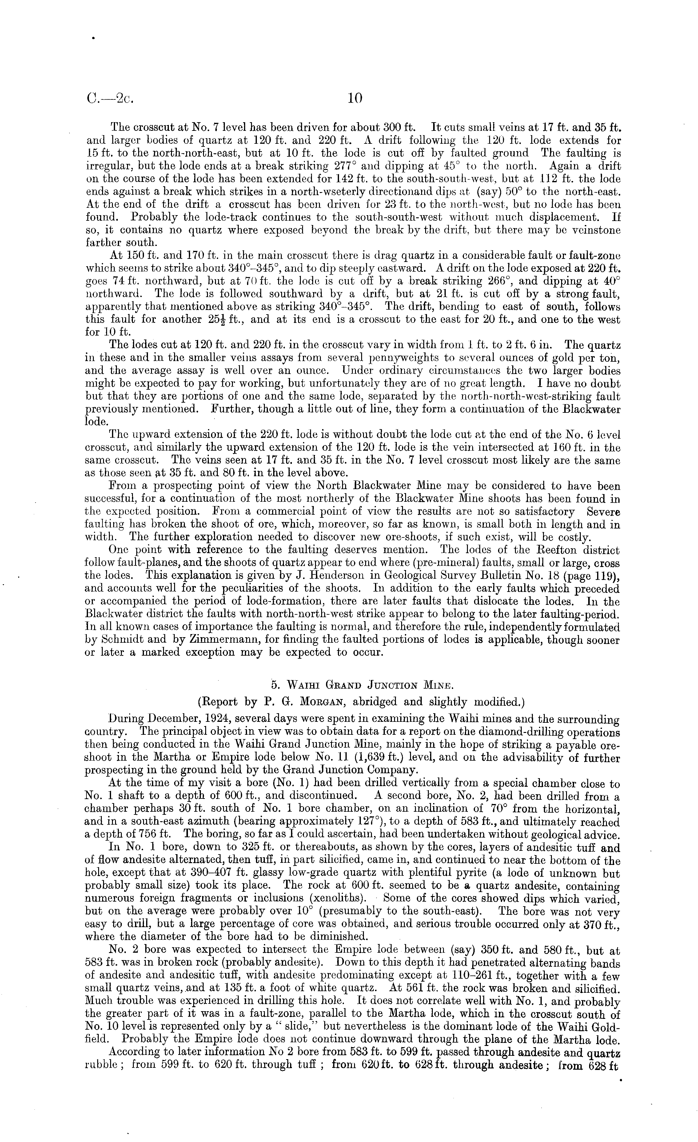 The crosscut at No. 7 level has been driven for about 300 ft. It cuts small veins at 17 ft. and 35 ft. and larger bodies of quartz at 120 ft. and 220 ft. A drift following the 120 ft. lode extends for 15 ft. to the north-north-east, but at 10 ft. the lode is cut off by faulted ground The faulting is irregular, but the lode ends at a break striking 277° and dipping at 45° to the north. Again a drift on the course of the lode has been extended for 142 ft. to the south-south-west, but at 112 ft. the lode ends against a break which strikes in a north-wseterly directionand dips at (say) 50° to the north-east. At the end of the drift a crosscut has been driven for 23 ft. to the north-west, but no lode has been found. Probably the lode-track continues to the south-south-west without much displacement. If so, it contains no quartz where exposed beyond the break by the drift, but there may be veinstone farther south. At 150 ft. and 170 ft. in the main crosscut there is drag quartz in a considerable fault or fault-zone which seems to strike about 340°-345°, and to dip steeply eastward. A drift on the lode exposed at 220 ft. goes 74 ft. northward, but at 70 ft. the lode is cut off by a break striking 266°, and dipping at 40° northward. The lode is followed southward by a drift, but at 21 ft. is cut ofE by a strong fault, apparently that mentioned above as striking 340°-345°. The drift, bending to east of south, follows this fault for another ft., and at its end is a crosscut to the east for 20 ft., and one to the west for 10 ft. The lodes cut at "120 ft. and 220 ft. in the crosscut vary in width from 1 ft. to 2 ft. 6 in. The quartz in these and in the smaller veins assays from several pennyweights to several ounces of gold per ton, and the average assay is well over an ounce. Under ordinary circumstances the two larger bodies might be expected to pay for working, but unfortunately they are of no great length. I have no doubt but that they are portions of one and the same lode, separated by the north-north-west-striking fault previously mentioned. Further, though a little out of line, they form a continuation of the Blackwater lode. The upward extension of the 220 ft. lode is without doubt the lode cut at the end of the No. 6 level crosscut, and similarly the upward extension of the 120 ft. lode is the vein intersected at 160 ft. in the same crosscut. The veins seen at 17 ft. and 35 ft. in the No. 7 level crosscut most likely are the same as those seen fit 35 ft. and 80 ft. in the level above. From a prospecting point of view the North Blackwater Mine may be considered to have been successful, for a continuation of the most northerly of the Blackwater Mine shoots has been found in the expected position. From a commercial point of view the results are not so satisfactory Severe faulting has broken the shoot of ore, which, moreover, so far as known, is small both in length and in width. The further exploration needed to discover new ore-shoots, if such exist, will be costly. One point with reference to the faulting deserves mention. The lodes of the Reefton district follow fault-planes, and the shoots of quartz appear to end where (pre-mineral) faults, small or large, cross the lodes. This explanation is given by J. Henderson in Geological Survey Bulletin No. 18 (page 119), and accounts well for the peculiarities of the shoots. In addition to the early faults which preceded or accompanied the period of lode-formation, there are later faults that dislocate the lodes. In the Blackwater district the faults with north-north-west strike appear to belong to the later faulting-period. In all known cases of importance the faulting is normal, and therefore the rule, independently formulated by Schmidt and by Zimmermann, for finding the faulted portions of lodes is applicable, though sooner or later a marked exception may be expected to occur. 5. Waihi Grand Junction Mine. (Report by P. G. Morgan, abridged and slightly modified.) During December, 1924, several days were spent in examining the Waihi mines and the surrounding country. The principal object in view was to obtain data for a report on the diamond-drilling operations then being conducted in the Waihi Grand Junction Mine, mainly in the hope of striking a payable oreshoot in the Martha or Empire lode below No. 11 (1,639 ft.) level, and on the advisability of further prospecting in the ground held by the Grand Junction Company. At the time of my visit a bore (No. 1) had been drilled vertically from a special chamber close to No. 1 shaft to a depth of 600 ft., and discontinued. A second bore, No. 2, had been drilled from a chamber perhaps 30 ft. south of No. 1 bore chamber, on an inclination of 70° from the horizontal, and in a south-east azimuth (bearing approximately 127°), to a depth of 583 ft., and ultimately reached a depth of 756 ft. The boring, so far as I could ascertain, had been undertaken without geological advice. In No. 1 bore, down to 325 ft. or thereabouts, as shown by the cores, layers of andesitic tuff and of flow andesite alternated, then tuff, in part silicified, came in, and continued to near the bottom of the hole, except that at 390-407 ft. glassy low-grade quartz with plentiful pyrite (a lode of unknown but probably small size) took its place. The rock at 600 ft. seemed to be a quartz andesite, containing numerous foreign fragments or inclusions (xenoliths). Some of the cores showed dips which varied, but on the average were probably over 10° (presumably to the south-east). The bore was not very easy to drill, but a large percentage of core was obtained, and serious trouble occurred only at 370 ft., where the diameter of the bore had to be diminished. No. 2 bore was expected to intersect the Empire lode between (say) 350 ft. and 580 ft., but at 583 ft. was in broken rock (probably andesite). Down to this depth it had penetrated alternating bands of andesite and andesitic tuft', with andesite predominating except at 110-2