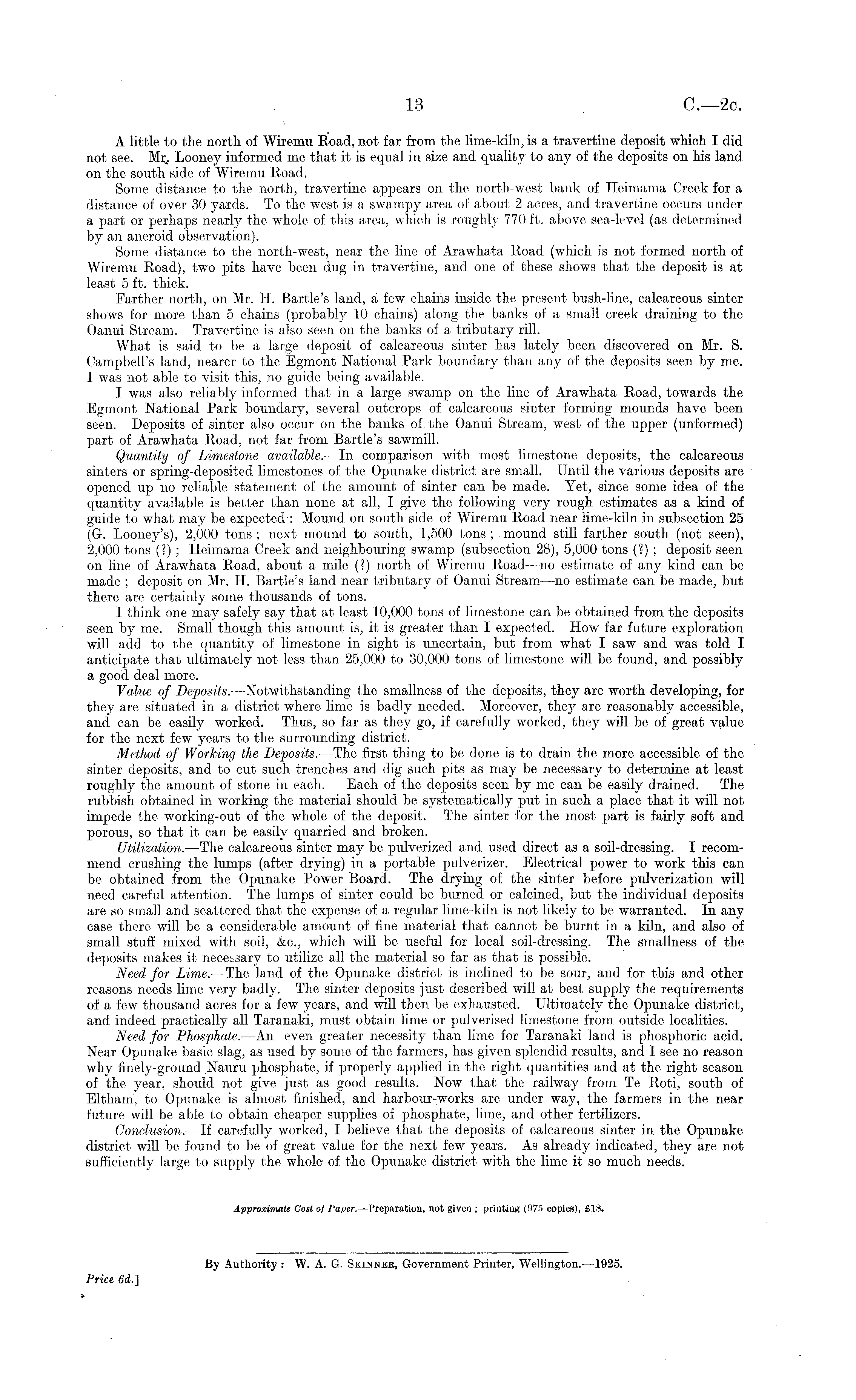 A little to the north of Wiremu Road, not far from the lime-kiln, is a travertine deposit which I did not see. Mr. Looney informed me that it is equal in size and quality to any of the deposits on his land on the south side of Wiremu Eoad. Some distance to the north, travertine appears on the north-west bank of Heimama Creek for a distance of over 30 yards. To the west is a swampy area of about 2 acres, and travertine occurs under a part or perhaps nearly the whole of this area, which is roughly 770 ft. above sea-level (as determined by an aneroid observation). Some distance to the north-west, near the line of Arawhata Road (which is not formed north of Wiremu Road), two pits have been dug in travertine, and one of these shows that the deposit is at least 5 ft. thick. Farther north, on Mr. H. Bartle's land, a few chains inside the present bush-line, calcareous sinter shows for more than 5 chains (probably 10 chains) along the banks of a small creek draining to the Oanui Stream. Travertine is also seen on the banks of a tributary rill. What is said to be a large deposit of calcareous sinter has lately been discovered on Mr. S. Campbell's land, nearer to the Egmont National Park boundary than any of the deposits seen by me. I was not able to visit this, no guide being available. I was also reliably informed that in a large swamp on the line of Arawhata Road, towards the Egmont National Park boundary, several outcrops of calcareous sinter forming mounds have been seen. Deposits of sinter also occur on the banks of. the Oanui Stream, west of the upper (unformed) part of Arawhata Road, not far from Bartle's sawmill. Quantity of Limestone available. —In comparison with most limestone deposits, the calcareous sinters or spring-deposited limestones of the Opunake district are small. Until the various deposits are opened up no reliable statement of the amount of sinter can be made. Yet, since some idea of the quantity available is better than none at all, I give the following very rough estimates as a kind of guide to what may be expected : Mound on south side of Wiremu Road near lime-kiln in subsection 25 (G-. Looney's), 2,000 tons ; next mound to south, 1,500 tons ; mound still farther south (not seen), 2,000 tons (?) ; Heimama Creek and neighbouring swamp (subsection 28), 5,000 tons (?) ; deposit seen on line of Arawhata Road, about a mile (?) north of Wiremu Road —no estimate of any kind can be made ; deposit on Mr. H. Bartle's land near tributary of Oanui Stream —no estimate can be made, but there are certainly some thousands of tons. I think one may safely say that at least 10,000 tons of limestone can be obtained from the deposits seen by me. Small though this amount is, it is greater than I expected. How far future exploration will add to the quantity of limestone in sight is uncertain, but from what I saw and was told I anticipate that ultimately not less than 25,000 to 30,000 tons of limestone will be found, and possibly a good deal more. Value of Deposits. —Notwithstanding the smallness of the deposits, they are worth developing, for they are situated in a district where lime is badly needed. Moreover, they are reasonably accessible, and can be easily worked. Thus, so far as they go, if carefully worked, they will be of great value for the next few years to the surrounding district. Method of Working the Deposits. —The first thing to be done is to drain the more accessible of the sinter deposits, and to cut such trenches and dig such pits as may be necessary to determine at least roughly the amount of stone in each. Each of the deposits seen by me can be easily drained. The rubbish obtained in working the material should be systematically put in such a place that it will not impede the working-out of the whole of the deposit. The sinter for the most part is fairly soft and porous, so that it can be easily quarried and broken. Utilization. —The calcareous sinter may be pulverized and used direct as a soil-dressing. I recommend crushing the lumps (after drying) in a portable pulverizer. Electrical power to work this can be obtained from the Opunake Power Board. The drying of the sinter before pulverization will need careful attention. The lumps of sinter could be burned or calcined, but the individual deposits are so small and scattered that the expense of a regular lime-kiln is not likely to be warranted. In any case there will be a considerable amount of fine material that cannot be burnt in a kiln, and also of small stuff mixed with soil, &c., which will be useful for local soil-dressing. The smallness of the deposits makes it necessary to utilize all the material so far as that is possible. Need for Lime. —The land of the Opunake district is inclined to be sour, and for this and other reasons needs lime very badly. The sinter deposits just described will at best supply the requirements of a few thousand acres for a few years, and will then be exhausted. Ultimately the Opunake district, and indeed practically all Taranaki, must obtain lime or pulverised limestone from outside localities. Need for Phosphate. —An even greater necessity than lime for Taranaki land is phosphoric acid. Near Opunake basic slag, as used by some of the farmers, has given splendid results, and I see no reason why finely-ground .Nauru phosphate, if properly applied in the right quantities and at the right season of the year, should not give just as good results. Now that the railway from Te Roti, south of Eltham, to Opunake is almost finished, and harbour-works are under way, the farmers in the near future will be able to obtain cheaper supplies of phosphate, lime, and other fertilizers. Conclusion. —If carefully worked, I believe that the deposits of calcareous sinter in the Opunake district will be found to be of great value for the next few years. As already indicated, they are not sufficiently large to supply the whole of the Opunake district with the lime it so much needs.