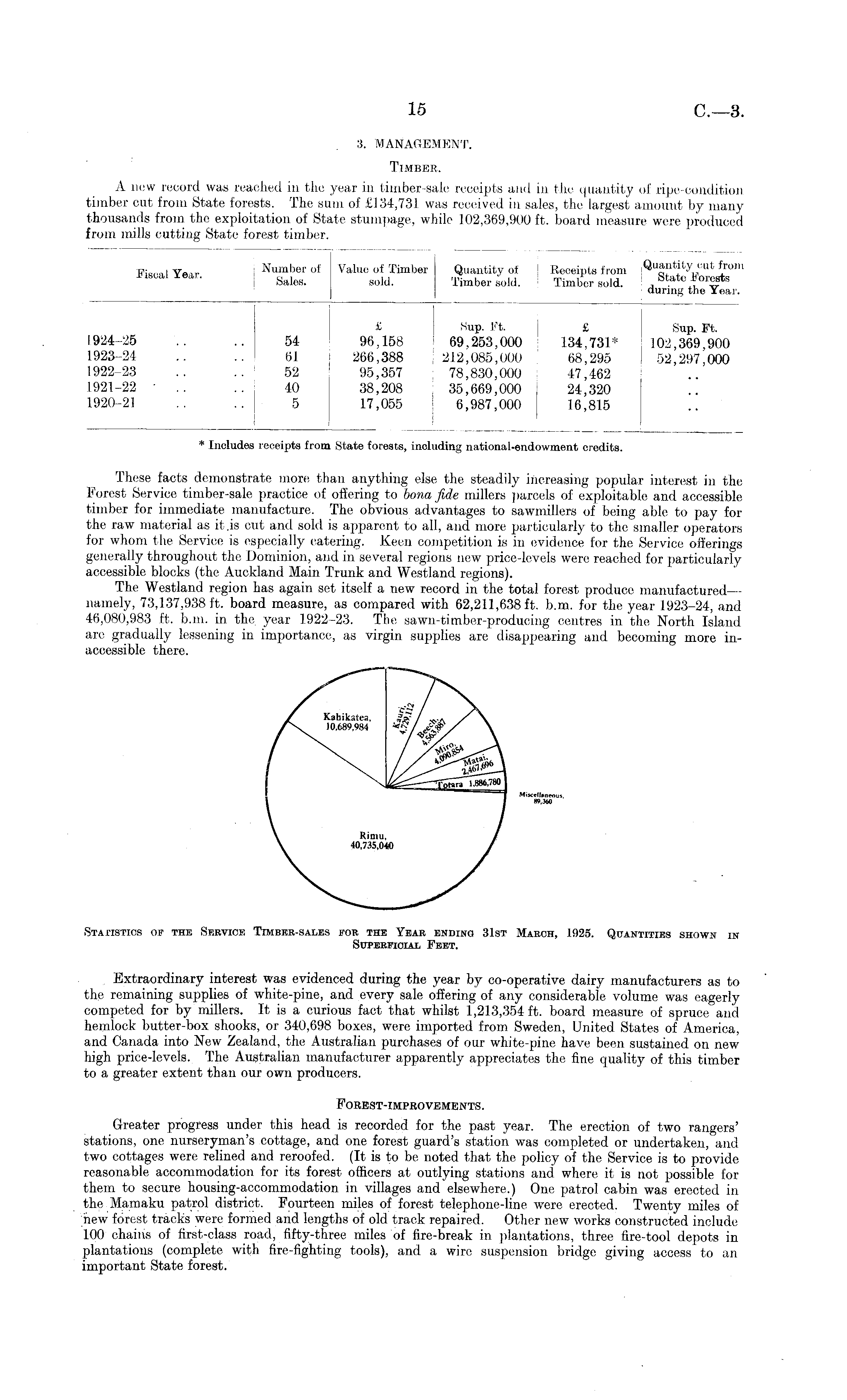 3. MANAGEMENT. Timber. A new record was reached in the year in timber-sale receipts and in the quantity of ripe-condition timber cut from State forests. The sum of £134,731 was received in sales, the largest amount by many thousands from the exploitation of State stuinpage, while 102,369,900 ft. board measure were produced from mills cutting State forest timber.