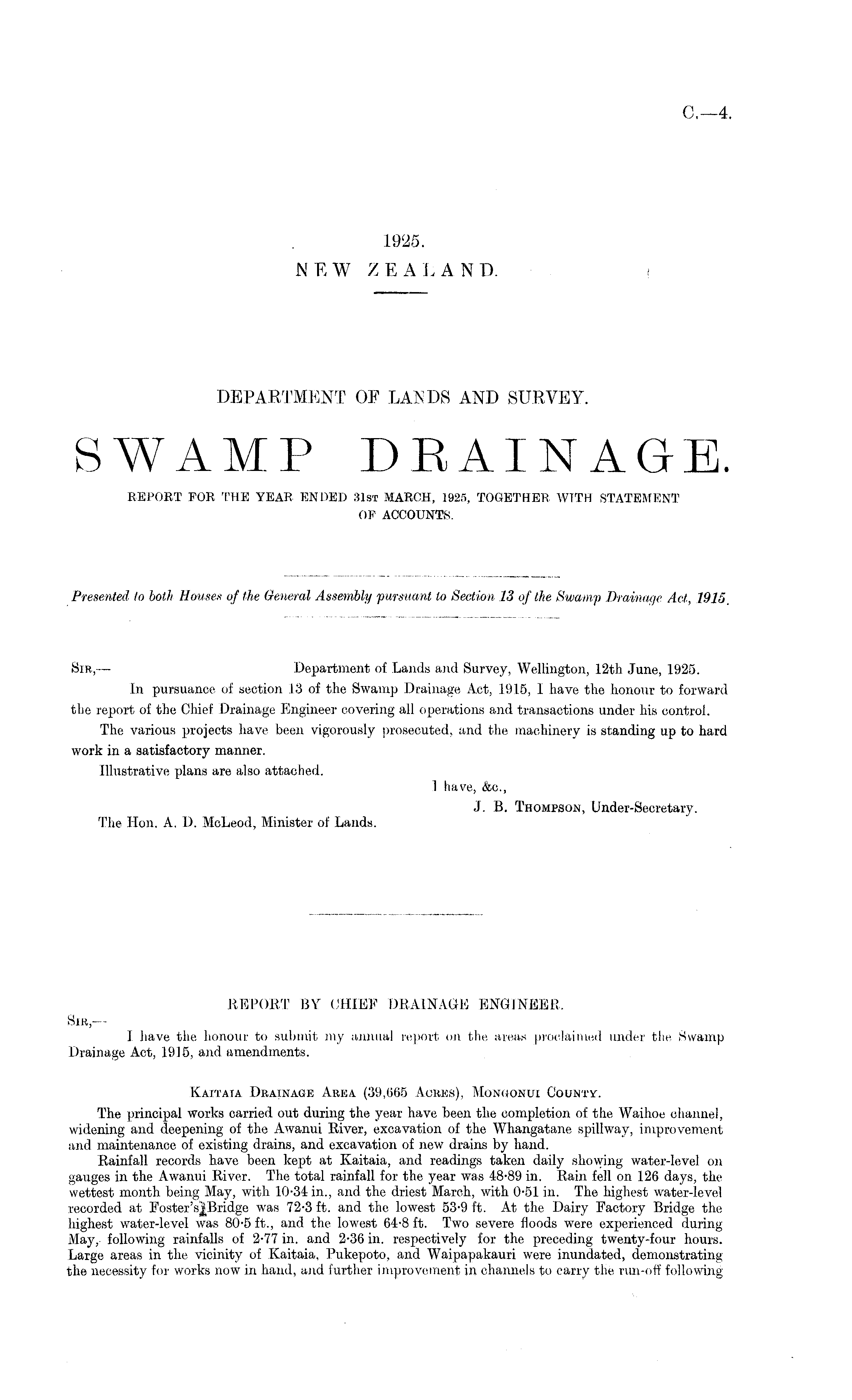 Sir, — Department of Lands and Survey, Wellington, 12th June, 1925. In pursuance of section 13 of the Swamp Drainage Act, 1915, I have the honour to forward the report of the Chief Drainage Engineer covering all operations and transactions under his control. The various projects have been vigorously prosecuted, and the machinery is standing up to hard work in a satisfactory manner. Illustrative plans are also attached. I have, &c., J. B. Thompson, Under-Secretary. The Hon. A. D. McLeod, Minister of Lands.