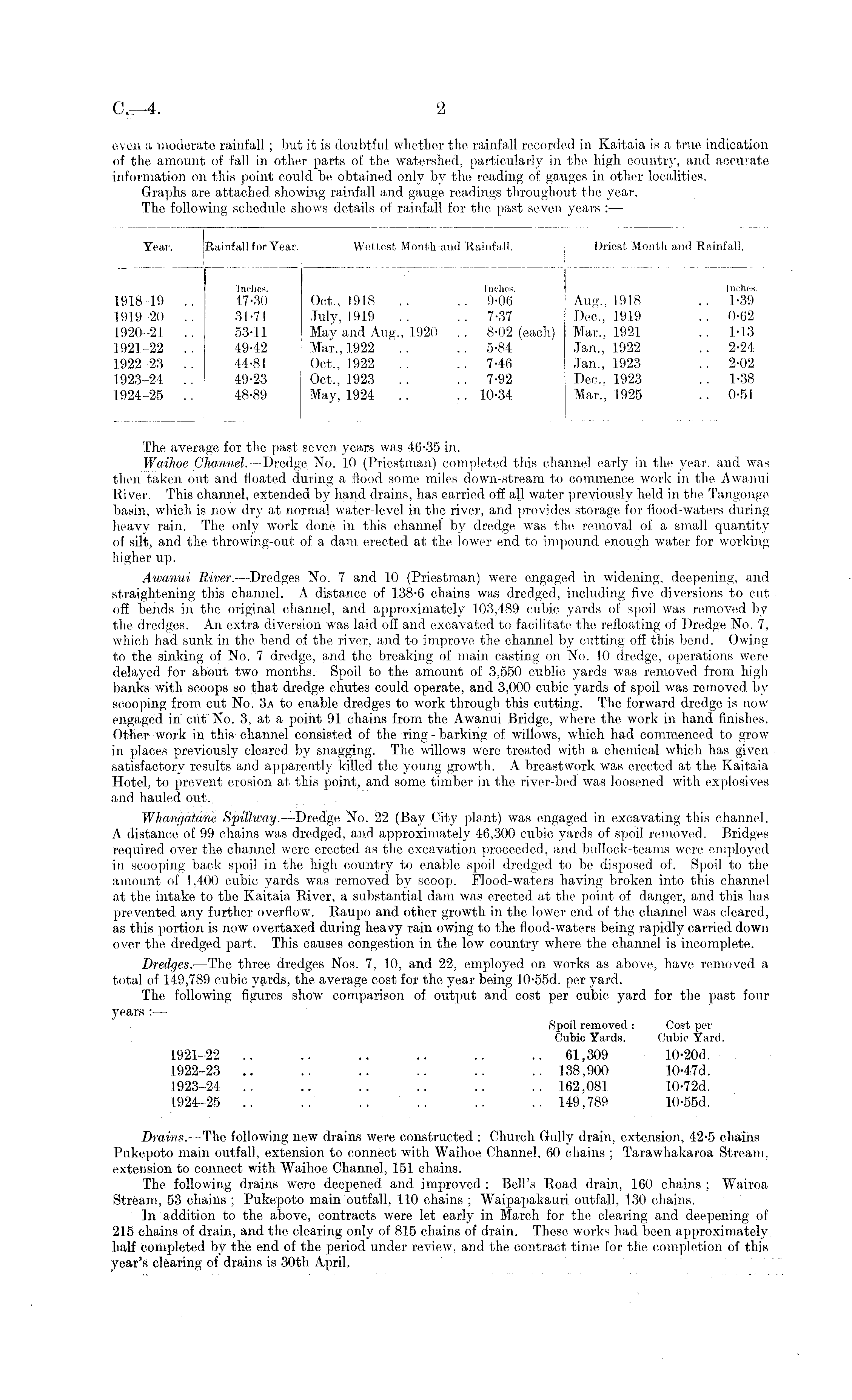 The average for the past seven years was 46-35 in. Waihoe Channel Dredge No. 10 (Priestraan) completed this channel early in the year, and was then taken out and floated during a flood some miles down-stream to commence work in the Awanui River. This channel, extended by hand drains, has carried off all water previously held in the Tangonge basin, which is now dry at normal water-level in the river, and provides storage for flood-waters during heavy rain. The only work done in this channel by dredge was the removal of a small quantity of silt, and the throwing-out of a dam erected at the lower end to impound enough water for workinghigh er up. Awanui River. —Dredges No. 7 and 10 (Priestman) were engaged in widening, deepening, and straightening this channel. A distance of 138-6 chains was dredged, including five diversions to cut off bends in the original channel, and approximately 103,489 cubic yards of spoil was removed by the dredges. An extra diversion was laid off and excavated to facilitate the refloating of Dredge No. 7, which had sunk in the bend of the river, and to improve the channel by cutting off this bend. Owing to the sinking of No. 7 dredge, and the breaking of main casting on No. 10 dredge, operations were delayed for about two months. Spoil to the amount of 3,550 cublic yards was removed from high banks with scoops so that dredge chutes could operate, and 3,000 cubic yards of spoil was removed by scooping from cut No. 3a to enable dredges to work through this cutting. The forward dredge is now engaged in cut No. 3, at a point 91 chains from the Awanui Bridge, where the work in hand finishes. Other work in this channel consisted of the ring - barking of willows, which had commenced to grow in places previously cleared by snagging. The willows were treated with a chemical which has given satisfactory results and apparently killed the young growth. A breastwork was erected at the Ivaitaia Hotel, to prevent erosion at this point, and some timber in the river-bed was loosened with explosives and hauled out.. ' Whangatane Spillway.—Dredge No. 22 (Bay City plant) was engaged in excavating this channel. A distance of 99 chains was dredged, and approximately 46,300 cubic yards of spoil removed. Bridges required over the channel were erected as the excavation proceeded, and bullock-teams were employed in scooping back spoil in the high country to enable spoil dredged to be disposed of. Spoil to the amount of 1,400 cubic yards was removed by scoop. Flood-waters having broken into this channel at the intake to the Kaitaia River, a substantial dam was erected at the point of danger, and this has prevented any further overflow. Raupo and other growth in the lower end of the channel was cleared, as this portion is now overtaxed during heavy rain owing to the flood-waters being rapidly carried down over the dredged part. This causes congestion in the low country where the channel is incomplete. Dredges.—The three dredges Nos. 7, 10, and 22, employed on works as above, have removed a total of 149,789 cubic yards, the average cost for the year being 10-55 d. per yard. The following figures show comparison of output and cost per cubic yard for the past four years : — Spoil removed : Cost per Cubic Yards. Cubic Yard. 1921-22 .. .. .. .. .. .. 61,309 10-20 d. 1922-23 .. .. .. .. .. ..138,900 1047 d. 1923-24- .. .. .. .. .. .. 162,081 10-72 d. 1924-25 .. .. .. .. .. ..149,789 10-55 d. Drains. —The following new drains were constructed : Church Gully drain, extension, 42-5 chains Pukepoto main outfall, extension to connect with Waihoe Channel, 60 chains ; Tarawhakaroa Stream, extension to connect with Waihoe Channel, 151 chains. The following drains were deepened and improved : Bell's Road drain, 160 chains : Wairoa Stream, 53 chains ; Pukepoto main outfall, 110 chains ; Waipapakauri outfall, 130 chains. In addition to the above, contracts were let early in March for the clearing and deepening of 215 chains of drain, and the clearing only of 815 chains of drain. These works had been approximately half completed by the end of the period under review, and the contract time for the completion of this year's clearing of drains is 30th April.