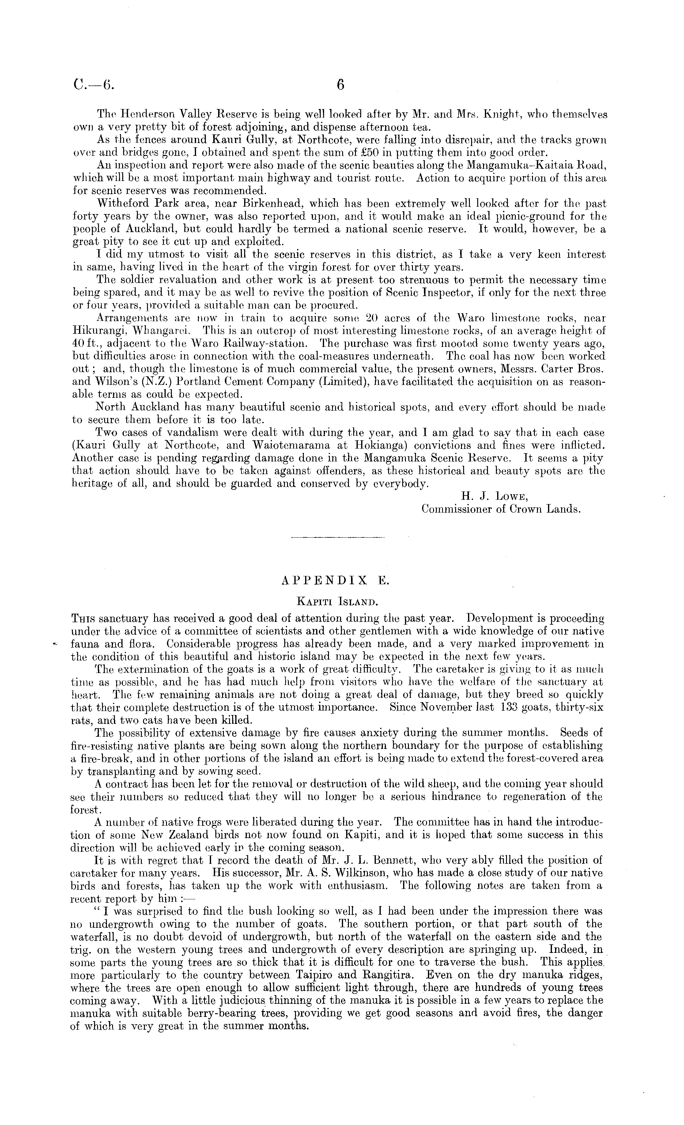 The Henderson Valley Reserve is being well looked after by Mr. and Mrs. Knight, who themselves own a very pretty bit of forest adjoining, and dispense.afternoon tea. As the fences around Kauri Gully, at Northcote, were falling into disrepair, and the tracks grown over and bridges gone, I obtained and spent the sum of £50 in putting them into good order. An inspection and report were also made of the scenic beauties along the Mangamuka-Kaitaia Road, which will be a most important main highway and tourist route. Action to acquire portion of this area for scenic reserves was recommended. Witheford Park aiea, near Birkenhead, which has been extremely well looked after for the past forty years by the owner, was also reported upon, and it would make an ideal picnic-ground for the people of Auckland, but could hardly be termed a national scenic reserve. It would, however, be a great pity to see it cut up and exploited. I did my utmost to visit all the scenic reserves in this district, as I take a very keen interest in same, having lived in the heart of the virgin forest for over thirty years. The soldier revaluation and other work is at present too strenuous to permit the necessary time being spared, and it may be as well to revive the position of Scenic Inspector, if only for the next three or four years, provided a suitable man can be procured. Arrangements are now in train to acquire some 20 acres of the Waro limestone rocks, near Hikurangi, Whangarei. This is an outcrop of most interesting limestone rocks, of an average height of 40 ft., adjacent to the Waro Railway-station. The purchase was first mooted some twenty years ago, but difficulties arose in connection with the coal-measures underneath. The coal has now been worked out; and, though the limestone is of much commercial value, the present owners, Messrs. Carter Bros, and Wilson's (N.Z.) Portland Cement Company (Limited), have facilitated the acquisition on as reasonable terms as could be expected. North Auckland has many beautiful scenic and historical spots, and every effort should be made to secure them before it is too late. Two cases of vandalism were dealt" with during the year, and I am glad to say that in each case (Kauri Gully at Northcote, and Waiotemarama at Hokianga) convictions and fines were inflicted. Another case is pending regarding damage done in the Mangamuka Scenic Reserve. It seems a pity that action should have to be taken against offenders, as these historical and beauty spots are the heritage of all, and should be guarded and conserved by everybody. H. J. Lowe, Commissioner of Crown Lands.