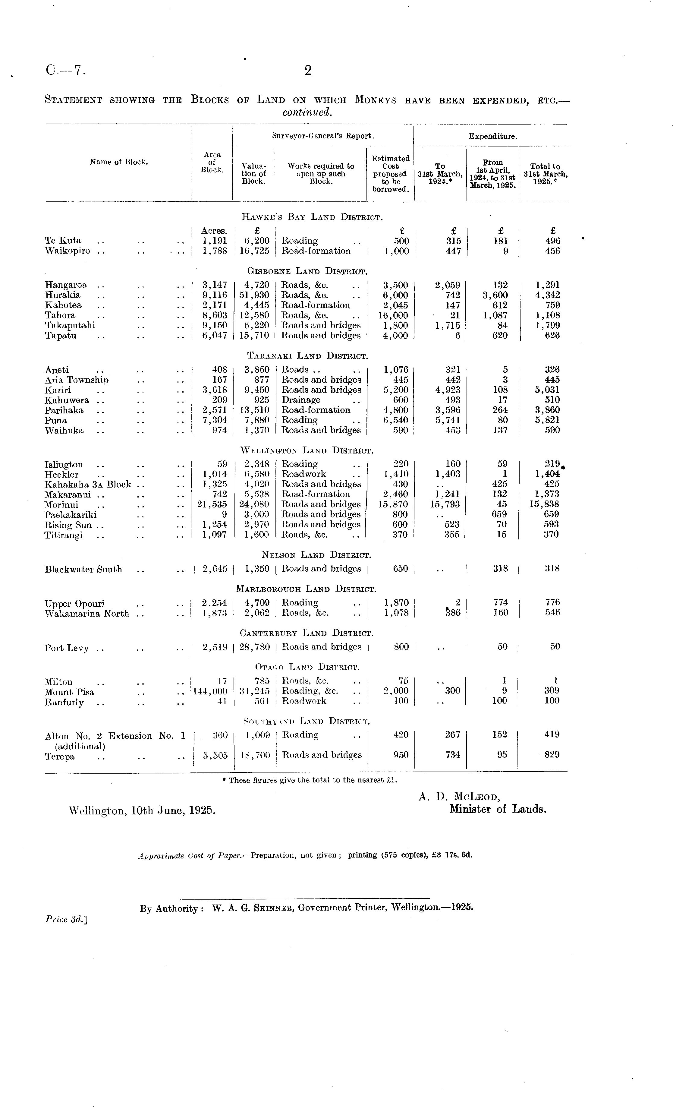 Surveyor-General's Report. Expenditure. Name of Block. "of Valua . Works required to To Total to tion of open up such proposed 31st March, 31st March, Block. Block. bOT tobe d 1924.* 1925 -' ! Hawke's Bay Land District. Acres. £ £ j £ • £ £ Te Kuta .. .. .. 1,191 : 6,200 j Roading .. 500 j 315 181 j 496 Waikopiro .. .. . .. 1,788 j 16,725 j Road-formation j 1,000 | 447 9 j 456 Gisbobne Land Distbict. Hangaroa .. .. .. 3,147 4,720 Roads, &c. .. 3,500 2,059 132 1,291 Hurakia .. .. .. 9,116 51,930 Roads, &c. .. 6,000 742 3,600 4.342 Kahotea .. .. .. 2,171 4,445 Road-formation 2,045 147 612 759 Tahora .. .. .. 8,603 12,580 Roads, &c. .. 16,000 21 1,087 1,108 Takaputahi .. .. 9,150 6,220 Roads and bridges 1,800 1,715 84 1,799 Tapatu .. .. .. 6,047 15,710 Roads and bridges 4,000 6 620 626 Tabanaki Land District. Aneti .. .. .. 408 3,850 Roads.. .. 1,076 321 5 326 Aria Township .. .. 167 877 Roads and bridges 445 442 3 445 Kariri .. .. .. 3,618 9,450 Roads and bridges 5,200 4,923 108 5,031 Kahuwera .. .. .. 209 925 Drainage .. 600 493 17 510 Parihaka .. .. .. 2,571 13,510 Road-formation 4,800 3,596 264 3,860 Puna .. .. .. 7,304 7,880 Roading .. 6,540 5,741 80 5,821 Waihuka .. .. .. 974 1,370 Roads and bridges 590 453 137 590 Wellington Land District. Islington .. .. .. 59 2,348 Roading .. 220 160 59 219. Heckler .. .. .. 1,014 6,580 Roadwork .. 1,410 1,403 1 1,404 Kahakaha 3 a Block .. .. 1,325 4,020 Roads and bridges 430 .. 425 425 Makaranui .. .. .. 742 5,538 Road-formation 2,460 1,241 132 1,373 Morinui .. .. .. 21,535 24,080 Roads and bridges 15,870 15,793 45 15,838 Paekakariki .. .. 9 3,000 Roads and bridges 800 .. 659 659 Rising Sun .. .. .. 1,254 2,970 Roads and bridges 600 523 70 593 Titirangi .. .. .. 1,097 1,600 Roads, &c. .. 370 355 15 370 Nelson Land District. Blackwater South .. •• I 2,645 j 1,350 [ Roads and bridges | 650 ] .. 1 318 j 318 Marlborough Land District. Upper Opouri .. .. j 2,254 I 4,709 I Roading .. I 1,870 ' 2 I 774 776 Wakamarina North .. .. ! 1,873 | 2,062 ) Roads, &c. .. j 1,078 | S86 160 | 546 Canterbury Land District. Port Levy .. .. .. 2,519 | 28,780 | Roads and bridges i 800 | .. 50 | 50 Otago Land District. Milton .. .. .. ! 17 785 Roads, &c. .. I 75 .. 1 j 1 Mount Pisa .. .. 144,000 34,245 Roading, &c. .. 2,000 300 9 309 Ranfurly .. .. .. , 41 564 Roadwork .. 100 .. 100 | 100 South i ind Land District. Alton No. 2 Extension No. 1 i 360 1,009 Roading .. 420 267 152 419 (additional) | Terepa .. .. .. I 5,505 18,700 Roads and bridges 950 734 95 829 * These figures give the total to the nearest £1. A. T>. MCLeod, Wellington, 10th June, 1925. Minister of Lands.