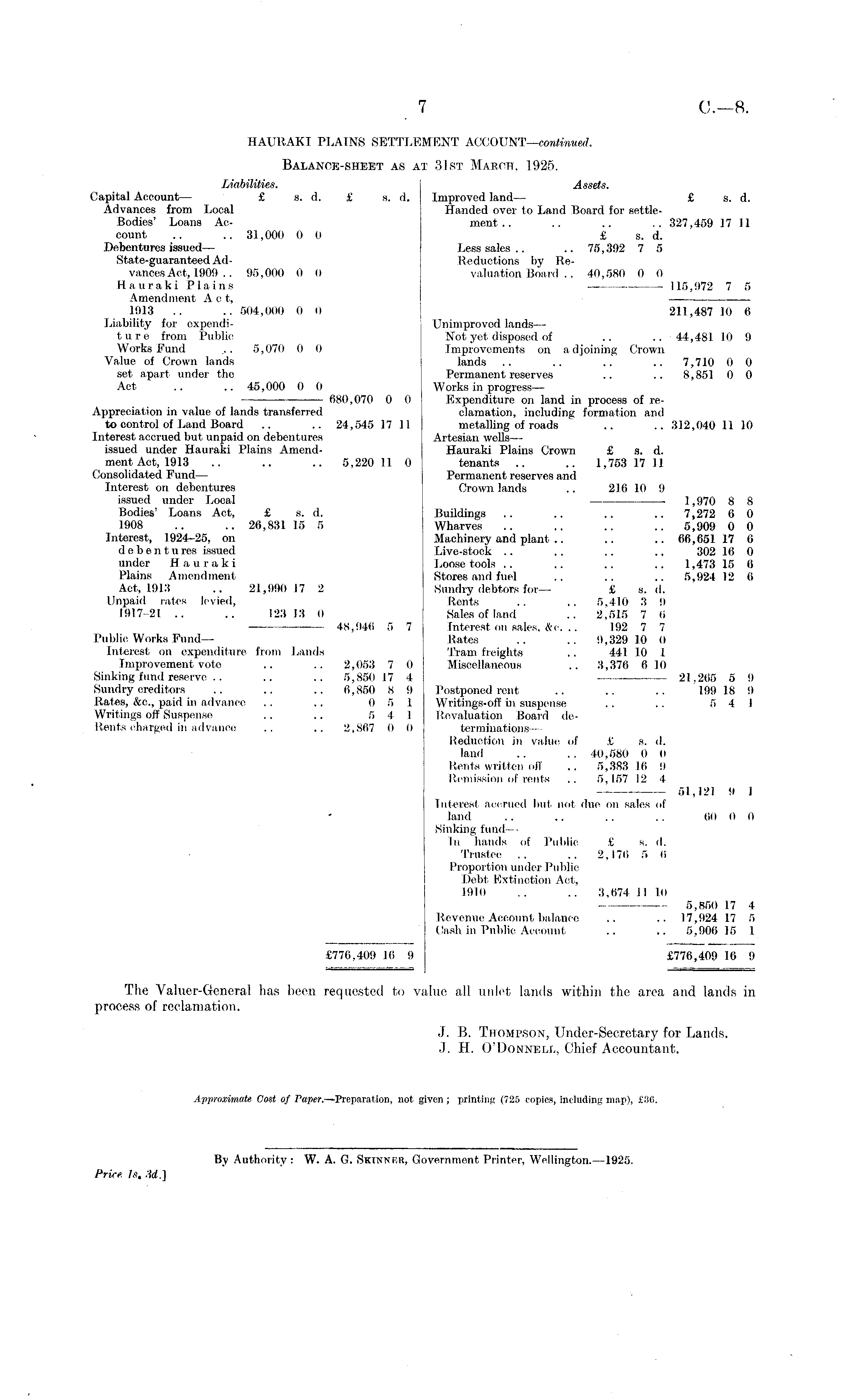 HAURAKI PLAINS SETTLEMENT ACCOUNT—continued. Balance-sheet as at 31st March, 1925. Liabilities. Assets. Capital Account — £ s. d. £ s. d. Improved land— £ s. d. Advances from Local Handed over to Land Board for settleBodies' Loans Ac- ment .. .. .. .. 327,459 17 11 count .. .. 31,000 0 0 £ s. d. Debentures issued— Less sales .. .. 75,392 7 5 State-guaranteed Ad- j Reductions by Revances Act, 1909 .. 95,000 0 0 valuation Board .. 40,580 0 0 Hauraki Plains 115,972 7 5 Amendment Act, 1913 .. .. 504,000 0 0 211,487 10 6 Liability for expendi- Unimprovod lands— ture from Public Not yet disposed of .. .. 44,481 10 9 Works Eund ... 5,070 0 0 Improvements on adjoining Crown Value of Crown lands lands .. .. .. .. 7,710 0 0 set apart under the Permanent reserves .. .. 8,851 0 0 Act .. .. 45,000 0 0 Works in progress— 680,070 0 0 Expenditure on land in process of reAppreciation in value of lands transferred clamation, including formation and to control of Land Board .. .. 24,545 17 11 metalling of roads .. .. 312,040 11 10 Interest accrued but unpaid on debentures Artesian wells— issued under Hauraki Plains Amend- Hauraki Plains Crown £ s. d. ment Act, 1913 .. .. .. 5,220 11 0 tenants .. .. 1,753 17 11 Consolidated Fund— Permanent reserves and Interest on debentures Crown lands .. 216 10 9 issued under Local — 1,970 8 8 Bodies' Loans Act, £ s. d. Buildings .. .. .. .. 7,272 6 0 1908 .. .. 26,831 15 5 Wharves .. .. .. .. 5,909 0 0 Interest, 1924-25, on Machinery and plant .. .. .. 66,651 17 6 debe nt u res issued Live-stock .. .. .. .. 302 16 0 under Hauraki Loose tools .. .. .. .. 1,473 15 6 Plains Amendment Stores and fuel .. .. .. 5,924 12 6 Act, 1913 .. 21,990 17 2 Sundry debtors for— £ s. d. Unpaid rates levied, Rents .. .. 5,410 3 9 1917-21 .. .. 123 13 0 Sales of land .. 2,515 7 6 48,946 5 7 Interest on sales, &c. .. 192 7 7 Public Works Fund —- i Rates .. .. 9,329 10 0 Interest on expenditure from Lands Tram freights .. 441 10 1 Improvement vote .. .. 2,053 7 0 Miscellaneous .. 3,376 610 Sinking fund reserve .. .. .. 5,850 17 4 21,265 5 9 Sundry creditors .. .. .. 6,850 8 9 Postponed rent .. .. .. 199 18 9 Rates, &c., paid in advance .. .. 0 5 1 Writings-off in suspense .. .. 5 4 1 Writings off Suspense .. .. 5 4 1 Revaluation Board deRents charged in advance .. .. 2,867 0 0 terminations— Reduction in value of £ s. d. land .. .. 40,580 0 0 Rents written off .. 5,383 16 9 Remission of rents .. 5,157 12 4 — 51,121 9 1 Interest accrued but not due on sales of land .. .. .. .. 60 0 0 Sinking fund— In hands of Public £ s. d. Trustee .. .. 2,176 5 6 Proportion under Public Debt Extinction Act, 1910 .. .. 3,674 11 10 5,850 17 4 Revenue Account balance .. .. 17,924 17 5 Cash in Public Account .. .. 5,906 15 1 £776,409 16 9 £776,409 16 9 The Valuer-General has been requested to value all unlet lands within the area and lands in process of reclamation. J. B. Thompson, Under-Secretary for Lands. J. H. O'Donnell, Chief Accountant.