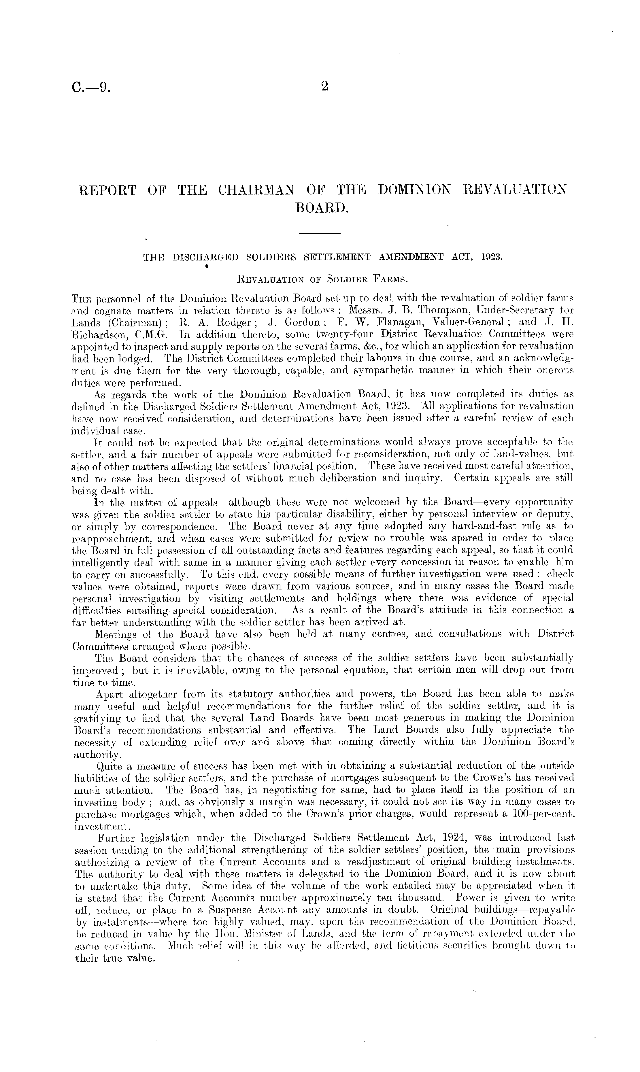 REPORT OF THE CHAIRMAN OF THE DOMINION REVALUATION BOARD. THE DISCHARGED SOLDIERS SETTLEMENT AMENDMENT ACT, 1923. Revaluation op Soldier Fabms. The personnel of the Dominion Revaluation Board set up to deal with the revaluation of soldier farms and cognate matters in relation thereto is as follows : Messrs. J. B. Thompson, Under-Secretary for Lands (Chairman) ; R. A. Rodger; J. Gordon; F. W. Flanagan, Valuer-General; and J. H. Richardson, C.M.G. In addition thereto, some twenty-four District Revaluation Committees were appointed to inspect and supply reports on the several farms, &c., for which an application for revaluation had been lodged. The District Committees completed their labours in due course, and an acknowledgment is due them for the very thorough, capable, and sympathetic manner in which their onerous duties were performed. As regards the work of the Dominion Revaluation Board, it has now completed its duties as defined in the Discharged Soldiers Settlement Amendment Act, 1923. All applications for revaluation have now received consideration, and determinations have been issued after a careful review of each individual case. It could not be expected that the original determinations would always prove acceptable to the settler, and a fair number of appeals were submitted for reconsideration, not only of land-values, but also of other matters affecting the settlers' financial position. These have received most careful attention, and no case has been disposed of without much deliberation and inquiry. Certain appeals are still being dealt with. In the matter of appeals—although these were not welcomed by the Board —every opportunity was given the soldier settler to state his particular disability, either by personal interview or deputy, or simply by correspondence. The Board never at any time adopted any hard-and-fast rule as to reapproachment, and when cases were submitted for review no trouble was spared in order to place the Board in full possession of all outstanding facts and features regarding each appeal, so that it could intelligently deal with same in a manner giving each settler every concession in reason to enable him to carry on successfully. To this end, every possible means of further investigation were used : check values were obtained, reports were drawn from various sources, and in many cases the Board made personal investigation by visiting settlements and holdings where there was evidence of special difficulties entailing special consideration. As a result of the Board's attitude in this connection a far better understanding with the soldier settler has been arrived at. Meetings of the Board have also been held at many centres, and consultations with District Committees arranged where possible. The Board considers that the chances of success of the soldier settlers have been substantially improved ; but it is inevitable, owing to the personal equation, that certain men will drop out from time to time. Apart altogether from its statutory authorities and powers, the Board has been able to make many useful and helpful recommendations for the further relief of the soldier settler, and it is gratifying to find that the several Land Boards have been most generous in making the Dominion Board's recommendations substantial and effective. The Land Boards also fully appreciate the necessity of extending relief over and above that coming directly within the Dominion Board's authority. Quite a measure of success has been met with in obtaining a substantial reduction of the outside liabilities of the soldier settlers, and the purchase of mortgages subsequent to the Crown's has received much attention. The Board has, in negotiating for same, had to place itself in the position of an investing body ; and, as obviously a margin was necessary, it could not see its way in many cases to purchase mortgages which, when added to the Crown's prior charges, would represent a 100-per-cent. investment. Further legislation under the Discharged Soldiers Settlement Act, 1924, was introduced last session tending to the additional strengthening of the soldier settlers' position, the main provisions authorizing a review of the Current Accounts and a readjustment of original building instalments. The authority to deal with these matters is delegated to the Dominion Board, and it is now about to undertake this duty. Some idea of the volume of the work entailed may be appreciated when it is stated that the Current Accounts number approximately ten thousand. Power is given to write off, reduce, or place to a Suspense Account any amounts in doubt. Original buildings—repayable by instalments —where too highly valued, may, upon the recommendation of the Dominion Board, be reduced in value by the Hon. Minister of Lands, and the term of repayment extended under the same conditions. Much relief will in this way be afforded, and fictitious securities brought down to their true value.
