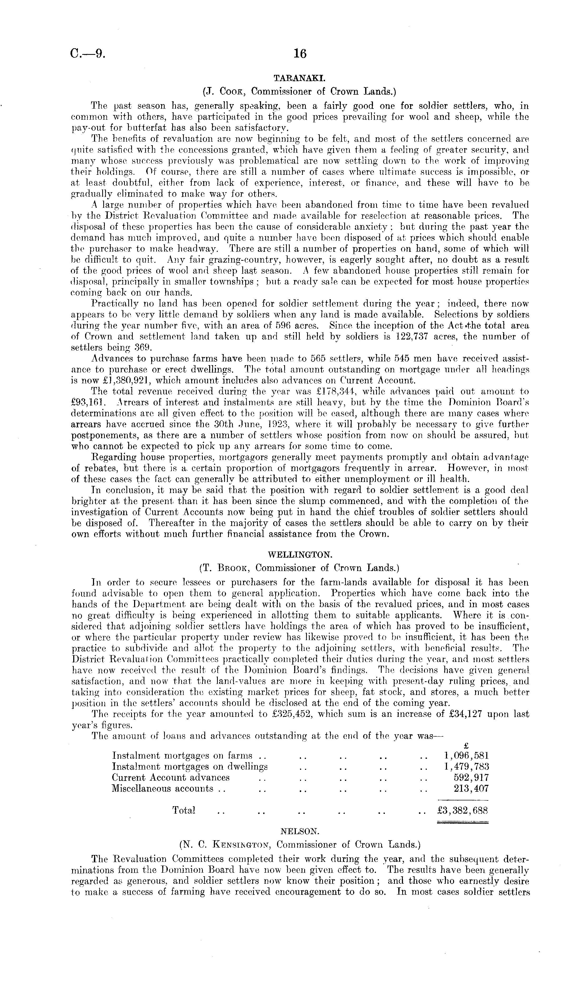 TABANAKI. (J. Cook, Commissioner of Crown Lands.) The past season has, generally speaking, been a fairly good one for soldier settlers, who, in common with others, have participated in the good prices prevailing for wool and sheep, while the pay-out for butt erf at has also been satisfactory. The benefits of revaluation are now beginning to be felt, and most of the settlers concerned are quite satisfied with the concessions granted, which have given them a feeling of greater security, and many whose success previously was problematical are now settling down to the work of improving their holdings. Of course, there are still a number of cases where ultimate success is impossible, or at least doubtful, either from lack of experience, interest, or finance, and these will have to be gradually eliminated to make way for others. A large number of properties which have been abandoned from time to time have been revalued by the District Revaluation Committee and made available for reselection at reasonable prices. The disposal of these properties has been the cause of considerable anxiety ; but during the past year the demand has much improved, and quite a number have been disposed of at prices which should enable the purchaser to make headway. There are still a number of properties on hand, some of which will be difficult to quit. Any fair grazing-country, however, is eagerly sought after, no doubt as a result of the good pi ices of wool and sheep last season. A few abandoned house properties still remain for disposal, principally in smaller townships ; but a ready sale can be expected for most house properties coming back 011 our hands. Practically no land has been opened for soldier settlement during the year ; indeed, there now appears to be very little demand by soldiers when any land is made available. Selections by soldiers during the year number five, with an area of 596 acres. Since the inception of the Act-the total area of Crown and settlement land taken up and still held by soldiers is 122,737 acres, the number of settlers being 369. Advances to purchase farms have been made to 565 settlers, while 545 men have received assistance to purchase or erect dwellings. The total amount outstanding on mortgage under all headings is now £1,380,921, which amount includes also advances on Current Account. The total revenue received during the year was £178,344, while advances paid out amount to £9-3,161. Arrears of interest and instalments are still heavy, but by the time the Dominion Board's determinations are all given effect to the position will be eased, although there are many cases where arrears have accrued since the -30th .lune, 1923, where it will probably be necessary to give further postponements, as there are a number of settlers whose position from now on should be assured, but who cannot be expected to pick up any arrears for some time to come. Regarding house properties, mortgagors generally meet payments promptly and obtain advantage of rebates, but there is a. certain proportion of mortgagors frequently in arrear. However, in most of these cases the fact can generally be attributed to either unemployment or ill health. In conclusion, it may be said that the position with regard to soldier settlement is a good deal brighter at the present- than it has been since the slump commenced, and with the completion of the investigation of Current Accounts now being put in hand the chief troubles of soldier settlers should be disposed of. Thereafter in the majority of cases the settlers should be able to carry on by their own efforts without much further financial assistance from the Crown. WELLINGTON. (T. Brook, Commissioner of Crown Lands.) In order to secure lessees or purchasers for the farm-lands available for disposal it has been found advisable to open them to general application. Properties which have come back into the hands of the Department are being dealt with on the basis of the revalued prices, and in most cases no great difficulty is being experienced in allotting them to suitable applicants. Where it is considered that adjoining soldier settlers have holdings the area of which has proved to be insufficient, or where the particular property under review has likewise proved to be insufficient, it has been the practice to subdivide and allot the property to the adjoining settlers, with beneficial results. The District Revaluation Committees practically completed their duties during the year, and most settlers have now received the result of the Dominion Board's findings. The decisions have given general satisfaction, and now that the land-values are more in keeping with present-day ruling prices, and taking into consideration the existing market prices for sheep, fat stock, and stores, a much better position in the settlers' accounts should be disclosed at the end of the coming year. The receipts for the year amounted to £325,452, which sum is an increase of £34,127 upon last year's figures. The amount of loans and advances outstanding at the end of the year was — £ Instalment mortgages on farms .. .. .. .. .. 1,096,581 Instalment mortgages on dwellings .. .. .. .. 1,479,783 Current Account advances .. .. .. .. .. 592,917 Miscellaneous accounts .. .. .. .. .. .. 213,407 Total .. .. .. .. .. .. £3,382,688 NELSON. (N. C. Kensington, Commissioner of Crown Lands.) The Revaluation Committees completed their work during the year, and the subsequent determinations from the Dominion Board have now been given effect to. The results have been generally regarded as generous, and soldier settlers now know their position; and those who earnestly desire to make a success of farming have received encouragement to do so. In most cases soldier settlers