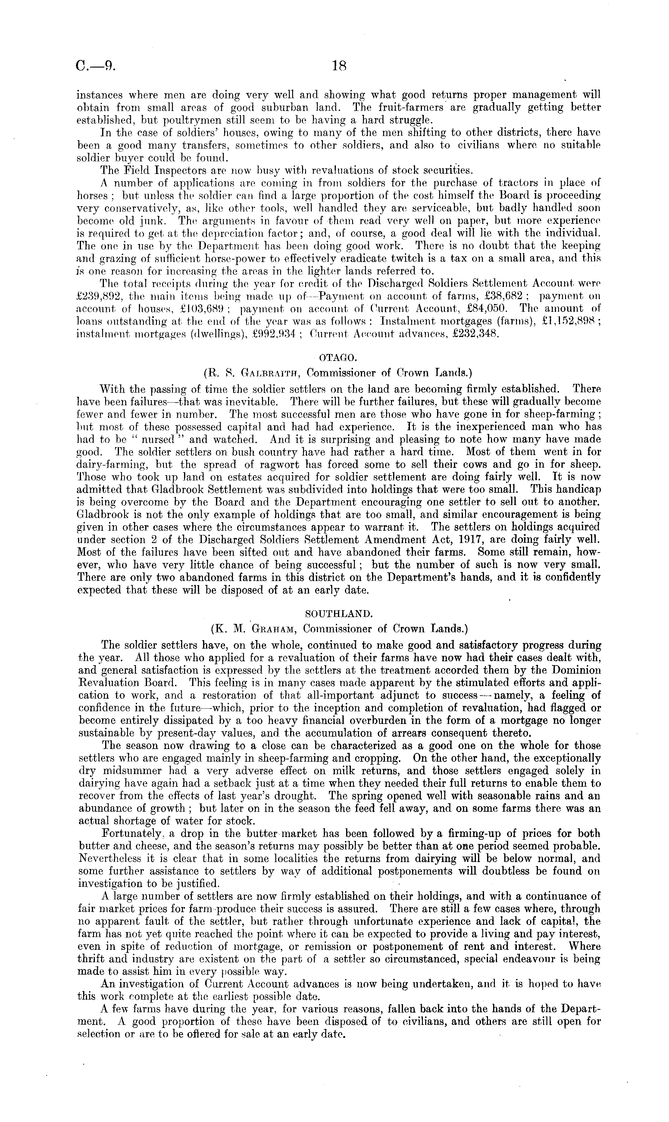 instances where men are doing very well and showing what good returns proper management will obtain from small areas of good suburban land. The fruit-farmers are gradually getting better established, but poultrymen still seem to be having a hard struggle. In the case of soldiers' houses, owing to many of the men shifting to other districts, there have been a good many transfers, sometimes to other soldiers, and also to civilians where no suitable soldier buyer could be found. The Field Inspectors are now busy with revaluations of stock securities. A number of applications are coming in from soldiers for the purchase of tractors in place of horses ; but unless the soldier can find a large proportion of the cost himself the Board is proceeding very conservatively, as, like other tools, well handled they are serviceable, but badly handled soon become old junk. The arguments in favour of them read very well on paper, but more experience is required to get at the depreciation factor; and, of course, a good deal will lie with the individual. The one in use by the Department has been doing good work. There is no doubt that the keeping and grazing of sufficient horse-power to effectively eradicate twitch is a tax on a small area, and this is one reason for increasing the areas in the lighter lands referred to. The total receipts during the year for credit of the Discharged Soldiers Settlement Account were £239,892, the main items being made up of Payment on account of farms, £38,682; payment on account of houses, £103,689; payment on account of Current Account, £84,050. The amount of loans outstanding at the end of the year was as follows : Instalment mortgages (farms), £1,152,898 ; instalment mortgages (dwellings), £992,934 ; Current Account advances, £232,348. OTAGO. (R. S. Galbraith, Commissioner of Crown Lands.) With the passing of time the soldier settlers on the land are becoming firmly established. There have been failures —that was inevitable. There will be further failures, but these will gradually become fewer and fewer in number. The most successful men are those who have gone in for sheep-farming ; but most of these possessed capital and had had experience. It is the inexperienced man who has had to be " nursed " and watched. And it is surprising and pleasing to note how many have made good. The soldier settlers on bush country have had rather a hard time. Most of them went in for dairy-farming, but the spread of ragwort has forced some to sell their cows and go in for sheep. Those who took up land on estates acquired for soldier settlement are doing fairly well. It is now admitted that Gladbrook Settlement was subdivided into holdings that were too small. This handicap is being overcome by the Board and the Department encouraging one settler to sell out to another. Gladbrook is not the only example of holdings that are too small, and similar encouragement is being given in other cases where the circumstances appear to warrant it. The settlers on holdings acquired under section 2 of the Discharged Soldiers Settlement Amendment Act, 1917, are doing fairly well. Most of the failures have been sifted out and have abandoned their farms. Some still remain, however, who have very little chance of being successful ; but the number of such is now very small. There are only two abandoned farms in this district on the Department's hands, and it is confidently expected that these will be disposed of at an early date. SOUTHLAND. (K. M. Graham, Commissioner of Crown Lands.) The soldier settlers have, on the whole, continued to make good and satisfactory progress during the year. All those who applied for a revaluation of their farms have now had their cases dealt with, and general satisfaction is expressed by the settlers at the treatment accorded them by the Dominion Revaluation Board. This feeling is in many cases made apparent by the stimulated efforts and application to work, and a restoration of that all-important adjunct to success — namely, a feeling of confidence in the future- —which, prior to the inception and completion of revaluation, had flagged or become entirely dissipated by a too heavy financial overburden in the form of a mortgage no longer sustainable by present-day values, and the accumulation of arrears consequent thereto. The season now drawing to a close can be characterized as a good one on the whole for those settlers who are engaged mainly in sheep-farming and cropping. On the other hand, the exceptionally dry midsummer had a very adverse effect on milk returns, and those settlers engaged solely in dairying have again had a setback just at a time when they needed their full returns to enable them to recover from the effects of last year's drought. The spring opened well with seasonable rains and an abundance of growth ; but later on in the season the feed fell away, and on some farms there was an actual shortage of water for stock. Fortunately, a drop in the butter market has been followed by a firming-up of prices for both butter and cheese, and the season's returns may possibly be better than at one period seemed probable. Nevertheless it is clear that in some localities the returns from dairying will be below normal, and some further assistance to settlers by way of additional postponements will doubtless be found on investigation to be justified. A large number of settlers are now firmly established on their holdings, and with a continuance of fair market prices for farm produce their success is assured. There are still a few cases where, through no apparent fault of the settler, but rather through unfortunate experience and lack of capital, the farm has not yet quite reached the point where it can be expected to provide a living and pay interest, even in spite of reduction of mortgage, or remission or postponement of rent and interest. Where thrift and industry are existent on the part of a settler so circumstanced, special endeavour is being made to as