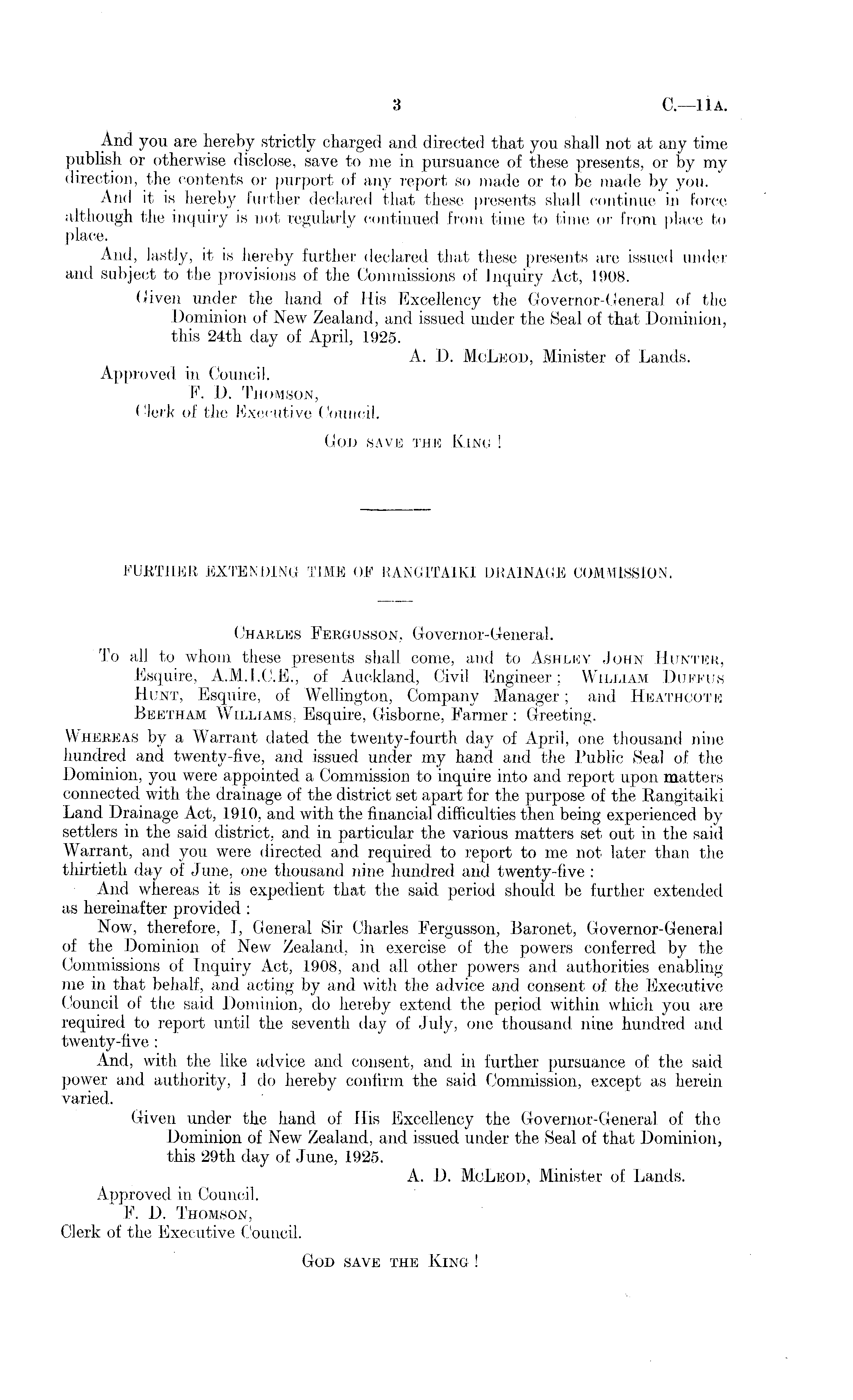And you are hereby strictly charged and directed that you shall not at any time publish or otherwise disclose, save to me in pursuance of these presents, or by my direction, the contents or purport of any report so made or to be made by you. And it is hereby further declared that these presents shall continue in force although the inquiry is not regularly continued from time to time or from place to place. And, lastly, it is hereby further declared that these presents are issued under and subject to the provisions of the Commissions of Inquiry Act, 1908. (liven under the hand of His Excellency the Governor-General of the Dominion of New Zealand, and issued under the Seal of that Dominion, this 24th day of April, 1925. A. D. McLeod, Minister of Lands. Approved in Council. F. D. Thomson, Clerk of the Executive Council. God save the King ! FURTHER EXTENDING TIME OF RANGITAIKI DRAINAGE COMMISSION. Charles Fergusson, Governor-General. To all to whom these presents shall come, and to Ashley John Hunter, Esquire, A.M.I. C.E., of Auckland, Civil Engineer; William Duff us Hunt, Esquire, of Wellington, Company Manager; and Heathoote Beetham Williams, Esquire, Gisborne, Farmer: Greeting. Whereas by a Warrant dated the twenty-fourth day of April, one thousand nine hundred and twenty-five, and issued under my hand and the Public Seal of the Dominion, you were appointed a Commission to inquire into and report upon matter's connected with the drainage of the district set apart for the purpose of the Rangitaiki Land Drainage Act, 1910, and with the financial difficulties then being experienced by settlers in the said district, and in particular the various matters set out in the said Warrant, and you were directed and required to report to me not later than the thirtieth day of June, one thousand nine hundred and twenty-five : And whereas it is expedient that the said period should be further extended as hereinafter provided : Now, therefore, I, General Sir Charles Fergusson, Baronet, Governor-General of the Dominion of New Zealand, in exercise of the powers conferred by the Commissions of Inquiry Act, 1908, and all other powers and authorities enabling me in that behalf, and acting by and with the advice and consent of the Executive Council of the said Dominion, do hereby extend the period within which you are required to report until the seventh day of July, one thousand nine hundred and twenty-five : And, with the like advice and consent, and in further pursuance of the said power and authority, I do hereby confirm the said Commission, except as herein varied. Given under the hand of His Excellency the Governor-General of the Dominion of New Zealand, and issued under the Seal of that Dominion, this 29th day of June, 1925. A. D. McLeod, Minister of Lands. Approved in Council. F. D. Thomson, Clerk of the Executive Council. God save the King !