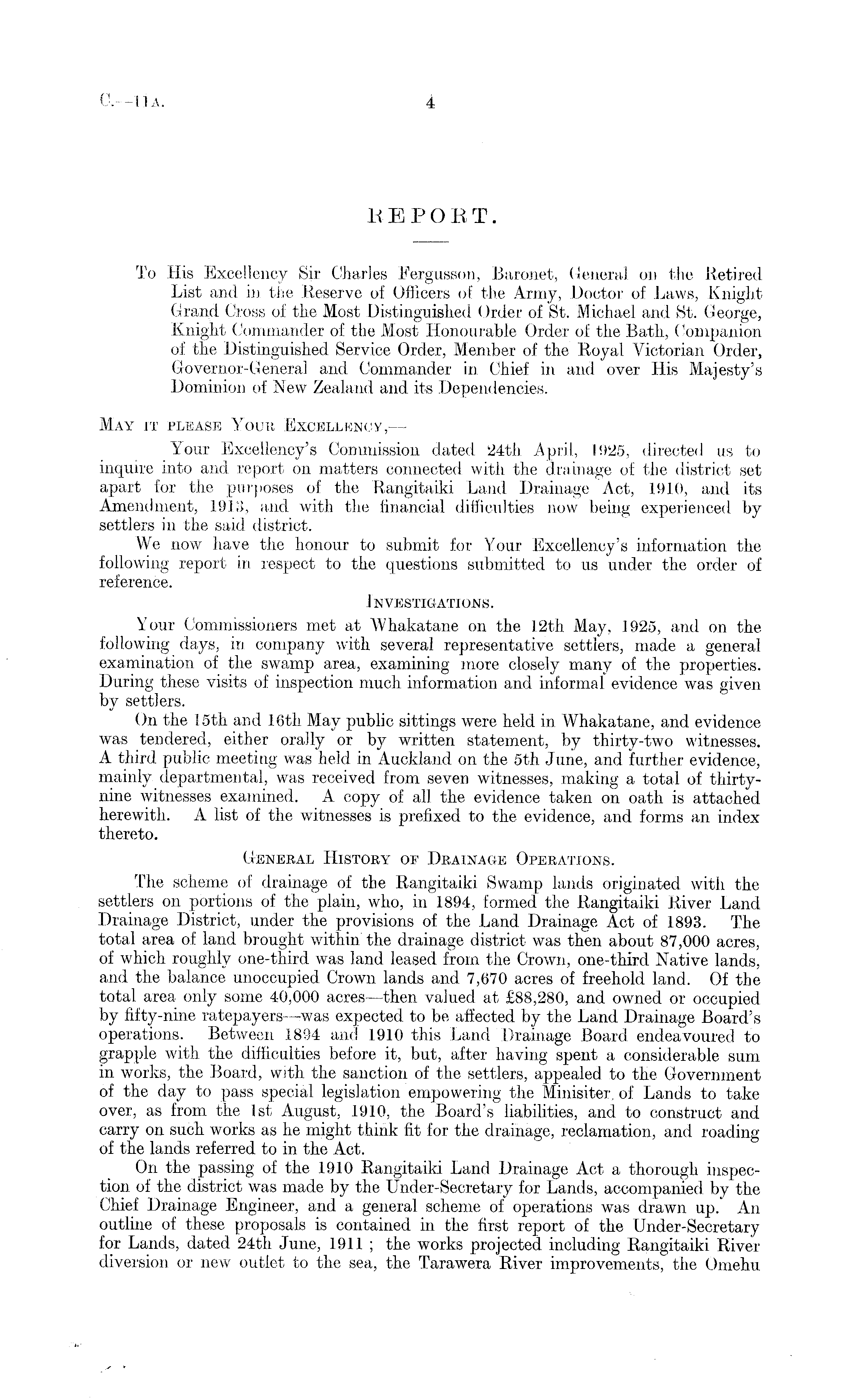 BEPOR T. To His Excellency Sir Charles Fergusson, Baronet, General on the Retired List and in the Reserve of Officers of the Army, Doctor of Laws, Knight Grand Cross of the Most Distinguished Order of St. Michael and St. George, Knight Commander of the Most Honourable Order of the Bath, ('ompanion of the Distinguished Service Order, Member of the Royal Victorian Order, Governor-General and Commander in Chief in and over His Majesty's Dominion of New Zealand and its Dependencies. May it please Your Excellency,— Your Excellency's Commission dated 24th April, I 925, directed us to inquire into and report on matters connected with the drainage of the district set apart for the purposes of the Rangitaiki Land Drainage Act, 1910, and its Amendment, 1913, and with the financial difficulties now being experienced by settlers in the said district. We now have the honour to submit for Your Excellency's information the following report in respect to the questions submitted to us under the order of reference. Investigations. Your Commissioners met at Whakatane on the 12th May, 1925, and on the following days, in company with several representative settlers, made a general examination of the swamp area, examining more closely many of the properties. During these visits of inspection much information and informal evidence was given by settlers. On the 15th and 16th May public sittings were held in Whakatane, and evidence was tendered, either orally or by written statement, by thirty-two witnesses. A third public meeting was held in Auckland on the sth June, and further evidence, mainly departmental, was received from seven witnesses, making a total of thirtynine witnesses examined. A copy of all the evidence taken on oath is attached herewith. A list of the witnesses is prefixed to the evidence, and forms an index thereto. General History of Drainage Operations. The scheme of drainage of the Rangitaiki Swamp lands originated with the settlers on portions of the plain, who, in 1894, formed the Rangitaiki River Land Drainage District, under the provisions of the Land Drainage Act of 1893. The total area of land brought within the drainage district was then about 87,000 acres, of which roughly one-third was land leased from the Crown, one-third Native lands, and the balance unoccupied Crown lands and 7,070 acres of freehold land. Of the total area only some 40,000 acres —then valued at £88,280, and owned or occupied by fifty-nine ratepayers—was expected to be affected by the Land Drainage Board's operations. Between 1894 and 1910 this Land Drainage Board endeavoured to grapple with the difficulties before it, but, after having spent a considerable sum in works, the Board, with the sanction of the settlers, appealed to the Government of the day to pass special legislation empowering the Minisiter, of Lands to take over, as from the Ist August, 1910, the Board's liabilities, and to construct and carry on such works as he might think fit for the drainage, reclamation, and roading of the lands referred to in the Act. On the passing of the 1910 Rangitaiki Land Drainage Act a thorough inspection of the district was made by the Under-Secretary for Lands, accompanied by the Chief Drainage Engineer, and a general scheme of operations was drawn up. An outline of these proposals is contained in the first report of the Under-Secretary for Lands, dated 24th June, 1911 ; the works projected including Rangitaiki River diversion or new outlet to the sea, the Tarawera River improvements, the Omehu