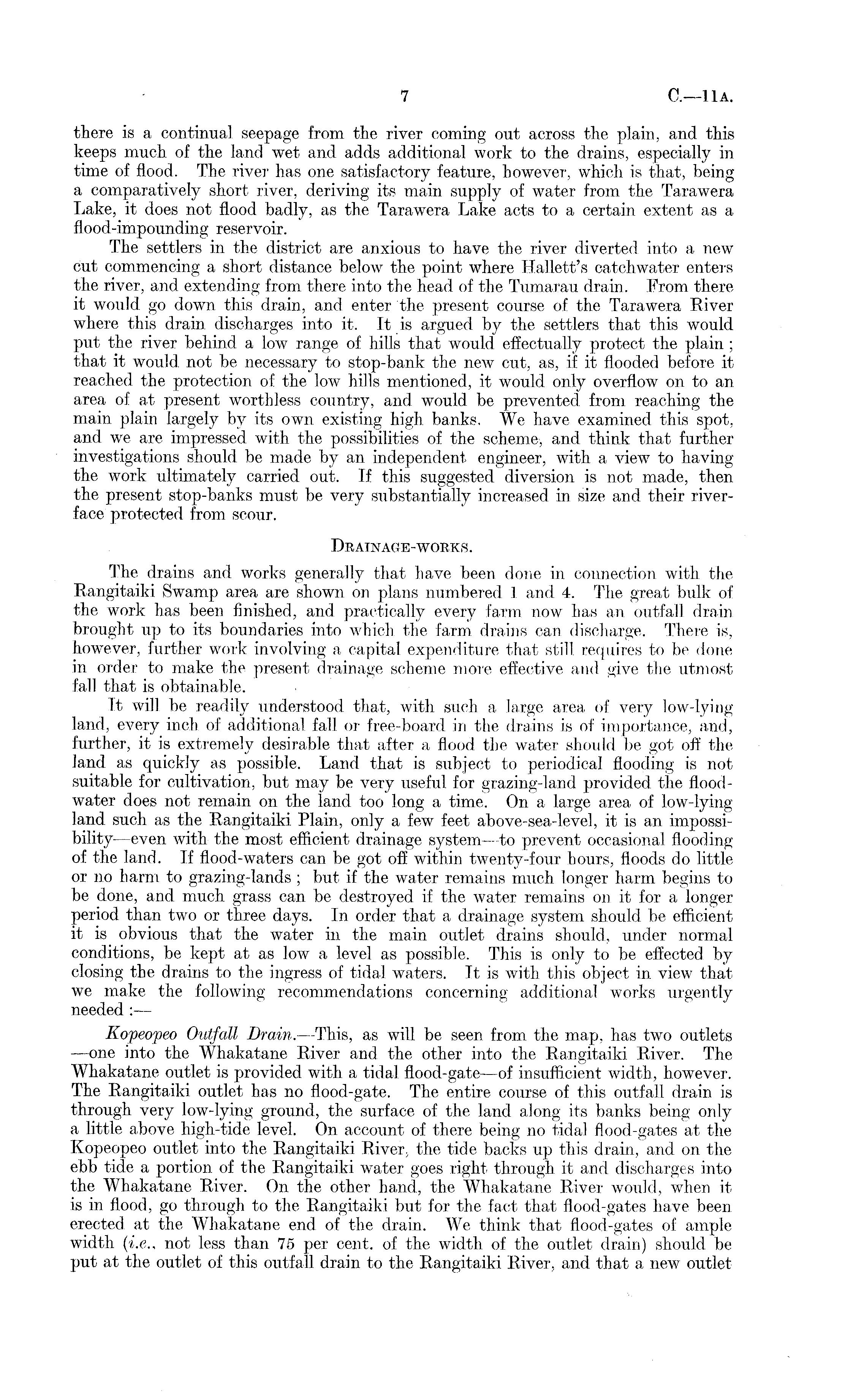 there is a continual seepage from the river coming out across the plain, and this keeps much of the land wet and adds additional work to the drains, especially in time of flood. The river has one satisfactory feature, however, which is that, being a comparatively short river, deriving its main supply of water from the Tarawera Lake, it does not flood badly, as the Tarawera Lake acts to a certain extent as a flood-impounding reservoir. The settlers in the district are anxious to have the river diverted into a new cut commencing a short distance below the point where Hallett's catchwater enters the river, and extending from there into the head of the Tumarau drain. From there it would go down this drain, and enter the present course of the Tarawera River where this drain discharges into it. It is argued by the settlers that this would put the river behind a low range of hills that would effectually protect the plain ; that it would not be necessary to stop-bank the new cut, as, if it flooded before it reached the protection of the low hills mentioned, it would only overflow on to an area of at present worthless country, and would be prevented from reaching the main plain largely by its own existing high banks. We have examined this spot, and we are impressed with the possibilities of the scheme, and think that further investigations should be made by an independent engineer, with a view to having the work ultimately carried out. If this suggested diversion is not made, then the present stop-banks must be very substantially increased in size and their riverface protected from scour. Drainage - works . The drains and works generally that have been done in connection with the Rangitaiki Swamp area are shown on plans numbered 1 and 4. The great bulk of the work has been finished, and practically every farm now has an outfall drain brought up to its boundaries into which the farm drains can discharge. There is, however, further work involving a capital expenditure that still requires to be done in order to make the present drainage scheme more effective and give the utmost fall that is obtainable. It will be readily understood that, with such a large area of very low-lying land, every inch of additional fall or free-board in the drains is of importance, and, further, it is extremely desirable that after a flood the water should be got off the land as quickly as possible. Land that is subject to periodical flooding is not suitable for cultivation, but may be very useful for grazing-land provided the floodwater does not remain on the land too long a time. On a large area of low-lying land such as the Rangitaiki Plain, only a few feet above-sea-level, it is an impossibility—even with the most efficient drainage system—to prevent occasional flooding of the land. If flood-waters can be got off within twenty-four hours, floods do little or no harm to grazing-lands ; but if the water remains much longer harm begins to be done, and much grass can be destroyed if the water remains on it for a longer period than two or three days. In order that a drainage system should be efficient it is obvious that the water in the main outlet drains should, under normal conditions, be kept at as low a level as possible. This is only to be effected by closing the drains to the ingress of tidal waters. It is with this object in view that we make the following recommendations concerning additional works urgently needed :■ — Kopeojieo Outfall Drain.—This, as will be seen from the map. has two outlets —one into the Whakatane River and the other into the Rangitaiki River. The Whakatane outlet is provided with a tidal flood-gate—of insufficient width, however. The Rangitaiki outlet has no flood-gate. The entire course of this outfall drain is through very low-lying ground, the surface of the land along its banks being only a little above high-tide level. On account of there being no tidal flood-gates at the Kopeopeo outlet into the Rangitaiki River, the tide backs up this drain, and on the ebb tide a portion of the Rangitaiki water goes right through it and discharges into the Whakatane River. On the other hand, the Whakatane River would, when it is in flood, go through to the Rangitaiki but for the fact that flood-gates have been erected at the Whakatane end of the drain. We think that flood-gates of ample width {i.e., not less than 75 per cent, of the width of the outlet drain) should be put at the outlet of this outfall drain to the Rangitaiki River, and that a new outlet