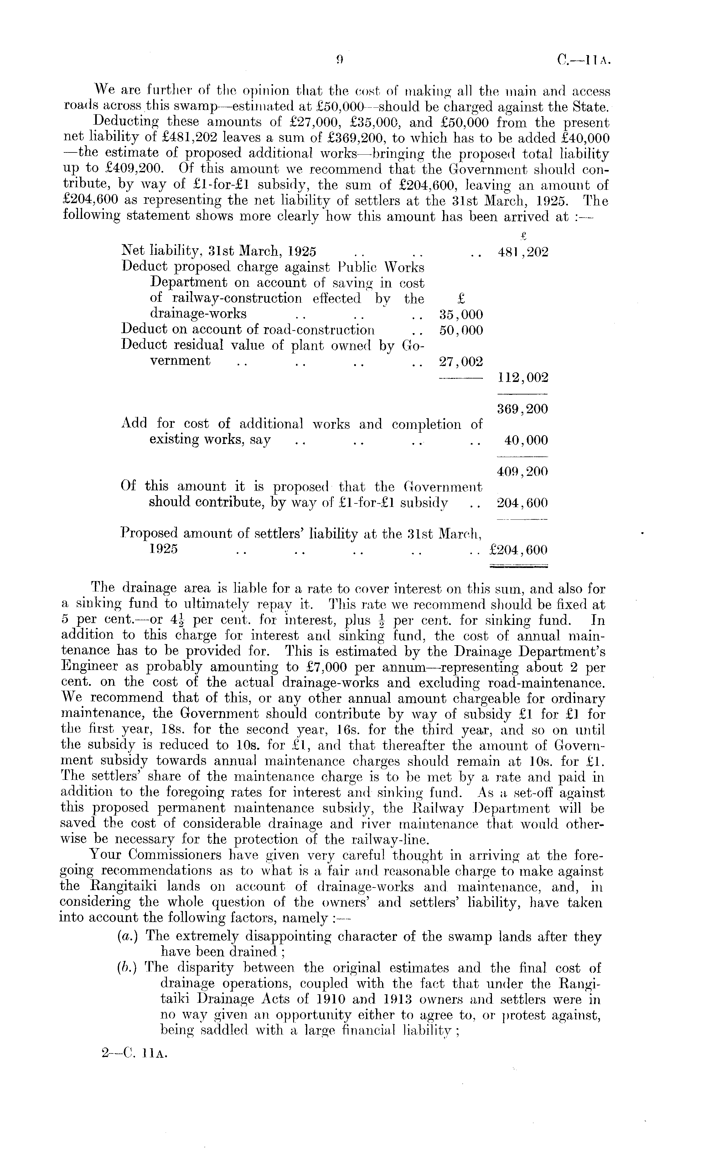 We are further of the opinion that the cost of making all the main and access roads across this swamp —estimated at £50,000 —should be charged against the State. Deducting these amounts of £27,000, £35,000, and £50,000 from the present net liability of £481,202 leaves a sum of £369,200, to which has to be added £40,000 —the estimate of proposed additional works —bringing the proposed total liability up to £409,200. Of this amount we recommend that the Government should contribute, by way of £l-for-£l subsidy, the sum of £204,600, leaving an amount of £204,600 as representing the net liability of settlers at the 31st March, 1925. The following statement shows more clearly how this amount has been arrived at : — £ Net liability, 31st March, 1925 .. .. .. 481,202 Deduct proposed charge against Public Works Department on account of saving in cost of railway-construction effected by the £ drainage-works . . . . . . 35,000 Deduct on account of road-construction .. 50,000 Deduct residua] value of plant owned by Government . . .. .. .. 27,002 112,002 369,200 Add for cost of additional works and completion of existing works, say .. .. .. .. 40,000 409,200 Of this amount it is proposed that the Government should contribute, by way of £l-for-£l subsidv .. 204,600 Proposed amount of settlers' liability at the 31st March, 1925 . . .. .. .. .. £204,600 The drainage area is liable for a rate to cover interest on this sum, and also for a sinking fund to ultimately repay it. This rate we recommend should be fixed at 5 per cent. —or 4| per cent, for interest, plus J per cent, for sinking fund. In addition to this charge for interest and sinking fund, the cost of annual maintenance has to be provided for. This is estimated by the Drainage Department's Engineer as probably amounting to £7,000 per annum —representing about 2 per cent, on the cost of the actual drainage-works and excluding road-maintenance. We recommend that of this, or any other annual amount chargeable for ordinary maintenance, the Government should contribute by way of subsidy £l for £l for the first year, 18s. for the second year, 16s. for the third year, and so on until the subsidy is reduced to 10s. for £l, and that thereafter the amount of Government subsidy towards annual maintenance charges should remain at 10s. for £1. The settlers' share of the maintenance charge is to be met by a rate and paid in addition to the foregoing rates for interest and sinking fund. As a set-off against this proposed permanent maintenance subsidy, the Railway Department will be saved the cost of considerable drainage and river maintenance that would otherwise be necessary for the protection of the railway-line. Your Commissioners have given very careful thought in arriving at the foregoing recommendations as to what is a fair and reasonable charge to make against the Rangitaiki lands on account of drainage-works and maintenance, and, in considering the whole question of the owners' and settlers' liability, have taken into account the following factors, namely : — (a.) The extremely disappointing character of the swamp lands after they have been drained ; (b.) The disparity between the original estimates and the final cost of drainage operations, coupled with the fact that under the Rangitaiki Drainage Acts of 1910 and 1913 owners and settlers were in no way given an opportunity either to agree to, or protest against, being saddled with a large financial liability;