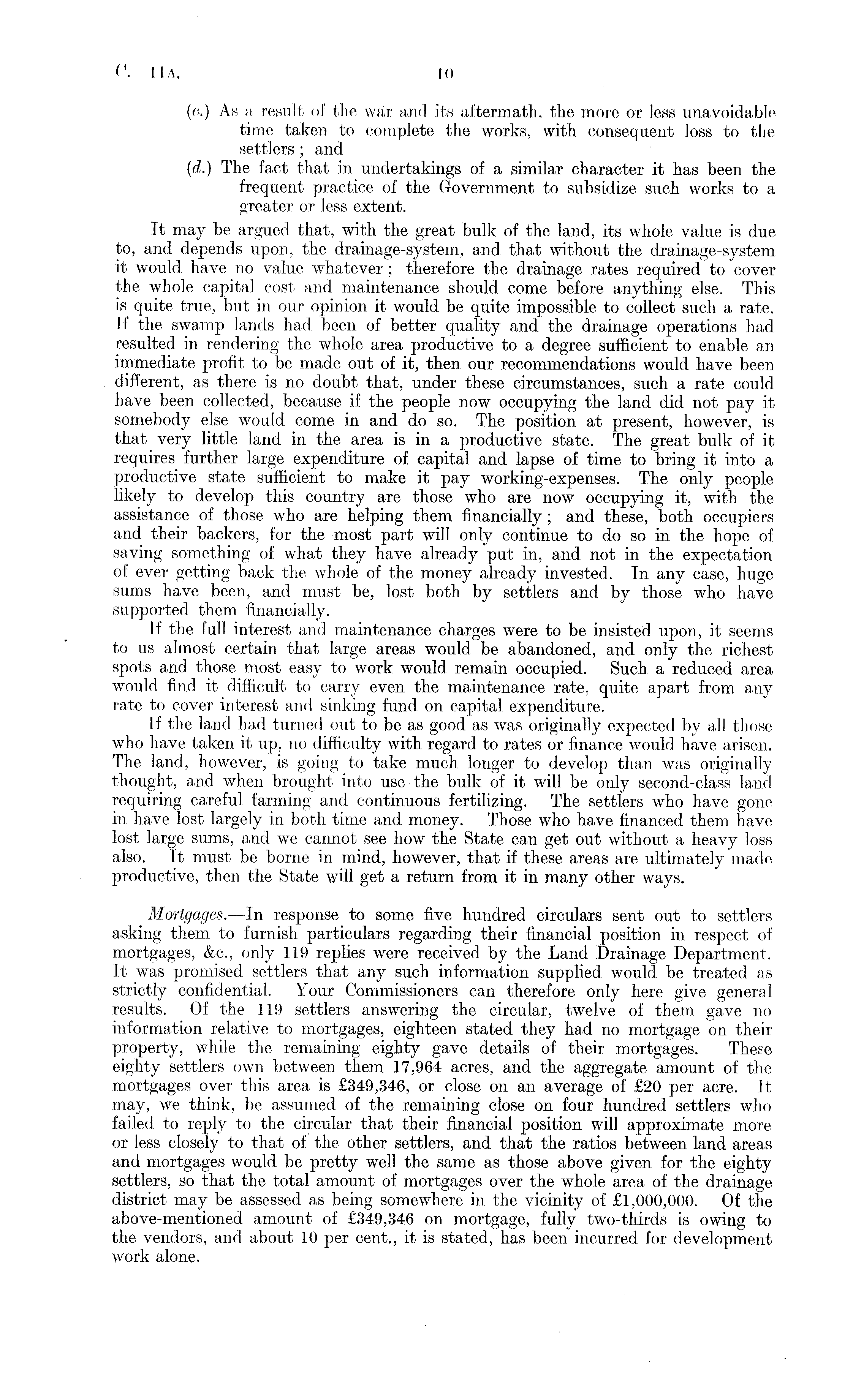 (e.) As a result of the war and its aftermath, the more or less unavoidable time taken to complete the works, with consequent loss to the settlers ; and (d.) The fact that in undertakings of a similar character it has been the frequent practice of the Government to subsidize such works to a greater or less extent. Tt may be argued that, with the great bulk of the land, its whole value is due to, and depends upon, the drainage-system, and that without the drainage-system it would have no value whatever ; therefore the drainage rates required to cover the whole capital cost and maintenance should come before anything else. This is quite true, but in our opinion it would be quite impossible to collect such a rate. If the swamp lands had been of better quality and the drainage operations had resulted in rendering the whole area productive to a degree sufficient to enable an immediate profit to be made out of it, then our recommendations would have been different, as there is no doubt that, under these circumstances, such a rate could have been collected, because if the people now occupying the land did not pay it somebody else would come in and do so. The position at present, however, is that very little land in the area is in a productive state. The great bulk of it requires further large expenditure of capital and lapse of time to bring it into a productive state sufficient to make it pay working-expenses. The only people likely to develop this country are those who are now occupying it, with the assistance of those who are helping them financially ; and these, both occupiers and their backers, for the most part will only continue to do so in the hope of saving something of what they have already put in, and not in the expectation of ever getting back the whole of the money already invested. In any case, huge sums have been, and must be, lost both by settlers and by those who have supported them financially. If the full interest and maintenance charges were to be insisted upon, it seems to us almost certain that large areas would be abandoned, and only the richest spots and those most easy to work would remain occupied. Such a reduced area would find it difficult to carry even the maintenance rate, quite apart from any rate to cover interest and sinking fund on capital expenditure. If the land had turned out to be as good as was originally expected by all those who have taken it up, no difficulty with regard to rates or finance would have arisen. The land, however, is going to take much longer to develop than was originally thought, and when brought into use the bulk of it will be only second-class land requiring careful farming and continuous fertilizing. The settlers who have gone in have lost largely in both time and money. Those who have financed them have lost large sums, and we cannot see how the State can get out without a heavy loss also. It must be borne in mind, however, that if these areas are ultimately made, productive, then the State will get a return from it in many other ways. Mortgages.—ln response to some five hundred circulars sent out to settlers asking them to furnish particulars regarding their financial position in respect of mortgages, &c., only 119 replies were received by the Land Drainage Department. It was promised settlers that any such information supplied would be treated as strictly confidential. Your Commissioners can therefore only here give general results. Of the 119 settlers answering the circular, twelve of them gave no information relative to mortgages, eighteen stated they had no mortgage on their property, while the remaining eighty gave details of their mortgages. These eighty settlers own between them 17,964 acres, and the aggregate amount of the mortgages over this area is £349,346, or close on an average of £20 per acre. It may, we think, be assumed of the remaining close on four hundred settlers who failed to reply to the circular that their financial position will approximate more or less closely to that of the other settlers, and that the ratios between land areas and mortgages would be pretty well the same as those above given for the eighty settlers, so that the total amount of mortgages over the whole area of the drainage district may be assessed as being somewhere in the vicinity of £1,000,000. Of the above-mentioned amount of £349,346 on mortgage, fully two-thirds is owing to the vendors, and about 10 per cent., it is stated, has been incurred for development work alone.