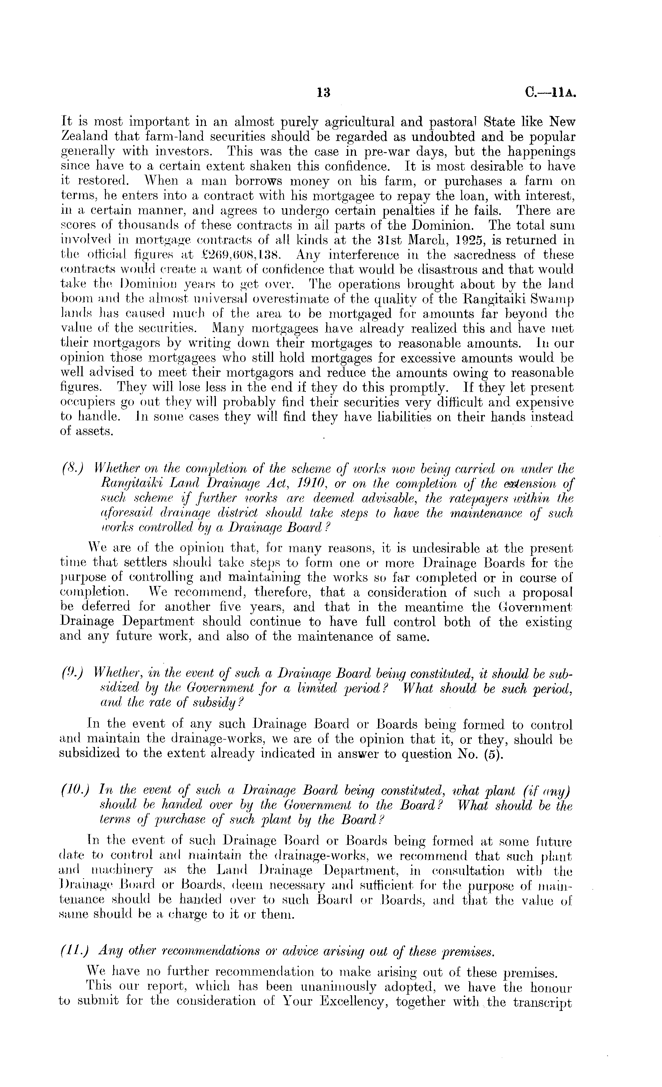 It is most important in an almost purely agricultural and pastoral State like New Zealand that farm-land securities should be regarded as undoubted and be popular generally with investors. This was the case in pre-war days, but the happenings since have to a certain extent shaken this confidence. It is most desirable to have it restored. When a man borrows money on his farm, or purchases a farm on terms, he enters into a contract with his mortgagee to repay the loan, with interest, in a certain manner, and agrees to undergo certain penalties if he fails. There are scores of thousands of these contracts in ail parts of the Dominion. The total sum involved in mortgage contracts of all kinds at the 31st March, 1925, is returned in the official figures at £269,608,138. Any interference in the sacredness of these contracts would create a want of confidence that would be disastrous and that would take the Dominion years to get over. The. operations brought about by the land boom and the almost universal overestimate of the quality of the Rangitaiki Swamp lands has caused much of the area to be mortgaged for amounts far beyond the value of the securities. Many mortgagees have already realized this and have met their mortgagors by writing down their mortgages to reasonable amounts. In our opinion those mortgagees who still hold mortgages for excessive amounts would be well advised to meet their mortgagors and reduce the amounts owing to reasonable figures. They will lose less in the end if they do this promptly. If they let present occupiers go out they will probably find their securities very difficult and expensive to handle. In some cases they will find they have liabilities on their hands instead of assets. (8.) Whether on the completion of the scheme of works now being carried on under the Rangitaiki Land Drainage Act, 1910, or on the completion of the extension of such scheme if further works are deemed advisable, the ratepayers within the aforesaid drainage district should, take steps to have the maintenance of such ivorks controlled by a Drainage Board ? We are of the opinion that, for many reasons, it is undesirable at the present time that settlers should take steps to form one or more Drainage Boards for the purpose of controlling and maintaining the works so far completed or in course of completion. We recommend, therefore, that a consideration of such a proposal be deferred for another five years, and that in the meantime the Government Drainage Department should continue to have full control both of the existing and any future work, and also of the maintenance of same. (9.) Whether, in the event of such a Drainage Board being constituted, it should be subsidized by the Government for a limited period ? What should be such period, and the rate of subsidy ? In the event of any such Drainage Board or Boards being formed to control and maintain the drainage-works, we are of the opinion that it, or they, should be subsidized to the extent already indicated in answer to question No. (5). (10.) In the event of such a Drainage Board being constituted, what plant (if any) should be handed over by the Government to the Board ? What should be the terms of purchase of such plant by the Board ? In the event of such Drainage Board or Boards being formed at some future date to control and maintain the drainage-works, we recommend that such plant and machinery as the Land Drainage Department, in consultation with the Drainage Board or Boards, deem necessary and sufficient for the purpose of maintenance should be handed over to such Board or Boards, and that the value of same should be a charge to it or them. (11.) Any other recommendations or advice arising out of these premises. We have no further recommendation to make arising out of these premises. This our report, which has been unanimously adopted, we have the honour to submit for the consideration of Your Excellency, together with the transcript