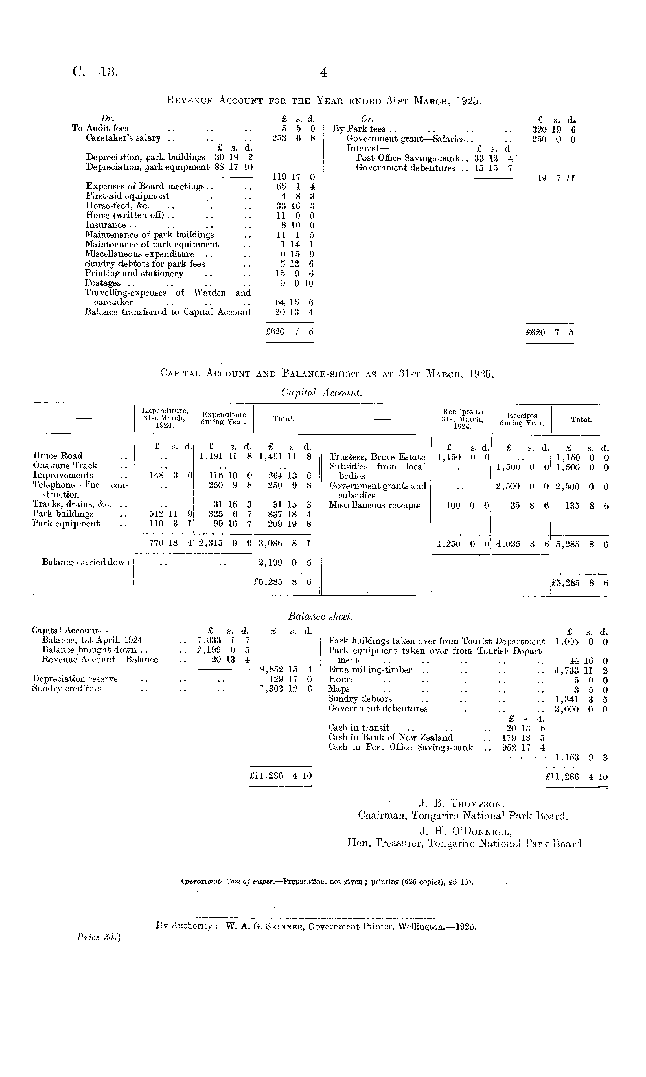 Balance-sheet. Capital Account— £ s. d. £ s. d. ; £ s. d. Balance, Ist April, 1924 .. 7,633 1 7 Park buildings taken over from Tourist Department 1,005 0 0 Balance brought down .. .. 2,199 0 5 J Park equipment taken over from Tourist DepartRevenue Account—Balance .. 20 13 4 ment .. .. .. .. .. 44 16 0 9,852 15 4 Erua milling-timber .. .. .. .. 4,733 11 2 Depreciation reserve .. .. .. 129 17 0 Horse .. .. .. .. .. 500 Sundry creditors .. .. .. 1,303 12 6 Maps .. .. .. .. .. 350 Sundry debtors .. .. .. 1,341 3 5 Government debentures .. .. .. 3,000 0 0 £ s. d. Cash in transit .. .. .. 20 13 6 Cash in Bank of New Zealand .. 179 18 5. Cash in Post Office Savings-bank .. 952 17 4 1,153 9 3 £11,286 4 10 £11,286 4 10 J. B. Thompson, Chairman, Tongariro National Park Board. J. H. O'Donnell, Hon. Treasurer, Tongariro National Park Board.