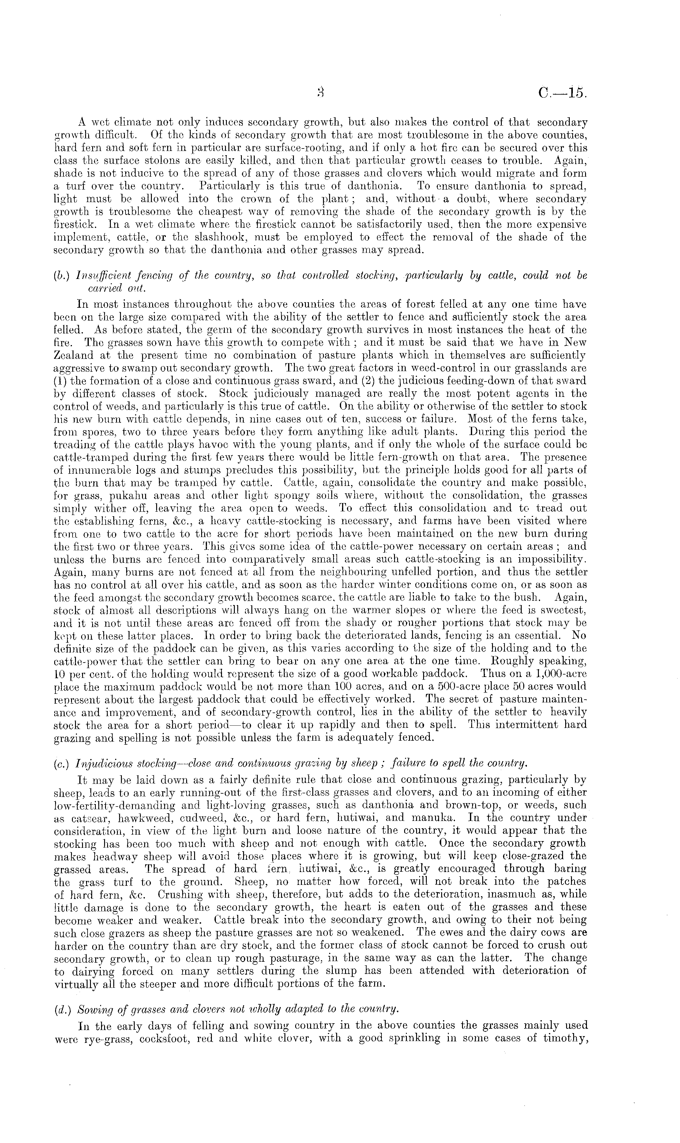 A wet climate not only induces secondary growth, but also makes the control of that secondary growth difficult. Of the kinds of secondary growth that are most troublesome in the above counties, hard fern and soft fern in particular are surface-rooting, and if only a hot fire can be secured over this class the surface stolons are easily killed, and then that particular growth ceases to trouble. Again, shade is not inducive to the spread of any of those grasses and clovers which would migrate and form a turf over the country. Particularly is this true of danthonia. To ensure danthonia to spread, light must be allowed into the crown of the plant; and, without ■ a doubt, where secondary growth is troublesome the cheapest way of removing the shade of the secondary growth is by the firestick. In a wet climate where the firestick cannot be satisfactorily used, then the more expensive implement, cattle, or the slashhook, must be employed to effect the removal of the shade of the secondary growth so that the danthonia and other grasses may spread. (b.) Insufficient fencing of the country, so that controlled stocking, particularly by cattle, could not be carried out. In most instances throughout the above counties the areas of forest felled at any one time have been on the large size compared with the ability of the settler to fence and sufficiently stock the area felled. As before stated, the germ of the secondary growth survives in most instances the heat of the fire. The grasses sown have this growth to compete with ; and it must be said that we have in New Zealand at the present time no combination of pasture plants which in themselves are sufficiently aggressive to swamp out secondary growth. The two great factors in weed-control in our grasslands are (1) the formation of a close and continuous grass sward, and (2) the judicious feeding-down of that sward by different classes of stock. Stock judiciously managed are really the most potent agents in the control of weeds, and particularly is this true of cattle. On the ability or otherwise of the settler to stock his new burn with cattle depends, in nine cases out of ten, success or failure. Most of the ferns take, from spores, two to three years before they form anything like adult plants. During this period the treading of the cattle plays havoc with the young plants, and if only the whole of the surface could be cattle-tramped during the first few years there would be little fern-growth on that area. The presenee of innumerable logs and stumps precludes this possibility, but the principle holds good for all parts of the burn that may be tramped by cattle. Cattle, again, consolidate the country and make possible, for grass, pukahu areas and other light spongy soils where, without the consolidation, the grasses simply wither off, leaving the area open to weeds. To effect this consolidation and to tread out the establishing ferns, &c., a heavy cattle-stocking is necessary, and farms have been visited where from one to two cattle to the acre for short periods have been maintained on the new burn during the first two or three years. This gives some idea of the cattle-power necessary on certain areas ; and unless the burns are fenced into comparatively small areas such cattle-stocking is an impossibility. Again, many burns are not fenced at all from the neighbouring unfelled portion, and thus the settler has no control at all over his cattle, and as soon as the harder winter conditions come on, or as soon as the feed amongst the secondary growth becomes scarce, the cattle are liable to take to the bush. Again, stock of almost all descriptions will always hang on the warmer slopes or where the feed is sweetest, and it is not until these areas are fenced off from the shady or rougher portions that stock may be kept on these latter places. In order to bring back the deteriorated lands, fencing is an essential. No definite size of the paddock can be given, as this varies according to the size of the holding and to the cattle-power that the settler can bring to bear on any one area at the one time. Roughly speaking, 10 per cent, of the holding would represent the size of a good workable paddock. Thus on a 1,000-acre place the maximum paddock would be not more than 100 acres, and on a 500-acre place 50 acres would represent about the largest paddock that could be effectively worked. The secret of pasture maintenance and improvement, and of secondary-growth control, lies in the ability of the settler to heavily stock the area for a short period —to clear it up rapidly and then to spell. This intermittent hard grazing and spelling is not possible unless the farm is adequately fenced. (c.) Injudicious stocking —close and continuous grazing by sheep ; failure to spell the country. It may be laid down as a fairly definite rule that close and continuous grazing, particularly by sheep, leads to an early running-out of the first-class grasses and clovers, and to an incoming of either low-fertility-demanding and light-loving grasses, such as danthonia and brown-top, or weeds, such as catsear, hawkweed, cudweed, &c., or hard fern, hutiwai, and manuka. In the country under consideration, in view of the light burn and loose nature of the country, it would appear that the stocking has been too much with sheep and not enough with cattle. Once the secondary growth makes headway sheep will avoid those places where it is growing, but will keep close-grazed the grassed areas. The spread of hard iern. hutiwai, &c., is greatly encouraged through baring the grass turf to the ground. Sheep, no matter how forced, will not break into the patches of hard fern, &c. Crushing with sheep, therefore, but adds to the deterioration, inasmuch as, while little damage is done to the secondary growth, the heart is eaten out of the grasses and these become weaker and weaker. Cattle break into the secondary growth, and owing to their not being such close grazers as sheep the pasture gr
