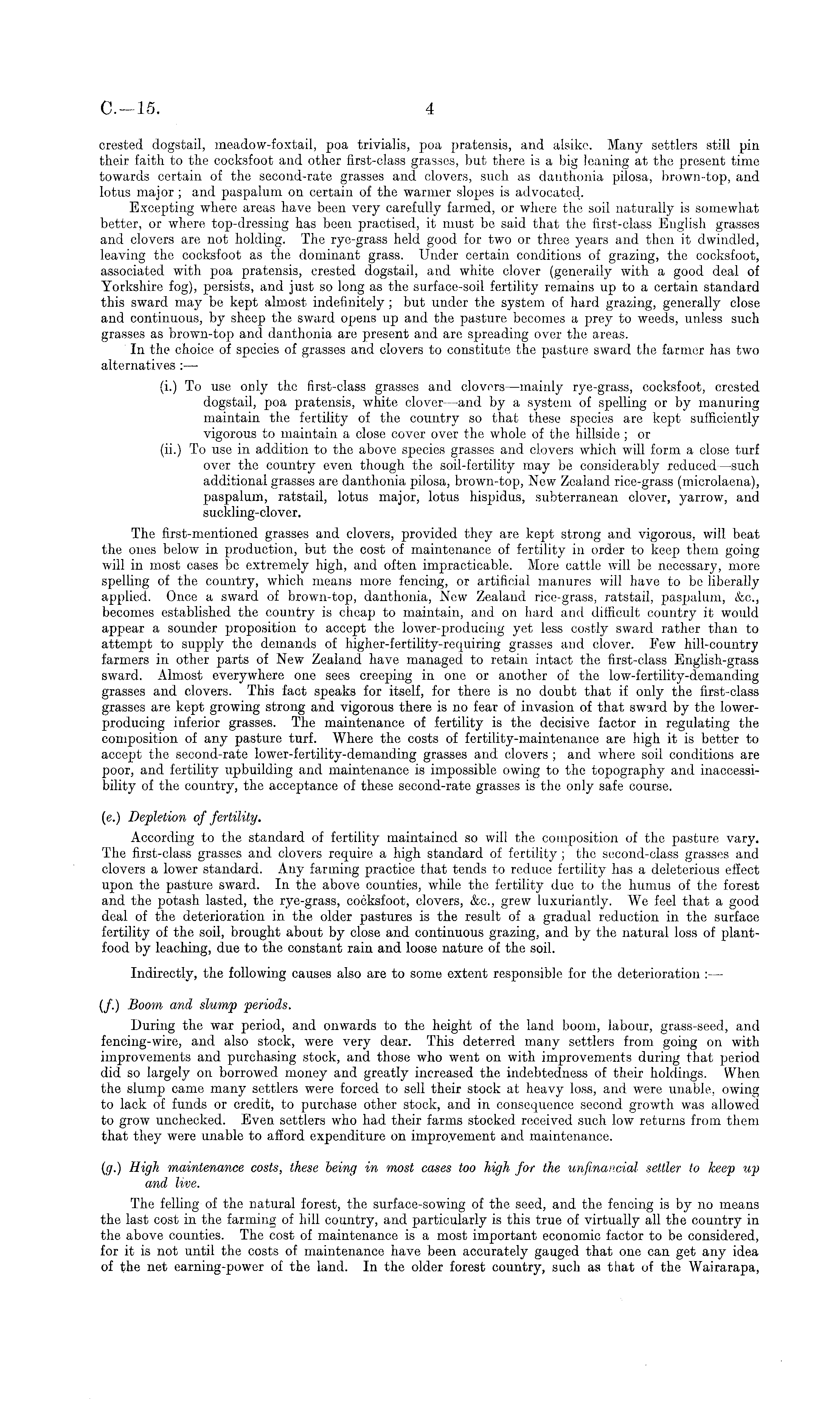 crested dogstail, meadow-foxtail, poa trivialis, poa pratensis, and alsikc. Many settlers still pin their faith to the cocksfoot and other first-class grasses, but there is a big leaning at the present time towards certain of the second-rate grasses and clovers, such as danthonia pilosa, brown-top, and lotus major; and paspalum on certain of the warmer slopes is advocated. Excepting where areas have been very carefully farmed, or where the soil naturally is somewhat better, or where top-dressing has been practised, it must be said that the first-class English grasses and clovers are not holding. The rye-grass held good for two or three years and then it dwindled, leaving the cocksfoot as the dominant grass. Under certain conditions of grazing, the cocksfoot, associated with poa pratensis, crested dogstail, and white clover (generally with a good deal of Yorkshire fog), persists, and just so long as the surface-soil fertility remains up to a certain standard this sward may be kept almost indefinitely ; but under the system of hard grazing, generally close and continuous, by sheep the sward opens up and the pasture becomes a prey to weeds, unless such grasses as brown-top and danthonia are present and are spreading over the areas. In the choice of species of grasses and clovers to constitute the pasture sward the farmer has two alternatives (i.) To use only the first-class grasses and clovers —mainly rye-grass, cocksfoot, crested dogstail, poa pratensis, white clover —and by a system of spelling or by manuring maintain the fertility of the country so that these species are kept sufficiently vigorous to maintain a close cover over the whole of the hillside ; or (ii.) To use in addition to the above species grasses and clovers which will form a close turf over the country even though the soil-fertility may be considerably reduced —such additional grasses are danthonia pilosa, brown-top, New Zealand rice-grass (microlaena), paspalum, ratstail, lotus major, lotus hispidus, subterranean clover, yarrow, and suckling-clover. The first-mentioned grasses and clovers, provided they are kept strong and vigorous, will beat the ones below in production, but the cost of maintenance of fertility in order to keep them going will in most cases be extremely high, and often impracticable. More cattle will be necessary, more spelling of the country, which means more fencing, or artificial manures will have to be liberally applied. Once a sward of brown-top, danthonia, New Zealand rice-grass, ratstail, paspalum, &c., becomes established the country is cheap to maintain, and on hard and difficult country it would appear a sounder proposition to accept the lower-producing yet less costly sward rather than to attempt to supply the demands of higher-fertility-requiring grasses and clover. Few hill-country farmers in other parts of New Zealand have managed to retain intact the first-class English-grass sward. Almost everywhere one sees creeping in one or another of the low-fertility-demanding grasses and clovers. This fact speaks for itself, for there is no doubt that if only the first-class grasses are kept growing strong and vigorous there is no fear of invasion of that sward by the lowerproducing inferior grasses. The maintenance of fertility is the decisive factor in regulating the composition of any pasture turf. Where the costs of fertility-maintenance are high it is better to accept the second-rate lower-fertility-demanding grasses and clovers ; and where soil conditions are poor, and fertility upbuilding and maintenance is impossible owing to the topography and inaccessibility of the country, the acceptance of these second-rate grasses is the only safe course. (e.) Depletion of fertility. According to the standard of fertility maintained so will the composition of the pasture vary. The first-class grasses and clovers require a high standard of fertility ; the second-class grasses and clovers a lower standard. Any farming practice that tends to reduce fertility has a deleterious effect upon the pasture sward. In the above counties, while the fertility due to the humus of the forest and the potash lasted, the rye-grass, cocksfoot, clovers, &c., grew luxuriantly. We feel that a good deal of the deterioration in the older pastures is the result of a gradual reduction in the surface fertility of the soil, brought about by close and continuous grazing, and by the natural loss of plantfood by leaching, due to the constant rain and loose nature of the soil. Indirectly, the following causes also are to some extent responsible for the deterioration :— (/.) Boom and slump periods. During the war period, and onwards to the height of the land boom, labour, grass-seed, and fencing-wire, and also stock, were very dear. This deterred many settlers from going on with improvements and purchasing stock, and those who went on with improvements during that period did so largely on borrowed money and greatly increased the indebtedness of their holdings. When the slump came many settlers were forced to sell their stock at heavy loss, and were unable, owing to lack of funds or credit, to purchase other stock, and in consequence second growth was allowed to grow unchecked. Even settlers who had their farms stocked received such low returns from them that they were unable to afford expenditure on improvement and maintenance. (g.) High maintenance costs, these being in most cases too high for the unfinancial settler to keep up and live. The felling of the natural forest, the surface-sowing of the seed, and the fencing is by no means the last cost in the farming of hill country, and particularly is this true of virtually all the country in the above counties. The cost of maintenance is a most important economic factor to be considered, for it is not until the costs of maintenance have been accurately gauged that one can get any idea of the net earning-power of the land. In the older forest country, such as that of the Wairarap