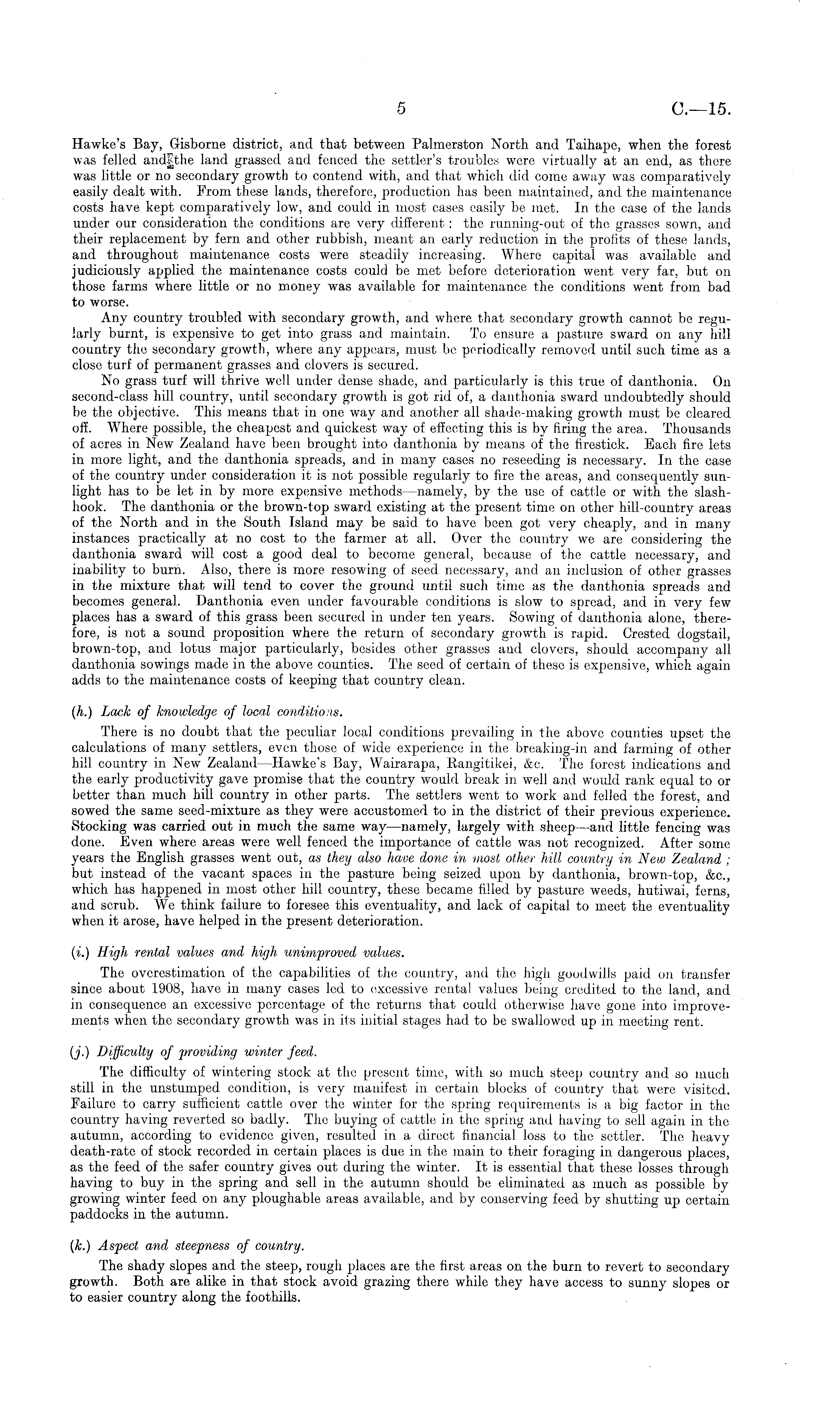 Hawke's Bay, Gisborne district, and that between Palmerston North and Taihape, when the forest was felled and|the land grassed and fenced the settler's troubles were virtually at an end, as there was little or no secondary growth to contend with, and that which did come away was comparatively easily dealt with. From these lands, therefore, production has been maintained, and the maintenance costs have kept comparatively low, and could in most cases easily be met. In the case of the lands under our consideration the conditions are very different : the running-out of the grasses sown, and their replacement by fern and other rubbish, meant an early reduction in the profits of these lands, and throughout maintenance costs were steadily increasing. Where capital was available and judiciously applied the maintenance costs could be met before deterioration went very far, but on those farms where little or no money was available for maintenance the conditions went from bad to worse. Any country troubled with secondary growth, and where that secondary growth cannot be regularly burnt, is expensive to get into grass and maintain. To ensure a pasture sward on any hill country the secondary growth, where any appears, must be periodically removed until such time as a close turf of permanent grasses and clovers is secured. No grass turf will thrive well under dense shade, and particularly is this true of danthonia. On second-class hill country, until secondary growth is got rid of, a danthonia sward undoubtedly should be the objective. This means that in one way and another all shade-making growth must be cleared off. Where possible, the cheapest and quickest way of effecting this is by firing the area. Thousands of acres in New Zealand have been brought into danthonia by means of the firestick. Each fire lets in more light, and the danthonia spreads, and in many cases no reseeding is necessary. In the case of the country under consideration it is not possible regularly to fire the areas, and consequently sunlight has to be let in by more expensive methods —namely, by the use of cattle or with the slashhook. The danthonia or the brown-top sward existing at the present time on other hill-country areas of the North and in the South Island may be said to have been got very cheaply, and in many instances practically at no cost to the farmer at all. Over the country we are considering the danthonia sward will cost a good deal to become general, because of the cattle necessary, and inability to burn. Also, there is more resowing of seed necessary, and an inclusion of other grasses in the mixture that will tend to cover the ground until such time as the danthonia spreads and becomes general. Danthonia even under favourable conditions is slow to spread, and in very few places has a sward of this grass been secured in under ten years. Sowing of danthonia alone, therefore, is not a sound proposition where the return of secondary growth is rapid. Crested dogstail, brown-top, and lotus major particularly, besides other grasses and clovers, should accompany all danthonia sowings made in the above counties. The seed of certain of these is expensive, which again adds to the maintenance costs of keeping that country clean. (h.) Lack of knowledge of local conditions. There is no doubt that the peculiar local conditions prevailing in the above counties upset the calculations of many settlers, even those of wide experience in the breaking-in and farming of other hill country in New Zealand —Hawke's Bay, Wairarapa, Rangitikei, &c. The forest indications and the early productivity gave promise that the country would break in well and would rank equal to or better than much hill country in other parts. The settlers went to work and felled the forest, and sowed the same seed-mixture as they were accustomed to in the district of their previous experience. Stocking was carried out in much the same way —namely, largely with sheep—-and little fencing was done. Even where areas were well fenced the importance of cattle was not recognized. After some years the English grasses went out, as they also have done in most other hill country in New Zealand ; but instead of the vacant spaces in the pasture being seized upon by danthonia, brown-top, &c., which has happened in most other hill country, these became filled by pasture weeds, hutiwai, ferns, and scrub. We think failure to foresee this eventuality, and lack of capital to meet the eventuality when it arose, have helped in the present deterioration. (i.) High rental values and high unimproved values. The overestimation of the capabilities of the country, and the high goodwills paid on transfer since about 1908, have in many cases led to excessive rental values being credited to the land, and in consequence an excessive percentage of the returns that could otherwise have gone into improvements when the secondary growth was in its initial stages had to be swallowed up in meeting rent. (j.) Difficulty of providing winter feed. The difficulty of wintering stock at the present time, with so much steep country and so much still in the unstumped condition, is very manifest in certain blocks of country that were visited. Failure to carry sufficient cattle over the winter for the spring requirements is a big factor in the country having reverted so badly. The buying of cattle in the spring and having to sell again in the autumn, according to evidence given, resulted in a direct financial loss to the settler. The heavy death-rate of stock recorded in certain places is due in the main to their foraging in dangerous places, as the feed of the safer country gives out during the winter. It is essential that these losses through having to buy in the spring and sell in the autumn should be eliminated as much as possible by growing winter feed on any ploughable areas available, and by conserving feed by shutting up certain paddocks in the autumn. (k.) Aspect and steepness of country. The 
