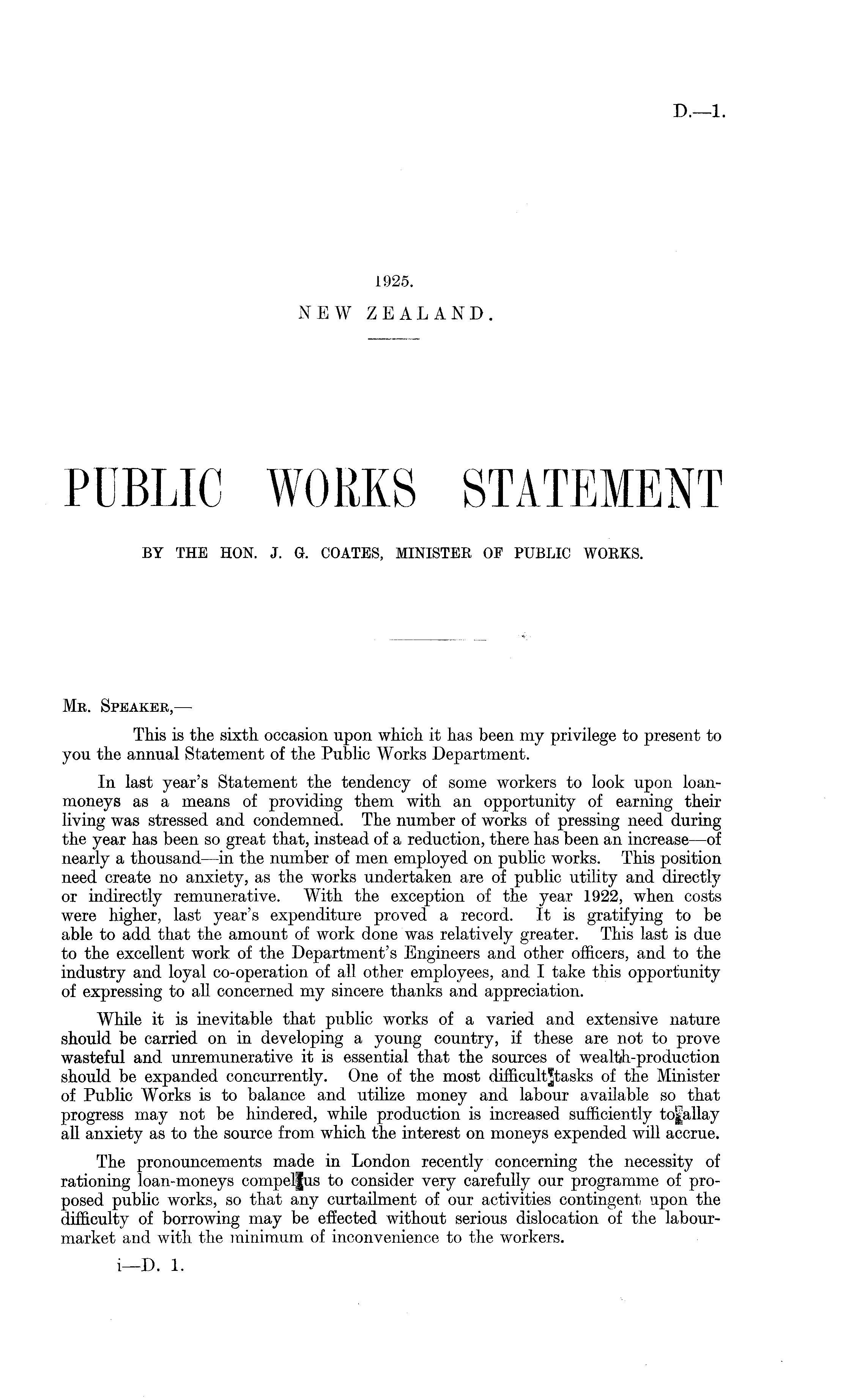 Me. Speaker,— This is the sixth occasion upon which it has been my privilege to present to you. the annual Statement of the Public Works Department. In last year's Statement the tendency of some workers to look upon loanmoneys as a means of providing them with an opportunity of earning their living was stressed and condemned. The number of works of pressing need during the year has been so great that, instead of a reduction, there has been an increase—of nearly a thousand—in the number of men employed on public works. This position need create no anxiety, as the works undertaken are of public utility and directly or indirectly remunerative. With the exception of the year 1922, when costs were higher, last year's expenditure proved a record. It is gratifying to be able to add that the amount of work done was relatively greater. This last is due to the excellent work of the Department's Engineers and other officers, and to the industry and loyal co-operation of all other employees, and I take this opportunity of expressing to all concerned my sincere thanks and appreciation. While it is inevitable that public works of a varied and extensive nature should be carried on in developing a young country, if these are not to prove wasteful and unremunerative it is essential that the sources of wealth-production should be expanded concurrently. One of the most difficult|tasks of the Minister of Public Works is to balance and utilize money and labour available so that progress may not be hindered, while production is increased sufficiently to|allay all anxiety as to the source from which the interest on moneys expended will accrue. The pronouncements made in London recently concerning the necessity of rationing loan-moneys compelfus to consider very carefully our programme of proposed public works, so that any curtailment of our activities contingent upon the difficulty of borrowing may be effected without serious dislocation of the labourmarket and with the minimum of inconvenience to the workers.