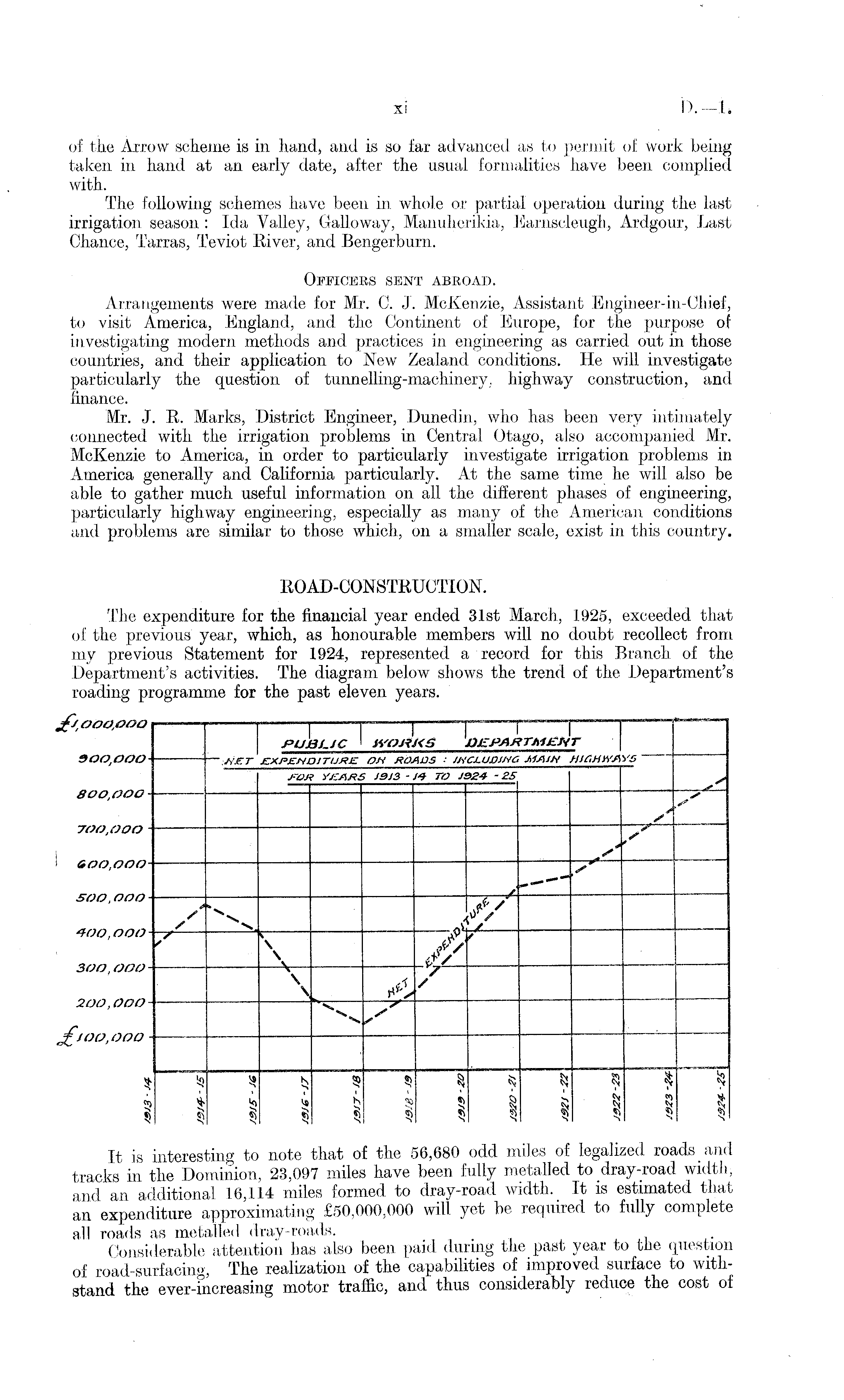 of the Arrow scheme is in hand, and is so far advanced as to permit of work being taken in hand at an early date, after the usual formalities have been complied with. The following schemes have been in whole or partial operation during the last irrigation season : Ida Valley, Galloway, Manuherikia, Earnscleugh, Ardgour, Last Chance, Tarras, Teviot River, and Bengerburn. Officers sent abroad. Arrangements were made for Mr. C. J. McKenzie, Assistant Engineer-in-Chief, to visit America, England, and the Continent of Europe, for the purpose of investigating modern methods and practices in engineering as carried out in those countries, and their application to New Zealand conditions. He will investigate particularly the question of tunnelling-machinery. highway construction, and finance. Mr. J. R. Marks, District Engineer, Dunedin, who has been very intimately connected with the irrigation problems in Central Otago, also accompanied Mr. McKenzie to America, in order to particularly investigate irrigation problems in America generally and California particularly. At the same time he will also be able to gather much useful information on all the different phases of engineering, particularly highway engineering, especially as many of the American conditions and problems are similar to those which, on a smaller scale, exist in this country. ROAD-CONSTRUCTION. The expenditure for the financial year ended 31st March, 1925, exceeded that of the previous year, which, as honourable members will no doubt recollect from my previous Statement for 1924, represented a record for this Branch of the Department's activities. The diagram below shows the trend of the Department's roading programme for the past eleven years.