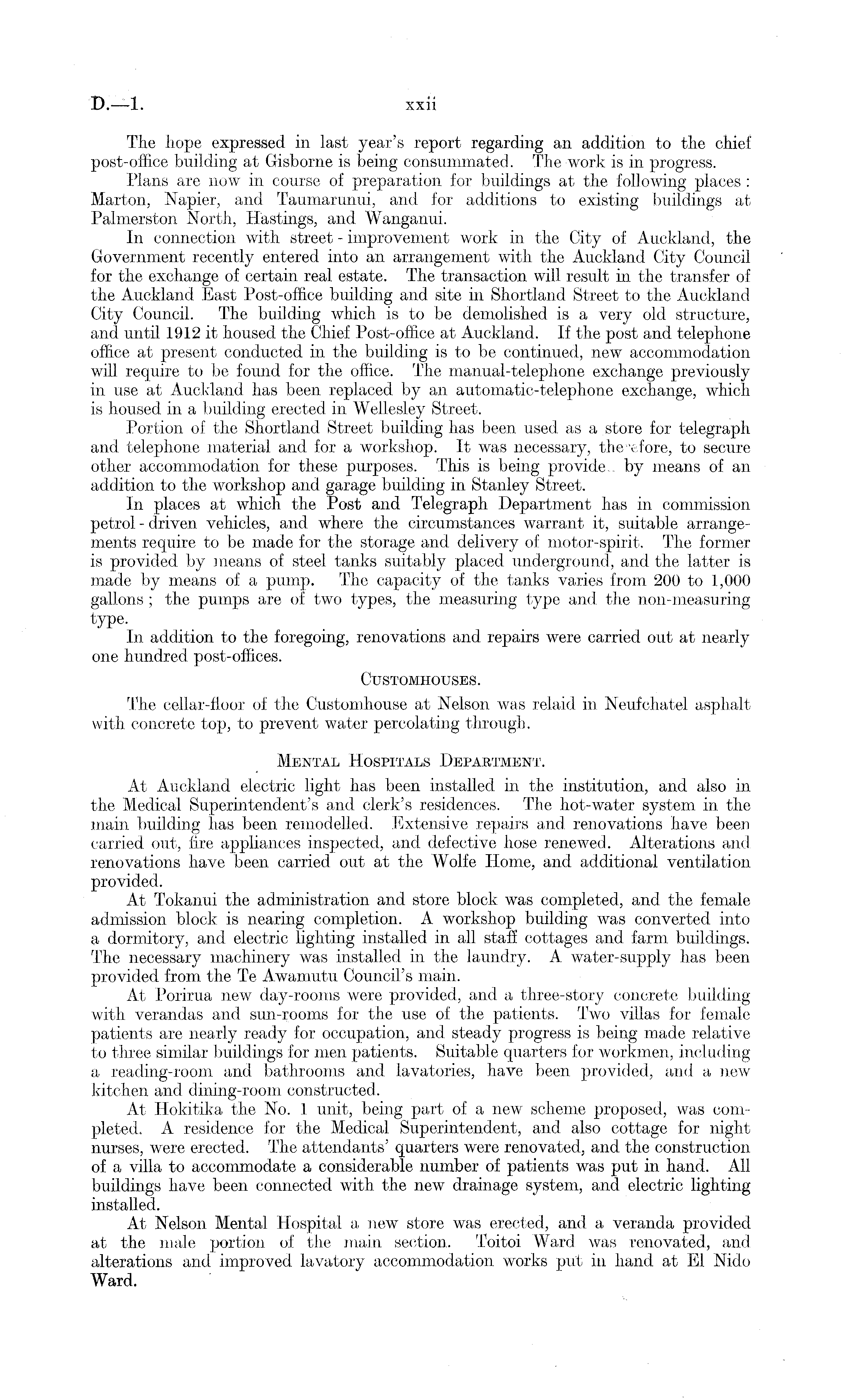 The liope expressed in last year's report regarding an addition to the chief post-office building at Gisborne is being consummated. The work is in progress. Plans are now in course of preparation for buildings at the following places : Marton, Napier, and Taumarunui, and for additions to existing buildings at Palmerston North, Hastings, and Wanganui. In connection with street - improvement work in the City of Auckland, the Government recently entered into an arrangement with the Auckland City Council for the exchange of certain real estate. The transaction will result in the transfer of the Auckland Bast Post-office building and site in Shortland Street to the Auckland City Council. The building which is to be demolished is a very old structure, and until 1912 it housed the Chief Post-office at Auckland. If the post and telephone office at present conducted in the building is to be continued, new accommodation will require to be found for the office. The manual-telephone exchange previously in use at Auckland has been replaced by an automatic-telephone exchange, which is housed in a building erected in Wellesley Street. Portion of the Shortland Street building has been used as a store for telegraph and telephone material and for a workshop. It was necessary, therefore, to secure other accommodation for these purposes. This is being provide, by means of an addition to the workshop and garage building in Stanley Street. In places at which the Post and Telegraph Department has in commission petrol - driven vehicles, and where the circumstances warrant it, suitable arrangements require to be made for the storage and delivery of motor-spirit. The former is provided by means of steel tanks suitably placed underground, and the latter is made by means of a pump. The capacity of the tanks varies from 200 to 1,000 gallons ; the pumps are of two types, the measuring type and the non-measuring tyP 6 - In addition to the foregoing, renovations and repairs were carried out at nearly one hundred post-offices. Customhouses. The cellar-floor of the Customhouse at Nelson was relaid in Neufchatel asphalt with concrete top, to prevent water percolating through. Mental Hospitals Department. At Auckland electric light has been installed in the institution, and also in the Medical Superintendent's and clerk's residences. The hot-water system in the main building lias been remodelled. Extensive repairs and renovations have been carried out, fire appliances inspected, and defective hose renewed. Alterations and renovations have been carried out at the Wolfe Home, and additional ventilation provided. At Tokanui the administration and store block was completed, and the female admission block is nearing completion. A workshop building was converted into a dormitory, and electric lighting installed in all staff cottages and farm buildings. The necessary machinery was installed in the laundry. A water-supply has been provided from the Te Awamutu Council's main. At Porirua new day-rooms were provided, and a three-story concrete building with verandas and sun-rooms for the use of the patients. Two villas for female patients are nearly ready for occupation, and steady progress is being made relative to three similar buildings for men patients. Suitable quarters for workmen, including a reading-room and bathrooms and lavatories, have been provided, and a new kitchen and dining-room constructed. At Hokitika the No. 1 unit, being part of a new scheme proposed, was completed. A residence for the Medical Superintendent, and also cottage for night nurses, were erected. The attendants' quarters were renovated, and the construction of a villa to accommodate a considerable number of patients was put in hand. All buildings have been connected with the new drainage system, and electric lighting installed. At Nelson Mental Hospital a new store was erected, and a veranda provided at the male portion of the main section. Toitoi Ward was renovated, and alterations and improved lavatory accommodation works put in hand at El Nido Ward.