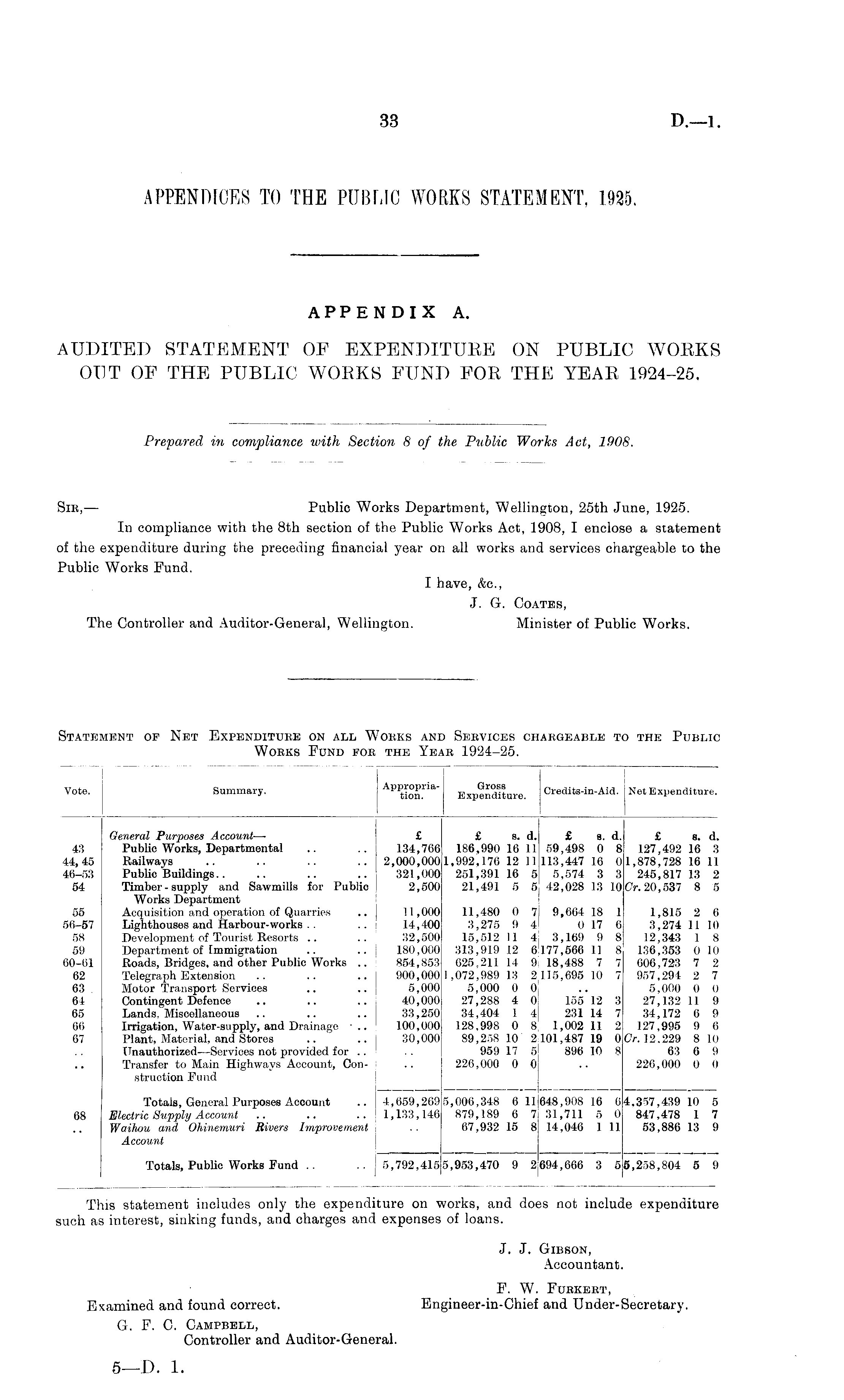 Sir, — Public Works Department, Wellington, 25th June, 1925. In compliance with the Bth section of the Public Works Act, 1908, I enclose a statement of the expenditure during the preceding financial year on all works and services chargeable to the Public Works Fund. I have, &c., J. G. Coates, The Controller and Auditor-General, Wellington. Minister of Public Works.