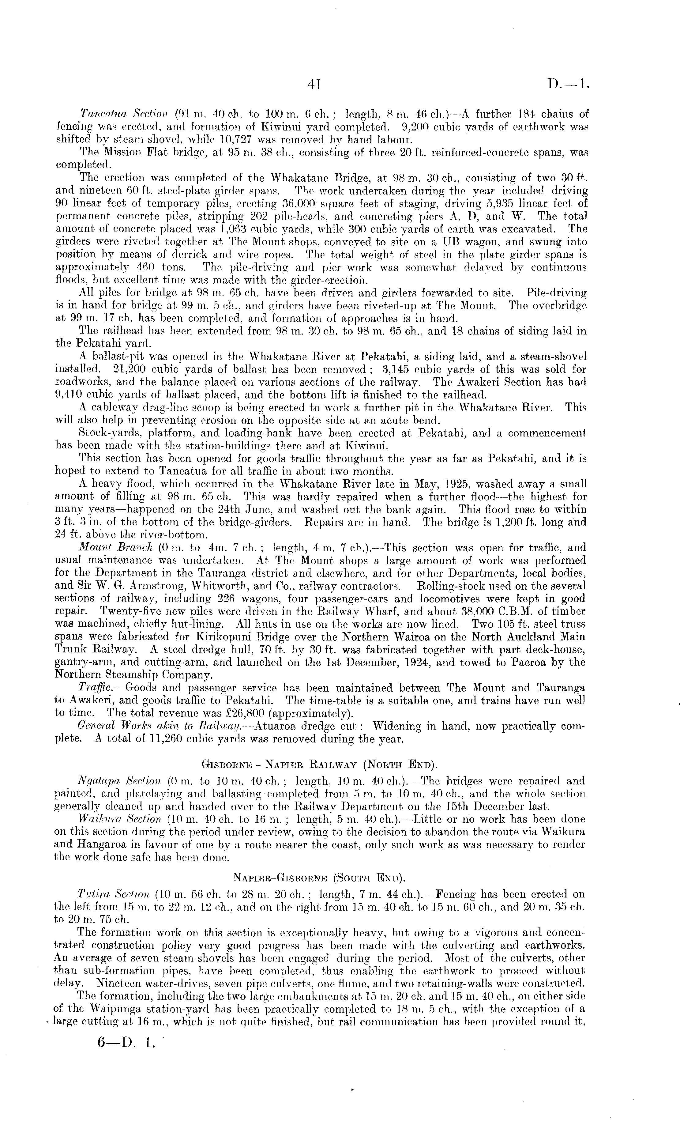 Taneat.ua Section (91 m. 40 oh, to 100 m. 6 ch.; length, 8 in. 46 ch.) —A further 184 chains of fencing was erected, and formation of Kiwinui yard completed. 9,200 cubic yards of earthwork was shifted by steam-shovel, while 10,727 was removed by hand labour. The Mission Flat bridge, at 95 m. 38 ch., consisting of three 20 ft. reinforced-concrete spans, was completed. The erection was completed of the Whakatane Bridge, at 98 m. 30 ch., consisting of two 30 ft.. and nineteen 60 ft. steel-plate girder spans. The work undertaken during the year included driving 90 linear feet of temporary piles, erecting 36,000 square feet of staging, driving 5,9-35 linear feet of permanent concrete piles, stripping 202 pile-heads, and concreting piers A, D, and W. The total amount of concrete placed was 1,063 cubic yards, while 300 cubic yards of earth was excavated. The girders were riveted together at The Mount shops, conveyed to site on a ITB wagon, and swung into position by means of derrick and wire ropes. The total weight of steel in the plate girder spans is approximately 460 tons. The pile-driving and pier-work was somewhat delayed by continuous floods, but excellent time was made with the girder-erection. All piles for bridge at 98 m. 65 ch. have been driven and girders forwarded to site. Pile-driving is in hand for bridge at 99 m. 5 ch., and girders have been riveted-up at The Mount. The overbridge at 99 m. 17 ch. has been completed, and. formation of approaches is in hand. The railhead has been extended from 98 m. 30 ch. to 98 m. 65 ch., and 18 chains of siding laid in the Pekatahi yard. A ballast-pit was opened in the Whakatane River at Pekatahi, a siding laid, and a steam-shovel installed. 21,200 cubic yards of ballast has been removed; 3,145 cubic yards of this was sold for roadworks, and the balance placed on various sections of the railway. The Awakeri Section has had 9,410 cubic yards of ballast placed, and the bottom lift is finished to the railhead. A cableway drag-line scoop is being erected to work a further pit in the Whakatane River. This will also help in preventing erosion on the opposite side at an acute bend. Stock-yards, platform, and loading-bank have been erected at Pekatahi, and a commencement has been made with the station-buildings there and at Kiwinui. This section has been opened for goods traffic throughout the year as far as Pekatahi, and it is hoped to extend to Taneatua for all traffic in about two months. A heavy flood, which occurred in the Whakatane River late in May, 1925, washed away a small amount of filling at 98 m. 65 ch. This was hardly repaired when a- further flood—the highest for many years—happened on the 24th June, and washed out the bank again. This flood rose to within 3 ft. 3 in. of the bottom of the bridge-girders. Repairs are in hand. The bridge is 1,200 ft. long and 24 ft. above the river-bottom. Mount Branch (0 m. to 4m. 7 eh. ; length, 4m. 7 ch.). —-This section was open for traffic, and usual maintenance was undertaken. At The Mount shops a large amount of work was performed for the Department in the Tauranga district and elsewhere, and for other Departments, local bodies, and Sir W. G. Armstrong, Whitworth, and Co., railway contractors. Rolling-stock used on the several sections of railway, including 226 wagons, four passenger-cars and locomotives were kept in good repair. Twenty-five new piles were driven in the Railway Wharf, and about 38,000 C.B.M. of timber was machined, chiefly hut-lining. All huts in use on the works are now lined. Two 105 ft. steel truss spans were fabricated for Kirikopuni Bridge over the Northern Wairoa on the North Auckland Main Trunk Railway. A steel dredge hull, 70 ft. by 30 ft. was fabricated together with part deck-house, gantry-arm, and cutting-arm, and launched on the Ist December, 1924, and towed to Paeroa by the Northern Steamship Company. Traffic. —Goods and passenger service has been maintained, between The Mount and Tauranga to Awakeri, and goods traffic to Pekatahi. The time-table is a suitable one, and trains have run well to time. The total revenue was £26,800 (approximately). General Works akin to Railway.—Atuaroa dredge cut: Widening in hand, now practically complete. A total of 11,260 cubic yards was removed during the year. Gisborne - Napier Railway (North End). Ngatapa Section (0 m. to 10 m. 40 ch. ; length, 10 m. 40 ch.). —The bridges were repaired and painted, and platelaying and ballasting completed from 5 m. to 10 m. 40 ch., and the whole section generally cleaned up and handed over to the Railway Department on the 15th December last. Waikura Section (10 m. 40 ch. to 16 m. ; length, sm. 40 ch.). —Little or no work has been done on this section during the period under review, owing to the decision to abandon the route via Waikura and Hangaroa in favour of one by a route nearer the coast, only such work as was necessary to render the work done safe has been done. Napier-Gisborne (South End). Tulira Section (10 m. 56 ch. to 28 ni. 20 ch. ; length, 7 m. 44 ch.).- Fencing has been erected on the left from 15 m. to 22 m. 12 ch., and on the right from 15 m. 40 ch. to 15 m. 60 ch., and 20 m. 35 ch. to 20 m. 75 ch. The formation work on this section is exceptionally heavy, but owing to a vigorous and concentrated construction policy very good progress has been made with the culverting and earthworks. An average of seven steam-shovels has been engaged during the period. Most of the culverts, other than sub-formation pipes, have been completed, thus enabling the earthwork to proceed without delay. Nineteen water-drives, seven pipe culverts, one flume, and two retaining-walls were constructed. The formation, including the two large embankments at 15 m. 20 ch. and 15 m. 40 ch., on either side of the Waipunga station-yard has been practically completed to 18 m. 5 ch., with the exception of a large cutting at 16 m., which is not quite finished, but rail communication has been provided round it,