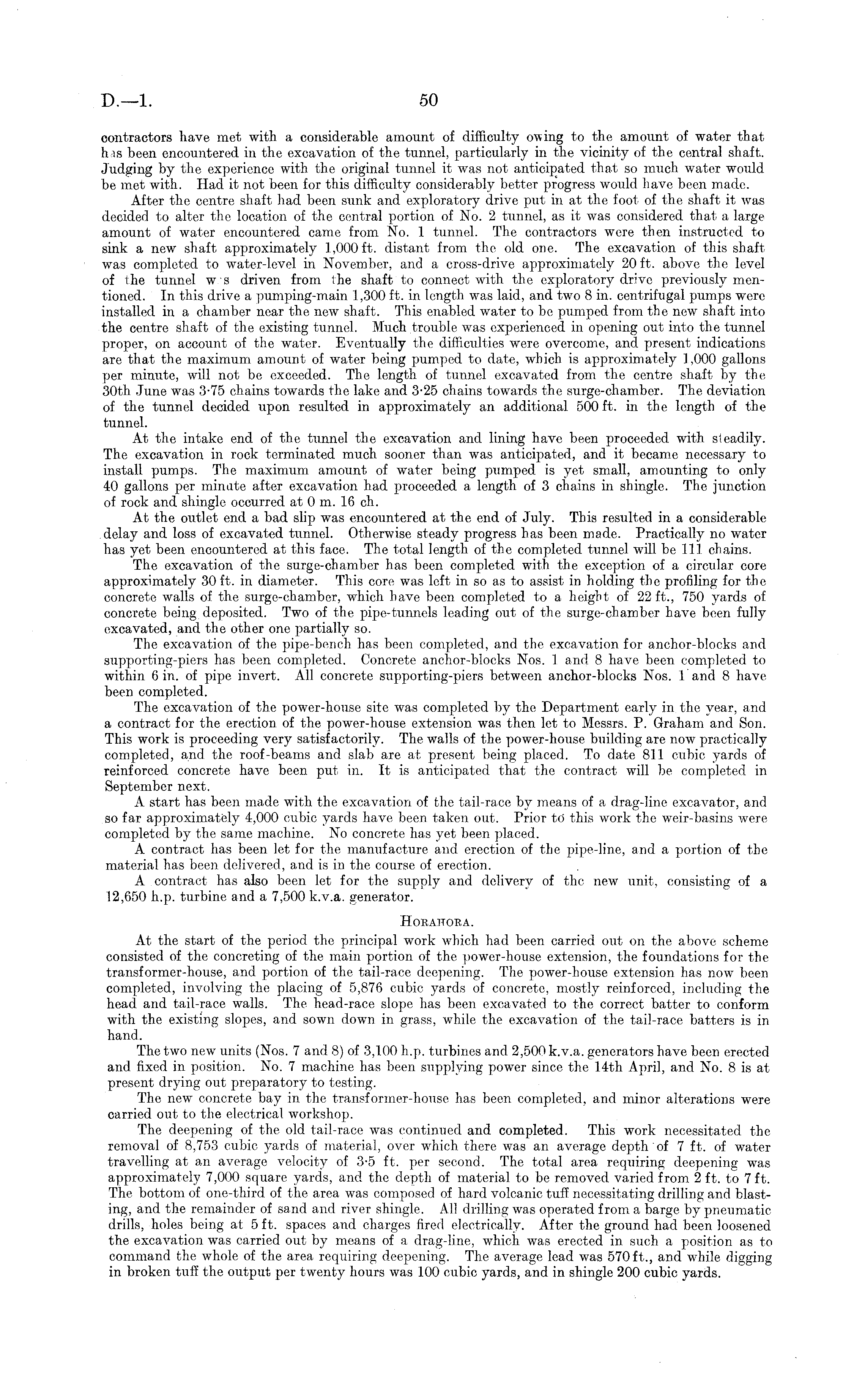 contractors have met with a considerable amount of difficulty owing to the amount of water that has been encountered in the excavation of the tunnel, particularly in the vicinity of the central shaft. Judging by the experience with the original tunnel it was not anticipated that so much water would be met with. Had it not been for this difficulty considerably better progress would have been made. After the centre shaft had been sunk and exploratory drive put in at the foot of the shaft it was decided to alter the location of the central portion of No. 2 tunnel, as it was considered that a large amount of water encountered came from No. 1 tunnel. The contractors were then instructed to sink a new shaft approximately 1,000 ft. distant from the old one. The excavation of this shaft was completed to water-level in November, and a cross-drive approximately 20 ft. above the level of the tunnel w.'s driven from the shaft to connect with the exploratory drive previously mentioned. In this drive a pumping-main 1,300 ft. in length was laid, and two 8 in. centrifugal pumps were installed in a chamber near the new shaft. This enabled water to be pumped from the new shaft into the centre shaft of the existing tunnel. Much trouble was experienced in opening out into the tunnel proper, on account of the water. Eventually the difficulties were overcome, and present indications are that the maximum amount of water being pumped to date, which is approximately 1,000 gallons per minute, will not be exceeded. The length of tunnel excavated from the centre shaft by the 30th June was 3-75 chains towards the lake and 3-25 chains towards the surge-chamber. The deviation of the tunnel decided upon resulted in approximately an additional 500 ft. in the length of the tunnel. At the intake end of the tunnel the excavation and lining have been proceeded with steadily. The excavation in rock terminated much sooner than was anticipated, and it became necessary to install pumps. The maximum amount of water being pumped is yet small, amounting to only 4-0 gallons per minate after excavation had proceeded a length of 3 chains in shingle. The junction of rock and shingle occurred at 0 m. 16 ch. At the outlet end a bad slip was encountered at the end of July. This resulted in a considerable delay and loss of excavated tunnel. Otherwise steady progress has been made. Practically no water has yet been encountered at this face. The total length of the completed tunnel will be 111 chains. The excavation of the surge-chamber has been completed with the exception of a circular core approximately 30 ft. in diameter. This core was left in so as to assist in holding the profiling for the concrete walls of the surge-chamber, which have been completed to a height of 22 ft., 750 yards of concrete being deposited. Two of the pipe-tunnels leading out of the surge-chamber have been fully excavated, and the other one partially so. The excavation of the pipe-bench has been completed, and the excavation for anchor-blocks and supporting-piers has been completed. Concrete anchor-blocks Nos. 1 and 8 have been completed to within 6 in. of pipe invert. All concrete supporting-piers between anchor-blocks Nos. 1 and 8 have been completed. The excavation of the power-house site was completed by the Department early in the year, and a contract for the erection of the power-house extension was then let to Messrs. P. Graham and Son. This work is proceeding very satisfactorily. The walls of the power-house building are now practically completed, and the roof-beams and slab are at present being placed. To date 811 cubic yards of reinforced concrete have been put in. It is anticipated that the contract will be completed in September next. A start has been made with the excavation of the tail-race by means of a drag-line excavator, and so far approximately 4,000 cubic yards have been taken out. Prior to' this work the weir-basins were completed by the same machine. No concrete has yet been placed. A contract has been let for the manufacture and erection of the pipe-line, and a portion of the material has been delivered, and is in the course of erection. A contract has also been let for the supply and delivery of the new unit, consisting of a 12,650 h.p. turbine and a 7,500 k.v.a. generator. Hobahora. At the start of the period the principal work which had been carried out on the above scheme consisted of the concreting of the main portion of the power-house extension, the foundations for the transformer-house, and portion of the tail-race deepening. The power-house extension has now been completed, involving the placing of 5,876 cubic yards of concrete, mostly reinforced, including the head and tail-race walls. The head-race slope has been excavated to the correct batter to conform with the existing slopes, and sown down in grass, while the excavation of the tail-race batters is in hand. The two new units (Nos. 7 and 8) of 3,100 h.p. turbines and 2,500 k.v.a. generators have been erected and fixed in position. No. 7 machine has been supplying power since the 14th April, and No. Bis at present drying out preparatory to testing. The new concrete bay in the transformer-house has been completed, and minor alterations were carried out to the electrical workshop. The deepening of the old tail-race was continued and completed. This work necessitated the removal of 8,753 cubic yards of material, over which there was an average depth of 7 ft. of water travelling at an average velocity of 3-5 ft. per second. The total area requiring deepening was approximately 7,000 square yards, and the depth of material to be removed varied from 2 ft. to 7 ft. The bottom of one-third of the area was composed of hard volcanic tuff necessitating drilling and blasting, and the remainder of sand and river shingle. All drilling was operated from a barge by pneumatic drills, holes being at 5 ft. spaces and charges fired electrically. After the ground had been loosened the excavation was