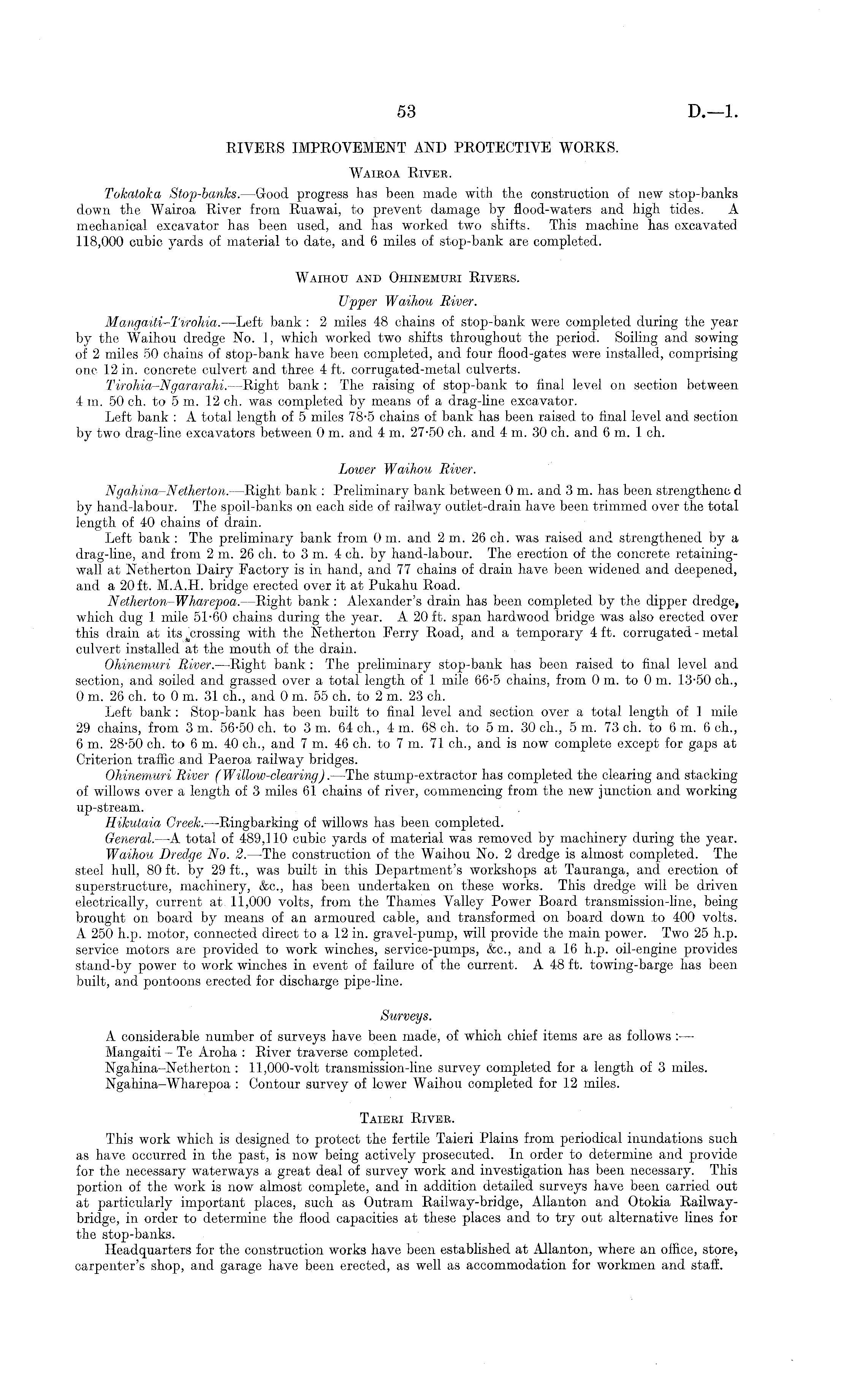 RIVERS IMPROVEMENT AND PROTECTIVE WORKS. Wairoa River. Tokatoka Stop-banks.—Good progress has been made with the construction of new stop-banks down the Wairoa River from Ruawai, to prevent damage by flood-waters and high tides. A mechanical excavator has been used, and has worked two shifts. This machine has excavated .118,000 cubic yards of material to date, and 6 miles of stop-bank are completed. Waihou and Ohinemuri Rivers. Upper Waihou River. Mangaiti-Tvrohia.—Left bank : 2 miles 48 chains of stop-bank were completed during the year by the Waihou dredge No. 1, which worked two shifts throughout the period. Soiling and sowing of 2 miles 50 chains of stop-bank have been completed, and four flood-gates were installed, comprising one 12 in. concrete culvert and three 4 ft. corrugated-metal culverts. Tirohia-Ngararahi. —Right bank : The raising of stop-bank to final level on section between 4 m. 50 ch. to 5 m. 12 ch. was completed by means of a drag-line excavator. Left bank : A total length of 5 miles 78-5 chains of bank has been raised to final level and section by two drag-line excavators between 0 m. and 4 m. 27-50 ch. and 4 m. 30 ch. and 6 m. 1 ch. Loiver Waihou River. Ngahina-Netherton.—Right bank : Preliminary bank between om. and 3 m. has been strengthenc d by hand-labour. The spoil-banks on each side of railway outlet-drain have been trimmed over the total length of 40 chains of drain. Left bank : The preliminary bank from om. and 2m. 26 ch. was raised and strengthened by a drag-line, and from 2m. 26 ch. to 3m. 4 ch. by hand-labour. The erection of the concrete retainingwall at Netherton Dairy Factory is in hand, and 77 chains of drain have been widened and deepened, and a 20 ft. M.A.H. bridge erected over it at Pukahu Road. Netherton^-Wharepoa. —Right bank : Alexander's drain has been completed by the dipper which dug ] mile 51-60 chains during the year. A2O ft. span hardwood bridge was also erected over this drain at with the Netherton Ferry Road, and a temporary 4 ft. corrugated - metal culvert installed at the mouth of the drain. Ohinemuri River. —Right bank : The preliminary stop-bank has been raised to final level and section, and soiled and grassed over a total length of 1 mile 66-5 chains, from 0 m. to 0 m. 13-50 ch., 0 m. 26 ch. to 0 m. 31 ch., and 0 m. 55 ch. to 2 m. 23 ch. Left bank : Stop-bank has been built to final, level and section over a total length of 1 mile 29 chains, from 3 m. 56-50 ch. to 3 m. 64 ch., 4 in. 68 ch. to 5 m. 30 ch., 5 m. 73 ch. to 6 m. 6 ch., 6 m. 28-50 ch. to 6 m. 40 ch., and 7 m. 46 ch. to 7 m. 71 ch., and is now complete except for gaps at Criterion traffic and Paeroa railway bridges. Ohinemuri River (Willow-clearing). —The stump-extractor has completed the clearing and stacking of willows over a length of 3 miles 61 chains of river, commencing from the new junction and working up-stream. Hikutaia Creek. —Ringbarking of willows has been completed. General.—A total of 489,110 cubic yards of material was removed by machinery during the year. Waihou Dredge No. 2. —The construction of the Waihou No. 2 dredge is almost completed. The steel hull, 80 ft. by 29 ft., was built in this Department's workshops at Tauranga, and erection of superstructure, machinery, &c., has been undertaken on these works. This dredge will be driven electrically, current at 11,000 volts, from the Thames Valley Power Board transmission-line, being brought on board by means of an armoured cable, and transformed on board down to 400 volts. A 250 h.p. motor, connected direct to al2 in. gravel-pump, will provide the main power. Two 25 h.p. service motors are provided to work winches, service-pumps, &c., and a 16 h.p. oil-engine provides stand-by power to work winches in event of failure of the current. A4B ft. towing-barge has been built, and pontoons erected for discharge pipe-line. Surveys. A considerable number of surveys have been made, of which chief items are as follows : — Mangaiti -Te Aroha : River traverse completed. Ngahina-Netherton : 11,000-volt transmission-line survey completed for a length of 3 miles. Ngahina-Wharepoa : Contour survey of lower Waihou completed for 12 miles. Taieri River. This work which is designed to protect the fertile Taieri Plains from periodical inundations such as have occurred in the past, is now being actively prosecuted. In order to determine and provide for the necessary waterways a great deal of survey work and investigation has been necessary. This portion of the work is now almost complete, and in addition detailed surveys have been carried out at particularly important places, such as Outram Railway-bridge, Allanton and Otokia Railwaybridge, in order to determine the flood capacities at these places and to try out alternative lines for the stop-banks. Headquarters for the construction works have been established at Allanton, where an office, store, carpenter's shop, and garage have been erected, as well as accommodation for workmen and staff.
