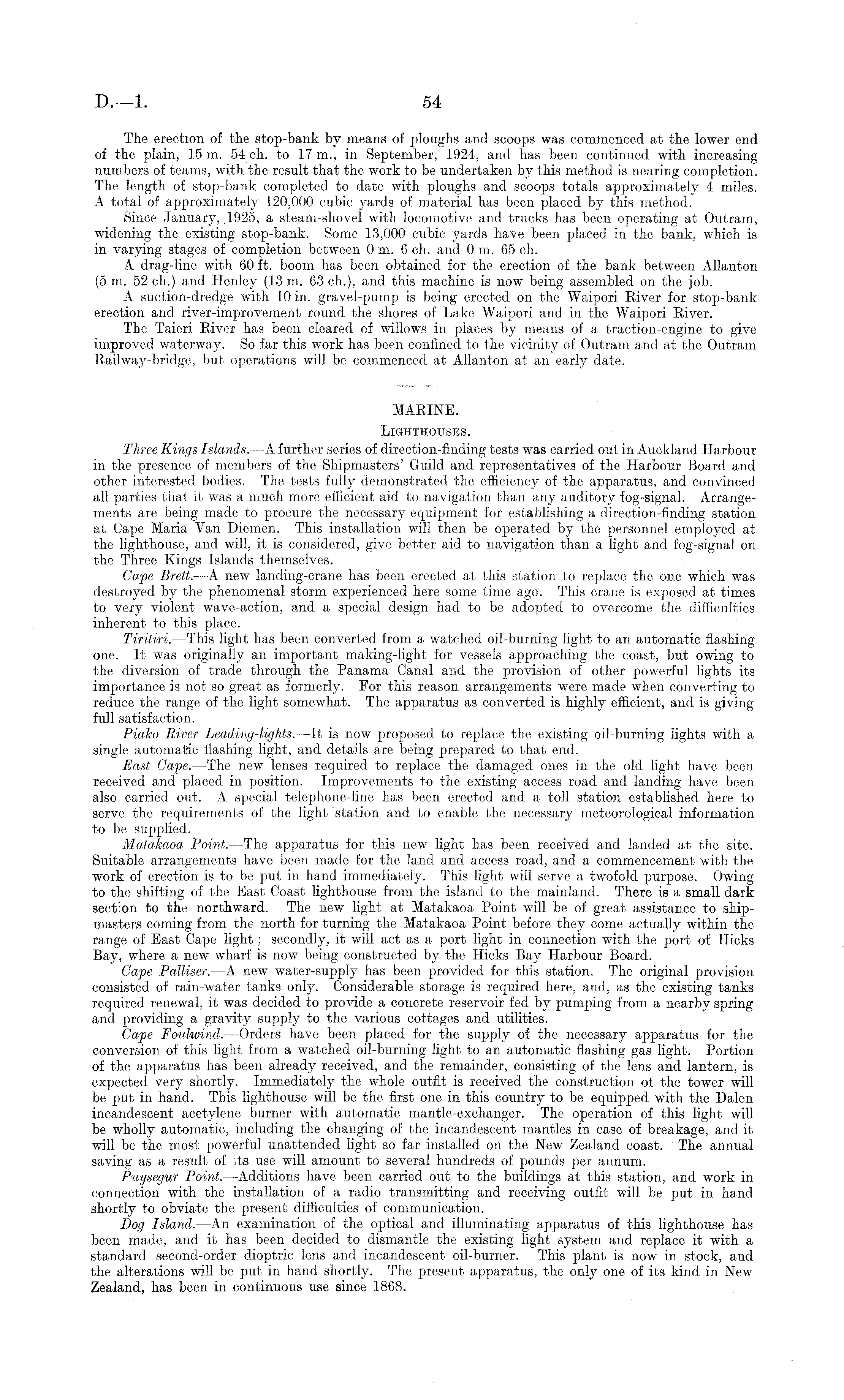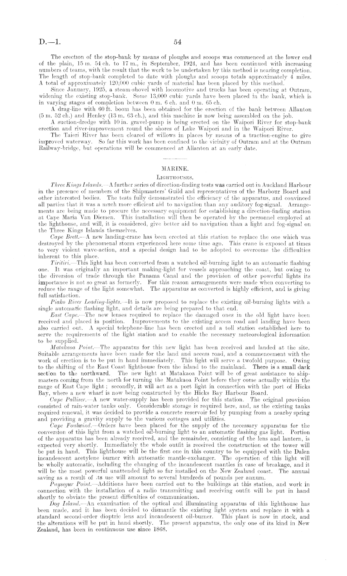 The erection of the stop-bank by means of ploughs and scoops was commenced at the lower end of the plain, 15 m. 54 ch. to 17 m., in September, 1924, and has been continued with increasing numbers of teams, with the result that the work to be undertaken by this method is nearing completion. The length of stop-bank completed to date with ploughs and scoops totals approximately 4 miles. A total of approximately 120,000 cubic yards of material has been placed by this method. Since January, .1925, a steam-shovel with locomotive and trucks has been operating at Outram, widening the existing stop-bank. Some 13,000 cubic yards have been placed in the bank, which is in varying stages of completion between 0 m. 6 ch. and 0 m. 65 ch. A drag-line with 60 ft. boom has been obtained for the erection of the bank between Allanton (5 m. 52 ch.) and Henley (13 m. 63 ch.), and this machine is now being assembled on the job. A suction-dredge with 10 in. gravel-pump is being erected on the Waipori River for stop-bank erection and river-improvement round the shores of Lake Waipori and in the Waipori River. The Taieri River has been cleared of willows in places by means of a traction-engine to give improved waterway. So far this work has been confined to the vicinity of Outram and at the Outram Railway-bridge, but operations will be commenced at Allanton at an early date. MARINE. Lighthouses. Three Kings Islands. —A further series of direction-finding tests was carried out in Auckland Harbour in the presence of members of the Shipmasters' Guild and representatives of the Harbour Board and other interested bodies. The tests fully demonstrated the efficiency of the apparatus, and convinced all parties that it was a much more efficient aid to navigation than any auditory fog-signal. Arrangements are being made to procure the necessary equipment for establishing a direction-finding station at Cape Maria Van Diemen. This installation will then be operated by the personnel employed at the lighthouse, and will, it is considered, give better aid to navigation than a light and fog-signal on the Three Kings Islands themselves. Cape Brett. —A new landing-crane has been erected at this station to replace the one which was destroyed by the phenomenal storm experienced here some time ago. This crane is exposed at times to very violent wave-action, and a special design had to be adopted to overcome the difficulties inherent to this place. Tiritiri. —This light has been converted from a watched oil-burning light to an automatic flashing one. It was originally an important making-light for vessels approaching the coast, but owing to the diversion of trade through the Panama Canal and the provision of other powerful lights its importance is not so great as formerly. For this reason arrangements were made when converting to reduce the range of the light somewhat. The apparatus as converted is highly efficient, and is giving full satisfaction. Piako River Leading-lights.—lt is now proposed to replace the existing oil-burning lights with a single automatic flashing light, and details are being prepared to that end. East Cape. —The new lenses required to replace the damaged ones in the old light have been received and placed in position. Improvements to the existing access road and landing have been also carried out. A special telephone-line has been erected and a toll station established here to serve the requirements of the light station and to enable the necessary meteorological information to be supplied. Matakaoa Point.—The apparatus for this new light has been received and landed at the site. Suitable arrangements have been made for the land and access road, and a commencement with the work of erection is to be put in hand immediately. This light will serve a twofold purpose. Owing to the shifting of the East Coast lighthouse from the island to the mainland. There is a small dark section to the northward. The new light at Matakaoa Point will be of great assistance to shipmasters coming from the north for turning the Matakaoa Point before they come actually within the range of East Cape light; secondly, it will act as a port light in connection with the port of Hicks Bay, where a new wharf is now being constructed by the Hicks Bay Harbour Board. Cape Palliser.—A new water-supply has been provided for this station. The original provision consisted of rain-water tanks only. Considerable storage is required here, and, as the existing tanks required renewal, it was decided to provide a concrete reservoir fed by pumping from a nearby spring and providing a gravity supply to the various cottages and utilities. Cape Foul/wind. —Orders have been placed for the supply of the necessary apparatus for the conversion of this light from a watched oil-burning light to an automatic flashing gas light. Portion of the apparatus has been already received, and the remainder, consisting of the lens and lantern, is expected very shortly. Immediately the whole outfit is received the construction ot the tower will be put in hand. This lighthouse will be the first one in this country to be equipped with the Dalen incandescent acetylene burner with automatic mantle-exchanger. The operation of this light will be wholly automatic, including the changing of the incandescent mantles in case of breakage, and it will be the most powerful unattended light so far installed on the New Zealand coast. The annual saving as a result of ,ts use will amount to several hundreds of pounds per annum. Puysegur Point. —Additions have been carried out to the buildings at this station, and work in connection with the installation of a radio transmitting and receiving outfit will be put in hand shortly to obviate the present difficulties of communication. Dog Island. —An examination of the optical and illuminating apparatus of this lighthouse has been made, and it has been decided to dismantle the existing light system and replace it with a standard secon