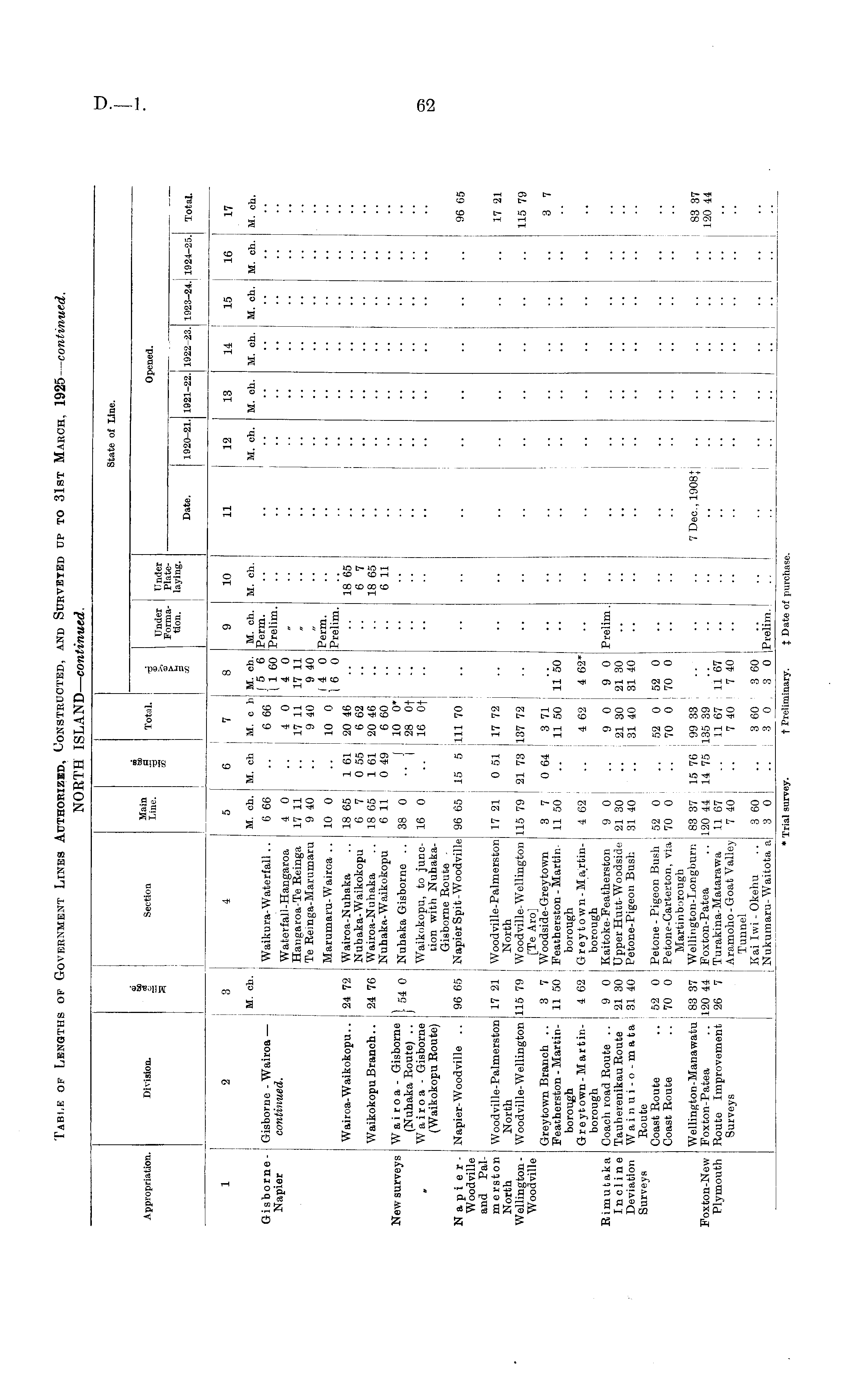 Table of Lengths of Government Lines Authorized, Constructed, and Surveyed up to 31st March, 1925— continued. NORTH ISLAND— continued.