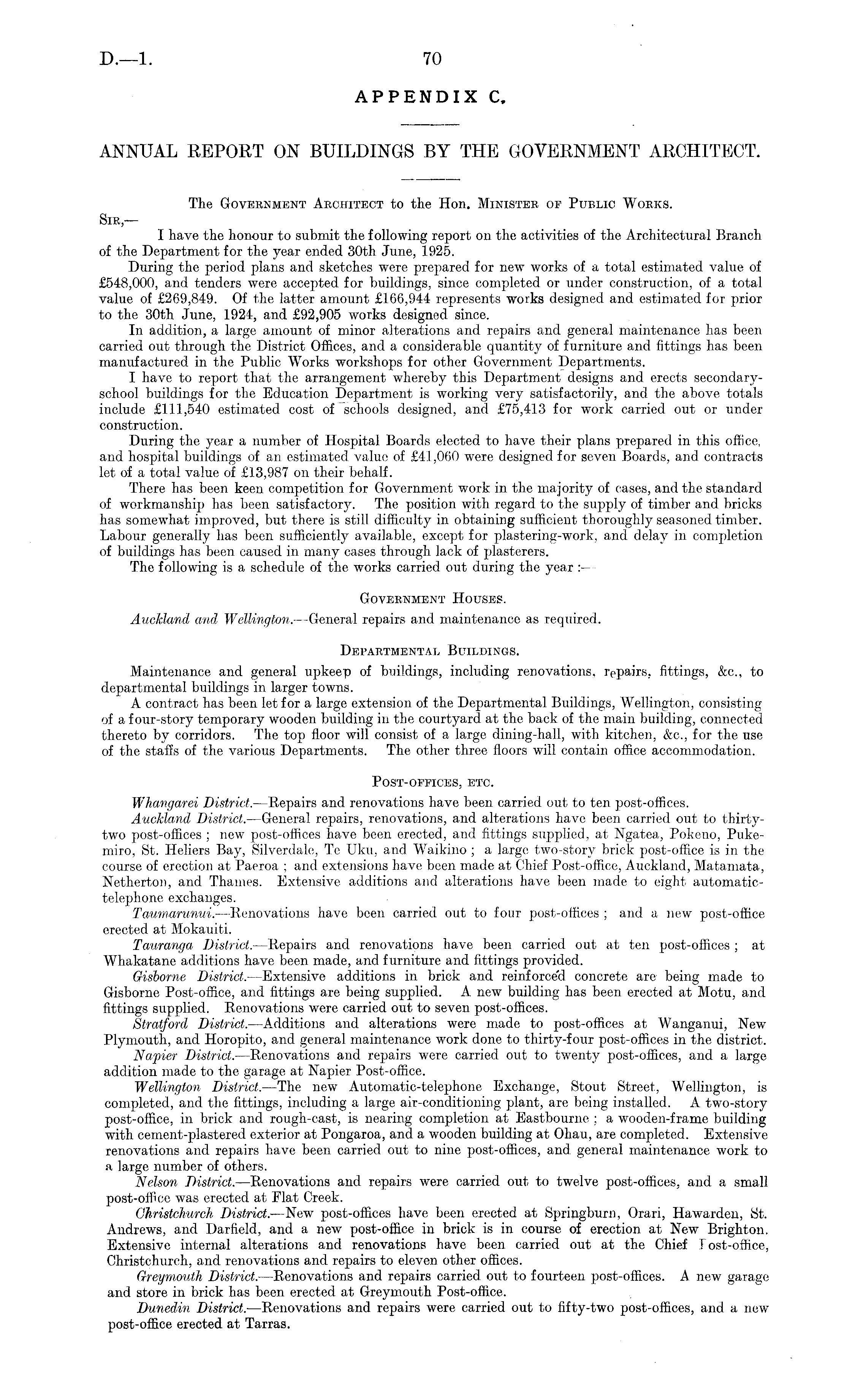 APPENDIX C, ANNUAL REPORT ON BUILDINGS BY THE GOVERNMENT ARCHITECT. The Government Architect to the Hon. Minister of Public Works. Sir, — I have the honour to submit the following report on the activities of the Architectural Branch of the Department for the year ended 30th June, 1925. During the period plans and sketches were prepared for new works of a total estimated value of £548,000, and tenders were accepted for buildings, since completed or under construction, of a total value of £269,849. Of the latter amount £166,944 represents works designed and estimated for prior to the 30th June, 1924, and £92,905 works designed since. In addition, a large amount of minor alterations and repairs and general maintenance has been carried out through the District Offices, and a considerable quantity of furniture and fittings has been manufactured in the Public Works workshops for other Government Departments. I have to report that the arrangement whereby this Department designs and erects secondaryschool buildings for the Education Department is working very satisfactorily, and the above totals include £111,540 estimated cost of schools designed, and £75,413 for work carried out or under construction. During the year a number of Hospital Boards elected to have their plans prepared in this office, and hospital buildings of an estimated value of £41,060 were designed for seven Boards, and contracts let of a total value of £13,987 on their behalf. There has been keen competition for Government work in the majority of cases, and the standard of workmanship has been satisfactory. The position with regard to the supply of timber and bricks has somewhat improved, but there is still difficulty in obtaining sufficient thoroughly seasoned timber. Labour generally has been sufficiently available, except for plastering-work, and delay in completion of buildings has been caused in many cases through lack of plasterers. The following is a schedule of the works carried out during the year Government Houses. Auckland and Wellington.—General repairs and maintenance as required. Departmental Buildings. Maintenance and general upkeep of buildings, including renovations, repairs, fittings, &c., to departmental buildings in larger towns. A contract has been let for a large extension of the Departmental Buildings, Wellington, consisting of a four-story temporary wooden building in the courtyard at the back of the main building, connected thereto by corridors. The top floor will consist of a large dining-hall, with kitchen, &c., for the use of the staffs of the various Departments. The other three floors will contain office accommodation. Post-offices, etc. Whangarei District. —Repairs and renovations have been carried out to ten post-offices. Auckland District. —General repairs, renovations, and alterations have been carried out to thirtytwo post-offices ; new post-offices have been erected, and fittings supplied, at Ngatea, Pokeno, Pukemiro, St. Heliers Bay, Silverdale, To Uku, and Waikino ; a large two-story brick post-office is in the course of erection at Paeroa ; and extensions have been made at Chief Post-office, Auckland, Matamata, Netherton, and Thames. Extensive additions and alterations have been made to eight automatictelephone exchanges. Taumarunui. —Renovations have been carried out to four post-offices ; and a new post-office erected at Mokauiti. Tauranga District. —Repairs and renovations have been carried out at ten post-offices ; at Whakatane additions have been made, and furniture and fittings provided. Gisborne District. —Extensive additions in brick and reinforce'd concrete are being made to Gisborne Post-office, and fittings are being supplied. A new building has been erected at Motu, and fittings supplied. Renovations were carried out to seven post-offices. Stratford District. —Additions and alterations were made to post-offices at Wanganui, New Plymouth, and Horopito, and general maintenance work done to thirty-four post-offices in the district. Napier District. —Renovations and repairs were carried out to twenty post-offices, and a large addition made to the garage at Napier Post-office. Wellington District. —The new Automatic-telephone Exchange, Stout Street, Wellington, is completed, and the fittings, including a large air-conditioning plant, are being installed. A two-story post-office, in brick and rough-cast, is nearing completion at Eastbourne ; a wooden-frame building with cement-plastered exterior at Pongaroa, and a wooden building at Ohau, are completed. Extensive renovations and repairs have been carried out to nine post-offices, and. general maintenance work to a large number of others. Nelson District.—Renovations and repairs were carried out to twelve post-offices, and a small post-office was erected at Flat Creek. Ohristchurch District.—New post-offices have been erected at Sprijigburn, Orari, Hawarden, St. Andrews, and Darfield, and a new post-office in brick is in course of erection at New Brighton. Extensive internal alterations and renovations have been carried out at the Chief I ost-office, Christchurch, and renovations and repairs to eleven other offices. Greymouth District. —Renovations and repairs carried out to fourteen post-offices. A new garage and store in brick has been erected at Greymouth Post-office. Dunedin District. —Renovations and repairs were carried out to fifty-two post-offices, and a new post-office erected at Tarras.