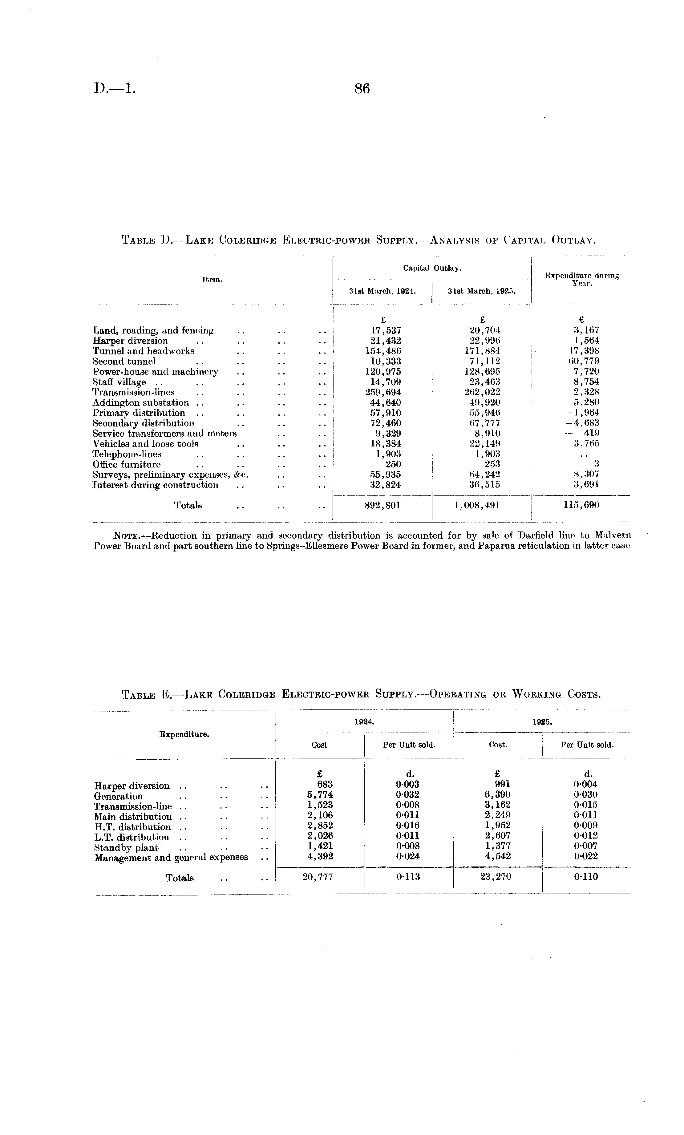 Table E.—Lake Coleridge Electric-power Supply.—Operating or Working Costs.
