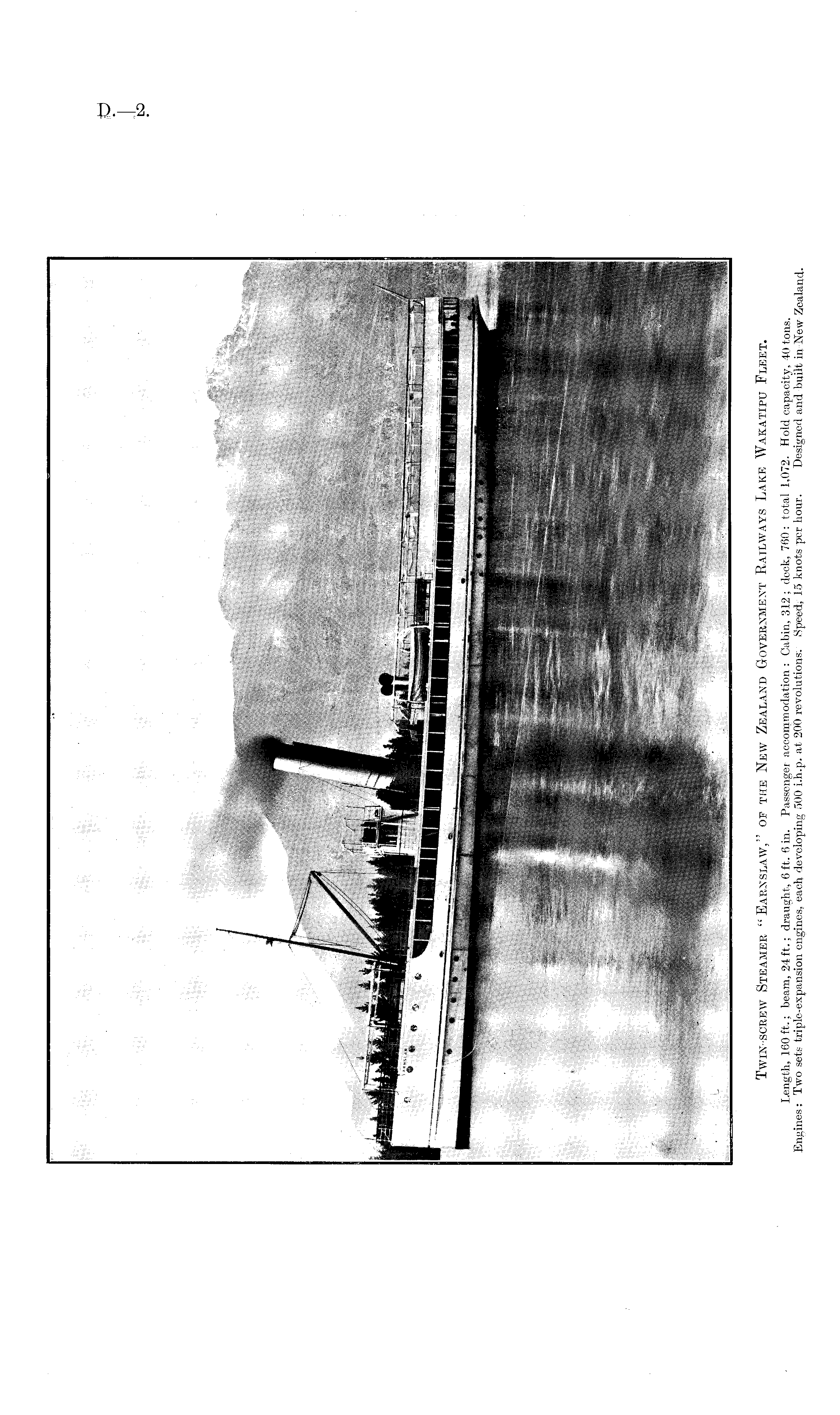 Length, 160 ft.; beam, 24 ft.; draught, 6 ft. 6 in. Passenger accommodation: Cabin, 312; deck, 760: total 1,072. Hold capacity, 40 tons. Engines: Two sets triple-expansion engines, each developing 500 i.h.p. at 200 revolutions:" .Speed, 15 knots per hour. Designed and built in New Zealand.