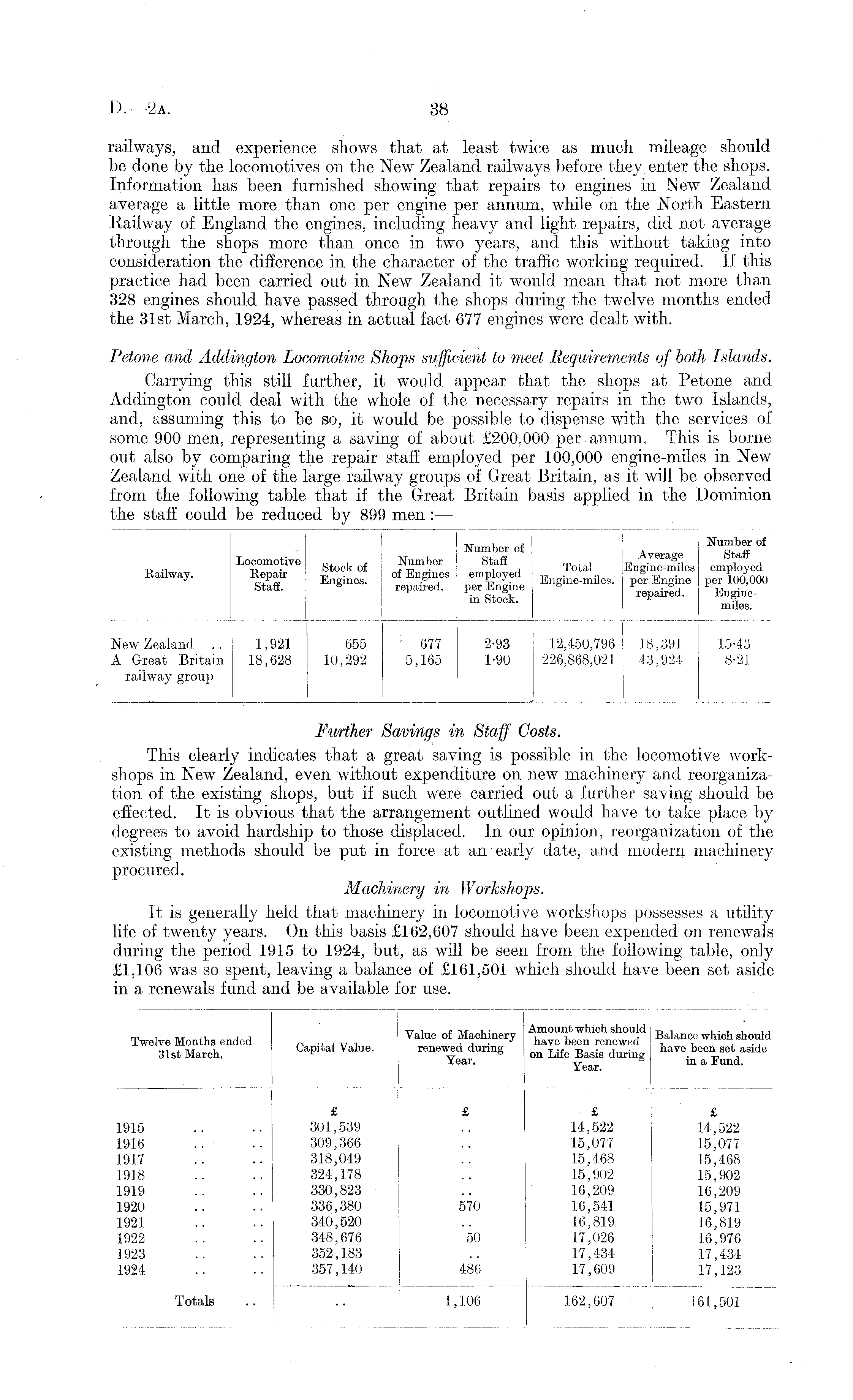 Further Savings in Staff Costs. This clearly indicates that a great saving is possible in the locomotive workshops in New Zealand, even without expenditure on new machinery and reorganization of the existing shops, but if such were carried out a further saving should be effected. It is obvious that the arrangement outlined would have to take place by degrees to avoid hardship to those displaced. In our opinion, reorganization of the existing methods should be put in force at an early date, and modern machinery procured. Machinery in Workshops. It is generally held that machinery in locomotive workshops possesses a utility life of twenty years. On this basis £162,607 should have been expended on renewals during the period 1915 to 1924, but, as will be seen from the following table, only £1,106 was so spent, leaving a balance of £161,501 which should have been set aside in a renewals fund and be available for use.