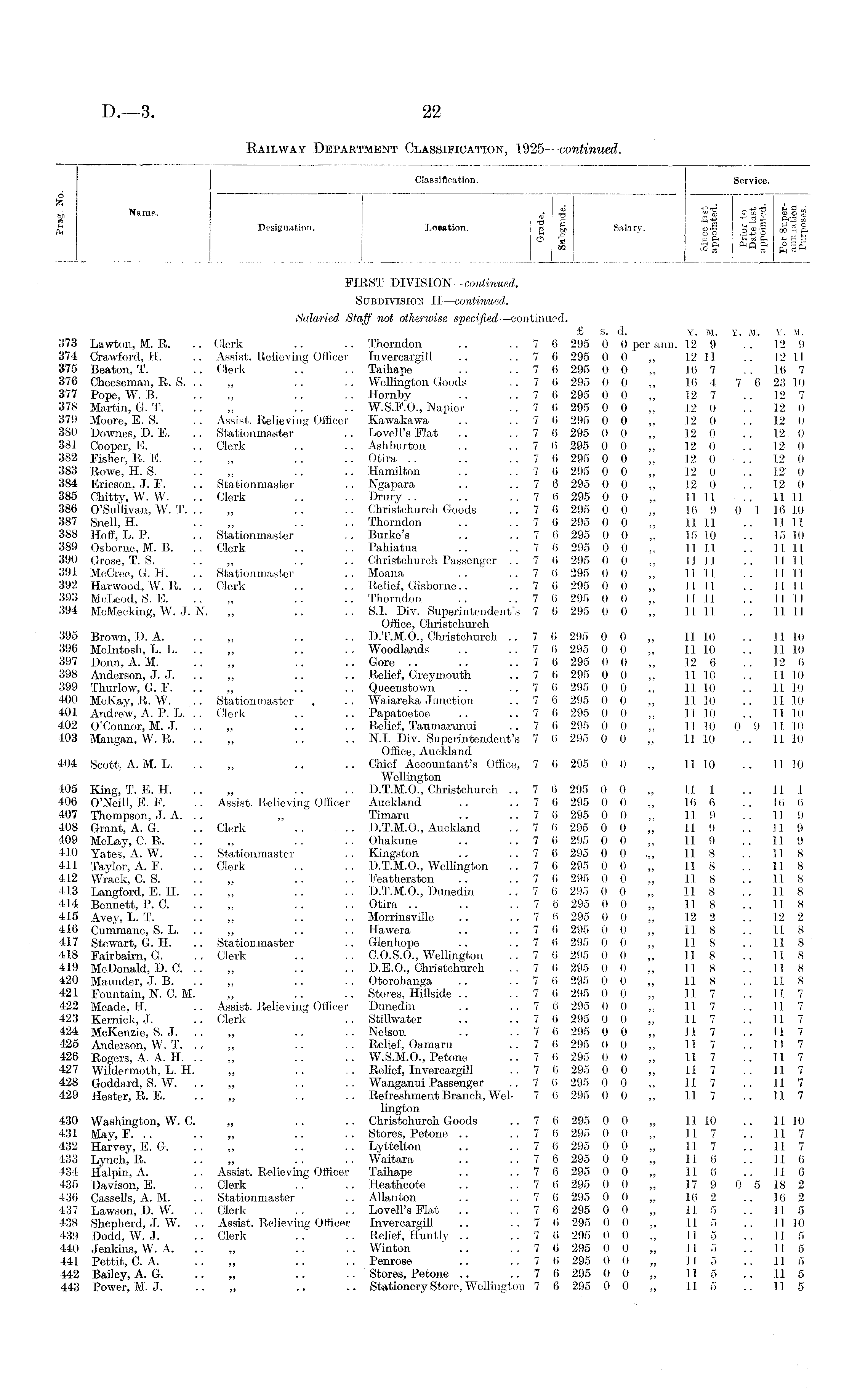 Classification. Scrvice. o : ■ g Name - ® •! IS °1S l-jl £ Designation. Loeatwn. g g> Salary. g-§ g®-§ ®t§ B, IE S °< fl ft r° 2 £ |® ei M rt fesW FIRST DIVISION—continued. Subdivision II—continued. Salaried Staff not otherwise specified—continued. £ s. d. y. M. Y. M. Y. M. 373 Lawton, M. R. .. Clerk .. .. Thorndon .. ..7 6 295 0 0 per ann. 12 9 .. 129 374 Crawford, H. .. Assist. Relieving Officer Invercargill .. ..7 6 295 0 0 „ 12 11 .. 12 11 375 Beaton, T. .. Clerk .. .. Taihape ■. ..7 6 295 0 0 „ 16 7 .. 16 7 376 Cheeseman, R. S. .. „ .. .. Wellington Goods ..7 6 295 0 0 ,, 16 4 7 6 23 10 377 Pope, W. B. .. „ .. .. Hornby .. .. 7 6 295 0 0 „ 12 7 .. 12 7 378 Martin, G. T. .. .. .. W.S.F.O., Napier .. 7 6 295 0 0 ,, 12 0 .. 12 0 379 Moore, E. S. .. Assist. Relieving Officer Kawakawa .. ..7 6 295 0 0 ,, 12 0 .. 12 0 380 Downes, D. E. .. Stationmaster .. Lovell's Flat .. ..7 6 295 0 0 „ 120 .. 12 0 381 Cooper, E. .. Clerk .. .. Ashburton .. ..7 6 295 0 0 „ 12 0 .. 12 0 382 Fisher, R. E. .. ,, .. .. Otira .. .. ..7 6 295 0 0 „ 12 0 .. 12 0 383 Rowe, H. S. .. „ .. .. Hamilton .. ..7 6 295 0 0 „ 12 0 .. 12 0 384 Ericson, J. F. .. Stationmaster .. Ngapara .. ..7 6 295 0 0 ,, 12 0 .. 12 0 385 Chitty, W. W. .. Clerk .. .. Drury .. .. ..7 6 295 0 0 ,, 11 11 .. 11 11 386 O'Sullivan, W. T. .. „ .. .. Christchurch Goods .. 7 6 295 0 0 „ 16 9 0 1 16 10 387 Snell, H. .. .. .. Thorndon .. .. 7 6 295 0 0 „ 11 11 .. 11 11 388 Hofi, L. P. .. Stationmaster .. Burke's .. ..7 6 295 0 0 „ 15 10 .. 15 10 389 Osborne, M. B. .. Clerk .. .. Pahiatua .. ..7 6 295 0 0 „ 11 11 .. 11. 11 390 Grose, T. S. .. „ .. .. Christchurch Passenger .. 7 6 295 0 0 „ 11 11 .. 11 11 391 McCree, G. II. .. Stationmaster .. Moana .. ..7 6 295 0 0 „ 11 11 .. 11 11 392 Harwood, W. R. .. Clerk .. .. Relief, Gisborne.. .. 7 6 295 00 ,, 1111 .. 1111 393 Mcleod, S. E. .. „ .. .. Thorndon .. .. 7 6 295 0 0 „ 11 11 .. 11 11 394 McMecking, W. J. N. „ .. .. S.I. Div. Superintendent's 7 6 295 0 0 „ 11 11 .. 11 11 Office, Christchurch 395 Brown, D. A. .. „ .. .. D.T.M.O., Christchurch .. 7 6 295 0 0 „ 11 10 .. 11 10 396 Mcintosh, L. L. .. „ .. .. Woodlands .. ..7 6 295 0 0 „ 11 10 .. 11 10 397 Donn, A. M. .. „ .. .. Gore .. .. .. 7 6 295 0 0 12 6 12 6 398 Anderson, J. J. .. ,, .. .. Relief, Greymouth .. 7 6 295 0 0 „ 11 10 .. 11 10 399 Thurlow, G. F .. .. Queenstown .. ..7 6 295 0 0 ,, 11 10 .. 11 10 4.00 McKay, R. W. .. Stationmaster . .. Waiareka Junction .. 7 6 295 0 0 „ 11 10 .. 11 10 401 Andrew, A. P. L. .. Clerk .. .. Papatoetoe .. ..7 6 295 0 0 ,, 11 10 .. 11 10 402 O'Connor, M. J. .. „ .. .. Relief, Taumarunui .. 7 6 295 0 0 „ 11 10 0 9 11 10 403 Mangan, W. R. .. „ .. .. N.l. Div. Superintendent's 7 6 295 0 0 „ 11 10 .. 11 10 Office, Auckland 404 Scott, A. M. L. .. „ .. .. Chief Accountant's Office, 7 6 295 0 0 „ 11 10 .. 11 10 Wellington 405 King, T. E. H. „ .. .. D.T.M.O., Christchurch .. 7 6 295 0 0 „ 11 1 .. 11 1 406 O'Neill, E. F. .. Assist. Relieving Officer Auckland .. ..7 6 295 0 0 ,, 16 6 .. 16 6 407 Thompson, J. A. .. „ Timaru .. .. 7 6 295 0 0 „ 11 9 .. 11 9 408 Grant, A. G. .. Clerk .. .. D.T.M.O., Auckland .. 7 6 295 0 0 „ 11 9 .. 11 9 409 McLay, C. R. .. .. .. Ohakune .. .. 7 6 295 0 0 „ 11 9 .. 11 9 410 Yates, A. W. .. Stationmaster .. Kingston .. ..7 6 295 0 0,,, 11 8 .. 11 8 411 Taylor, A. F. .. Clerk .. .. D.T.M.O., Wellington .. 7 6 295 0 0 „ 11 8 .. 11 8 412 Wrack, C. S. .. „ .. .. Featherston .. ..7 6 295 0 0 „ 11 8 .. 11 8 413 Langford, E. H. .. „ .. .. D.T.M.O., Dunedin .. 7 6 295 0 0 „ 11 8 .. 11 8 414 Bennett, P. C. „ .. Otira .. .. .. 7 6 295 0 0 11 8 11 8 415 Avey, L. T. .. „ .. .. Morrinsville .. ..7 6 295 0 0 ,, 12 2 .. 12 2 416 Cummane, S. L. .. „ .. .. Hawera .. ..7 6 295 0 0 „ 11 8 .. 11 8 417 Stewart, G. II. .. Stationmaster .. Glenhope .. ..7 6 295 0 0 „ 11 8 .. 11 8 418 Fairbairn, G. .. Clerk .. .. C.O.S.O., Wellington .. 7 6 295 0 0 „ 11 8 .. 11 8 419 McDonald, D. C. „ .. .. D.E.O., Christchurch .. 7 6 295 0 0 „ 11 8 .. 11 8 420 Maunder, J. B .. .. Otorohanga .. ..7 6 295 00 „ 118 .. 118 421 Fountain, N. C. M. ,, .. .. Stores, Hillside .. ..7 6 295 0 0 ,, 11 7 .. 11 7 422 Meade, H. .. Assist. Relieving Officer Dunedin .. ..7 6 295 00 „ 117 .. 117 423 Kernick, J. .. Clerk .. Stillwater .. .. 7 6 295 0 0 „ 11 7 .. 11 7 424 McKenzie, S. J .. .. Nelson .. .. 7 6 295 0 0 „ 11 7 .. 11 7 425 Anderson, W. T. .. „ .. .. Relief, Oamaru .. 7 6 295 0 0 „ 11 7 .. 11 7 426 Rogers, A. A. H. .. „ .. .. W.S.M.O., Petone .. 7 6 295 0 0 „ 11 7 .. 11 7 427 Wildermoth, L. H. „ .. .. Relief, Invercargill .. 7 6 295 0 0 „ 11 7 .. 11 7 428 Goddard, S. W. „ .. .. Wanganui Passenger .. 7 6 295 00 „ 117 .. 117 429 Hester, R. E. .. „ .. .. Refreshment Branch, Wei- 7 6 295 00 „ 117 .. 11 7 lington 430 Washington, W. C. „ .. .. Christchurch Goods .. 7 6 295 0 0 ,, 11 10 .. 11 10 431 May, F. .. .. „ .. .. Stores, Petone .. ..7 6 295 0 0 „ 11 7 .. 11 7 432 Harvey, E. G. .. .. .. Lyttelton .. .. 7 6 295 0 0 „ 11 7 .. 11 7 433 Lynch, R. .. „ .. .. Waitara .. ..7 6 295 0 0 „ 11 6 .. 11 6 434 Halpin, A. . . Assist. Relieving Officer Taihape .. .. 76295 00 „ 116 .. 116 435 Davison, E. .. Clerk .. .. Heathcote .. .. 7 6 295 0 0 „ 17 9 0 5 18 2 436 Cassells, A. M. .. Stationmaster .. AUanton .. ..7 6 295 0 0 „ 16 2 .. 16 2 437 Lawson, D. W. .. Clerk . . . . Lovell's Flat .. ..7 6 295 0 0 ,, 11 5 .. 11 5 438 Shepherd, J. W. .. Assist. Relieving Officer Invercargill .. ..7 6 295 0 0 ,, 11 5 .. 11 10 439 Dodd, W. J. .. Clerk .. . . Relief, Huntly .. .. 7 6 295 0 0 „ 115 .. 115 440 Jenkins, W. A. .. „ .. .. Winton .. ..7 6 295 0 0 „ 11 5 .. 11 5 441 Pettit, C. A. .. „ .. .. Penrose .. ..7 6 295 00 „ 115 .. 115 442 Bailey, A. G. .. „ .. .. Stores, Petone .. -.7 6 295 0 0 „ 11 5 11 5 443 Power, M. J. .. „ .. .. Stationery Store, Wellington 7 6 295 00 